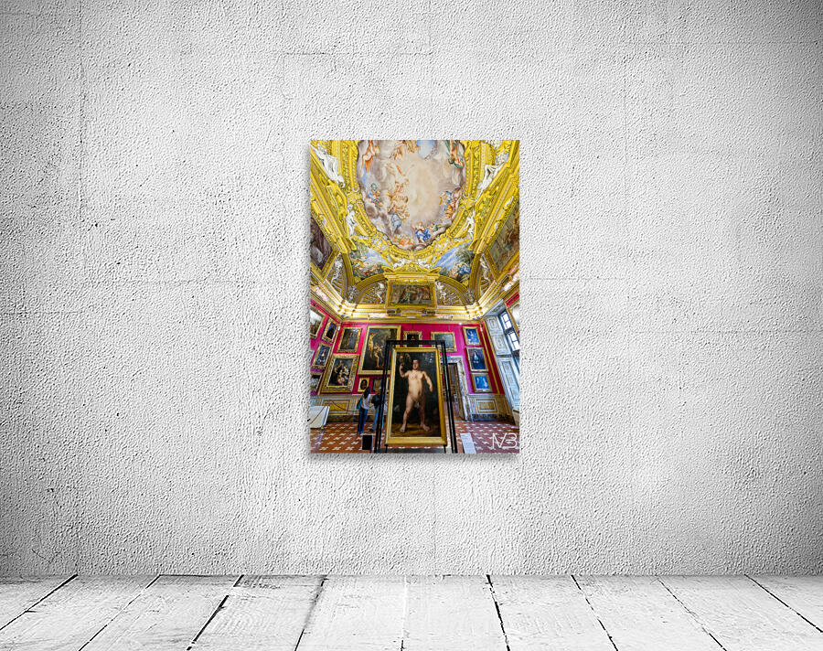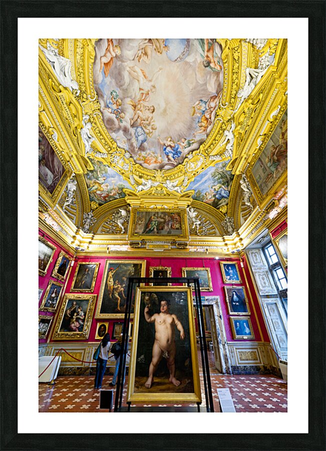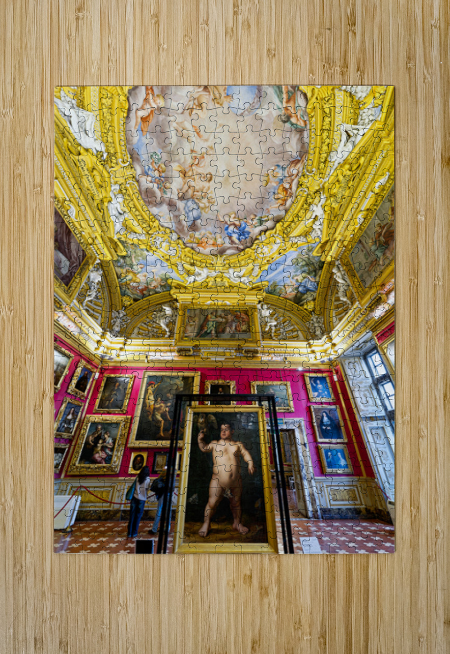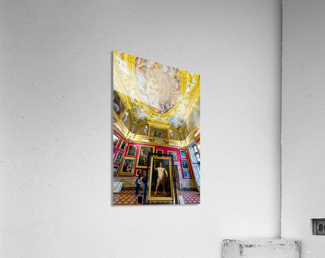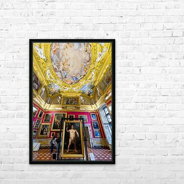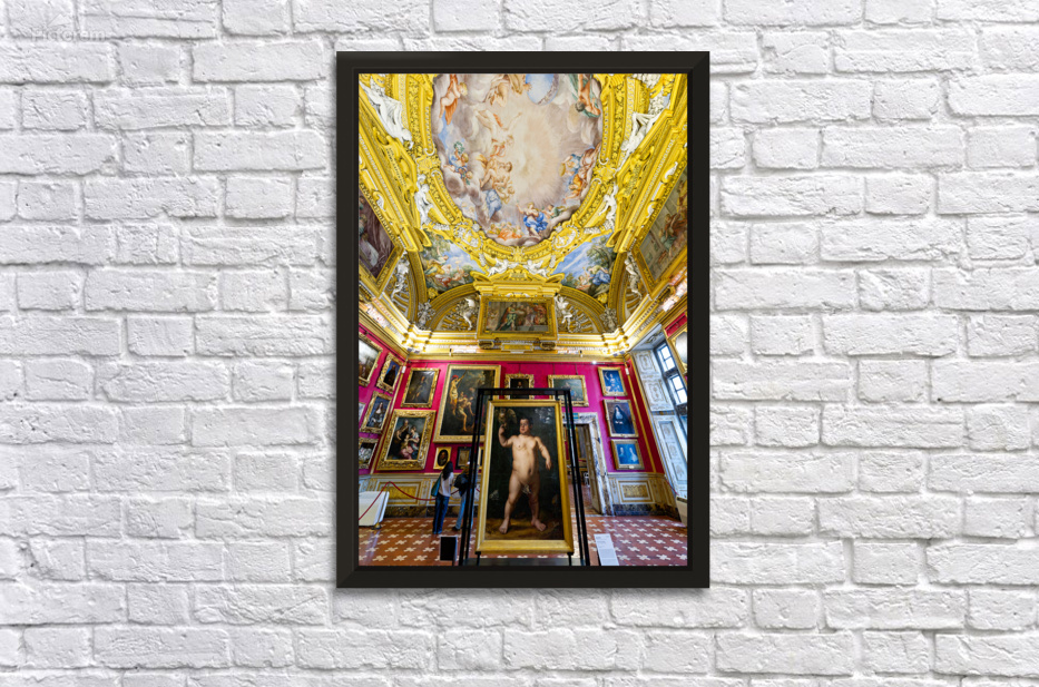People explore the Palatine Gallery in Palazzo Pitti observing the artwork by Bronzino. The gallery features colorful walls and ornate ceilings.