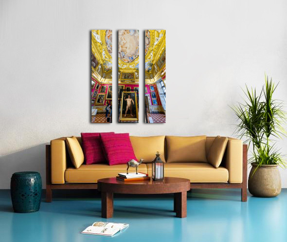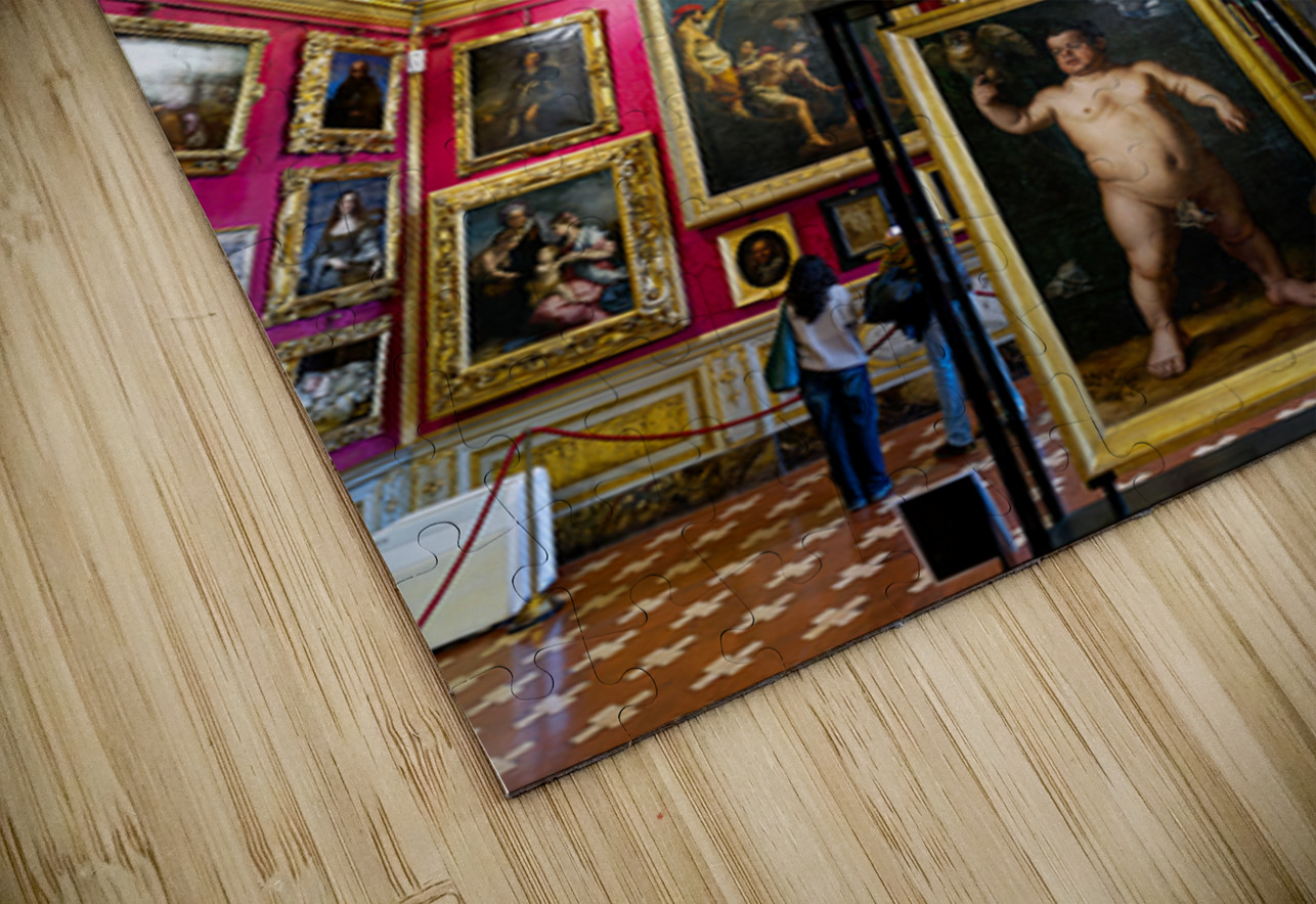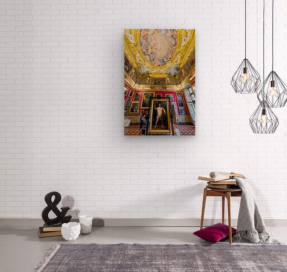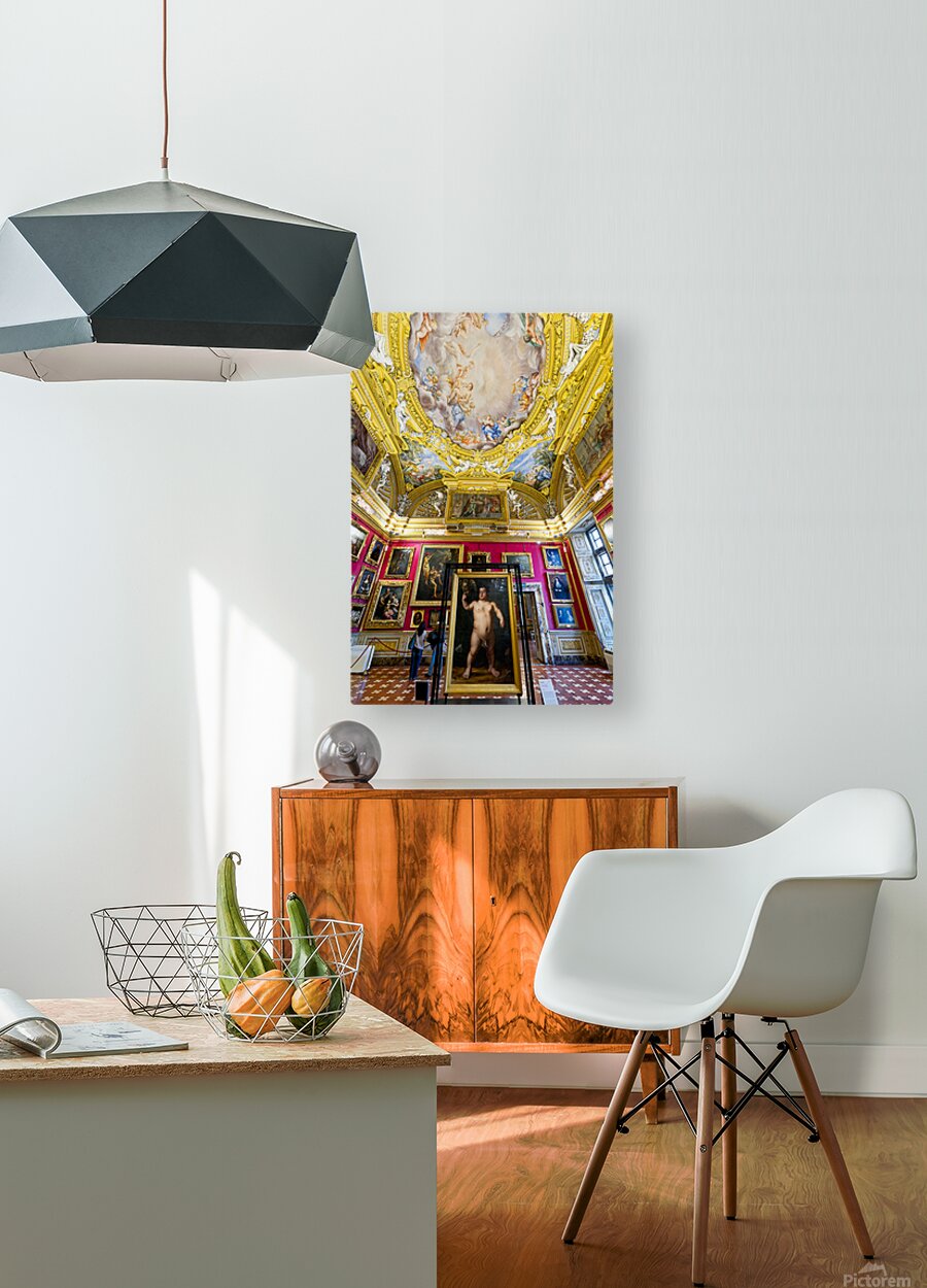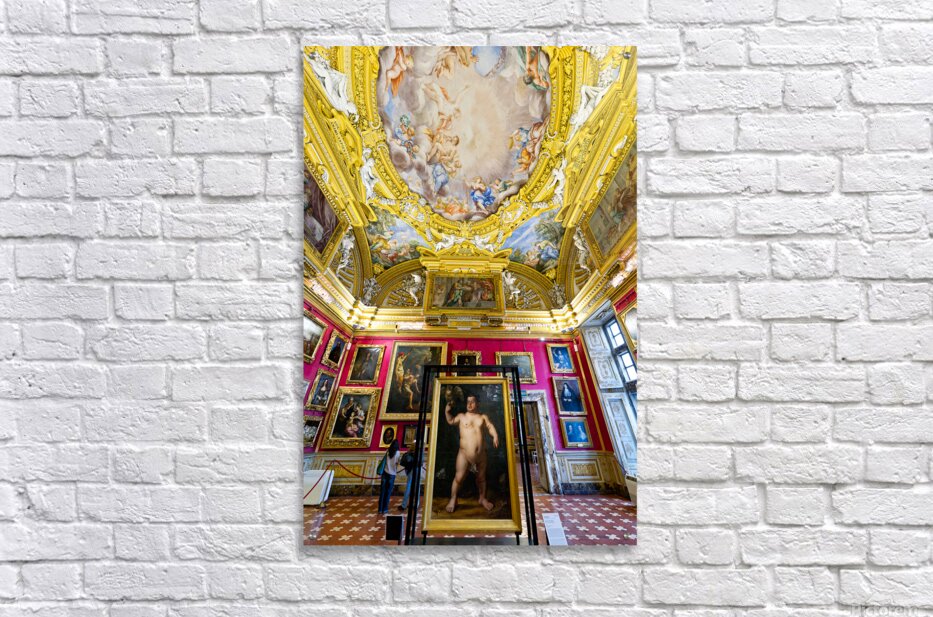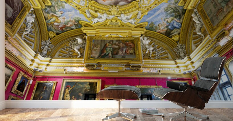 People explore the Palatine Gallery in Palazzo Pitti observing the artwork by Bronzino. The gallery features colorful walls and ornate ceilings.