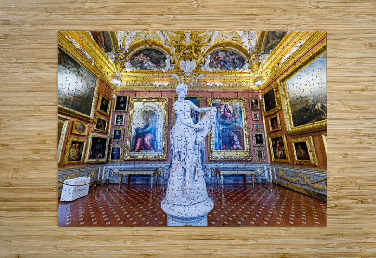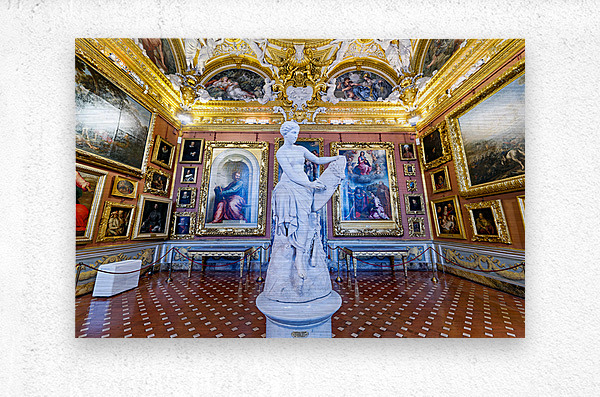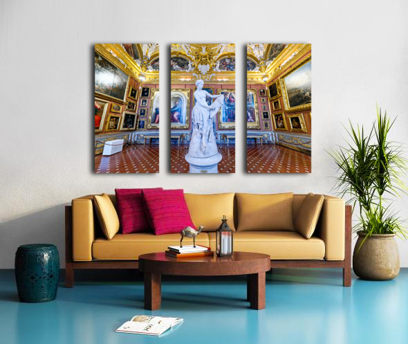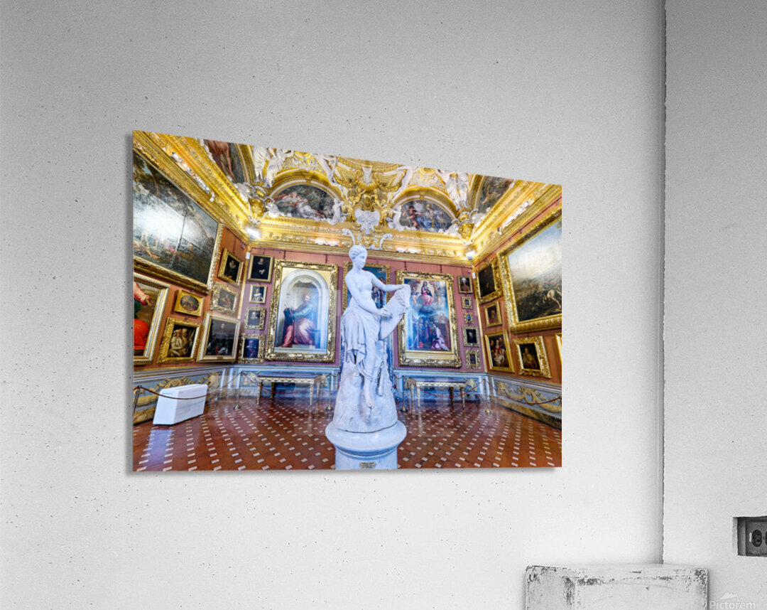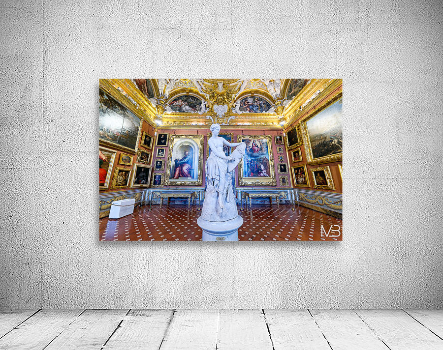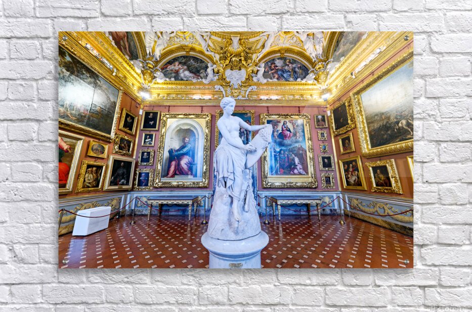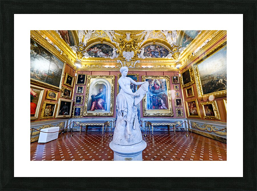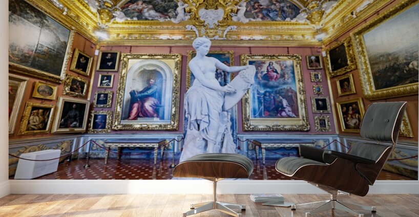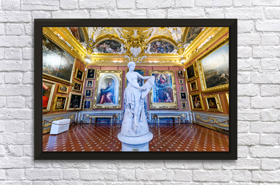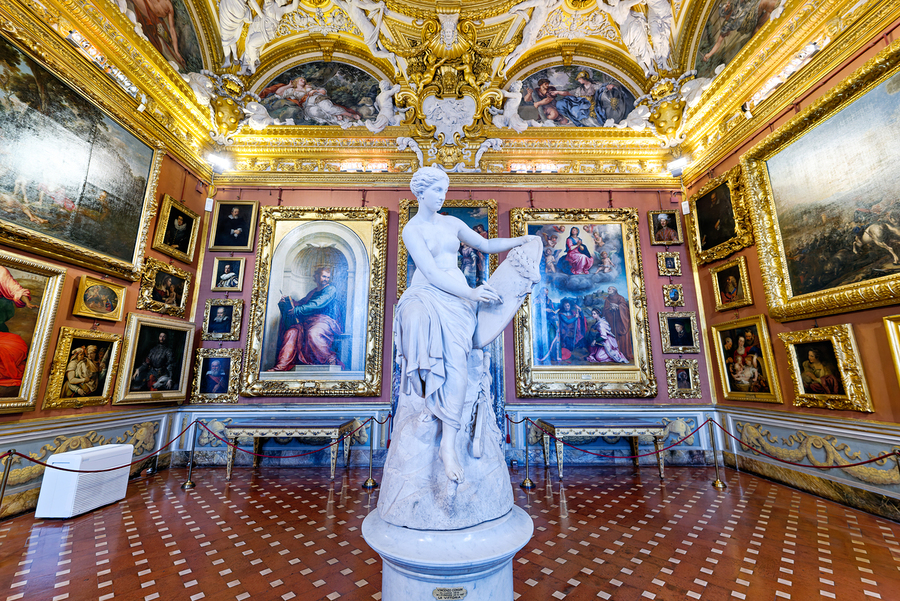 La Vittoria by Vincenzo Consani stands in the Palatine Gallery. The room displays many artworks featuring a rich history in Florence.