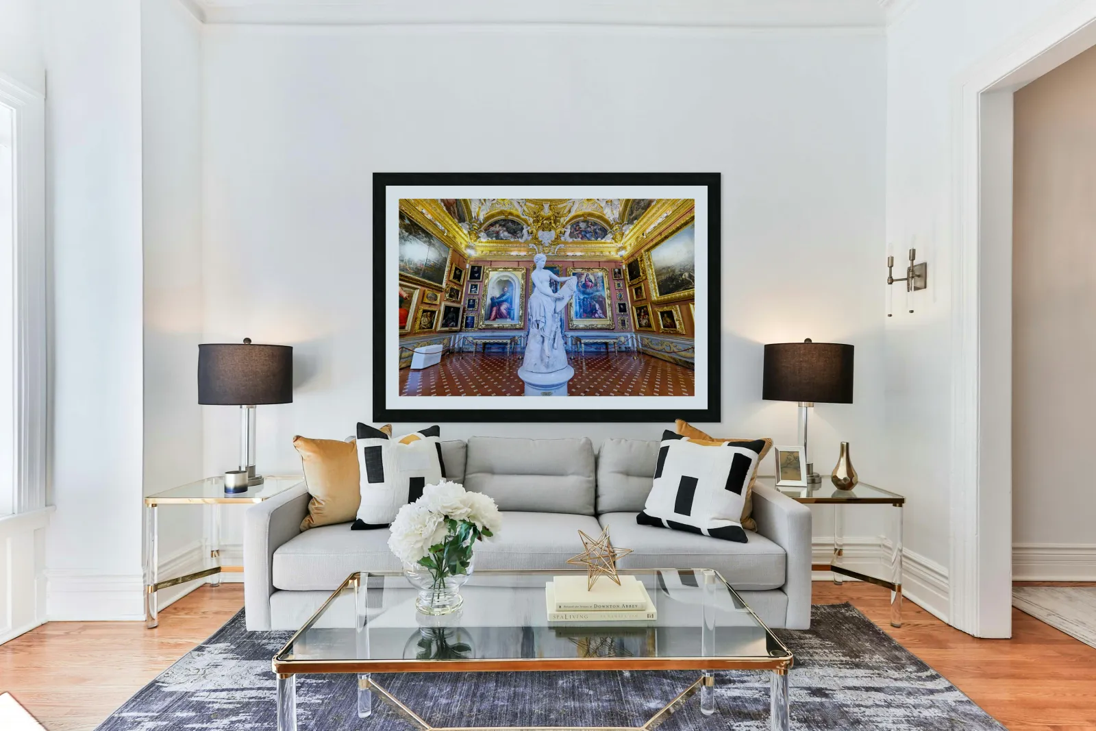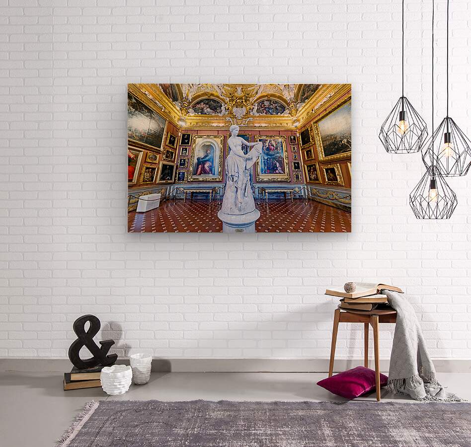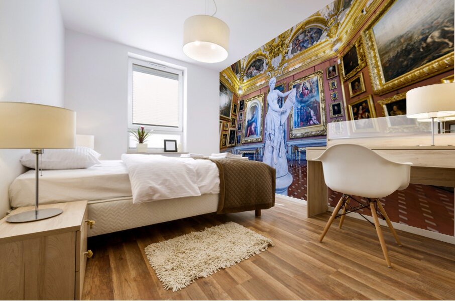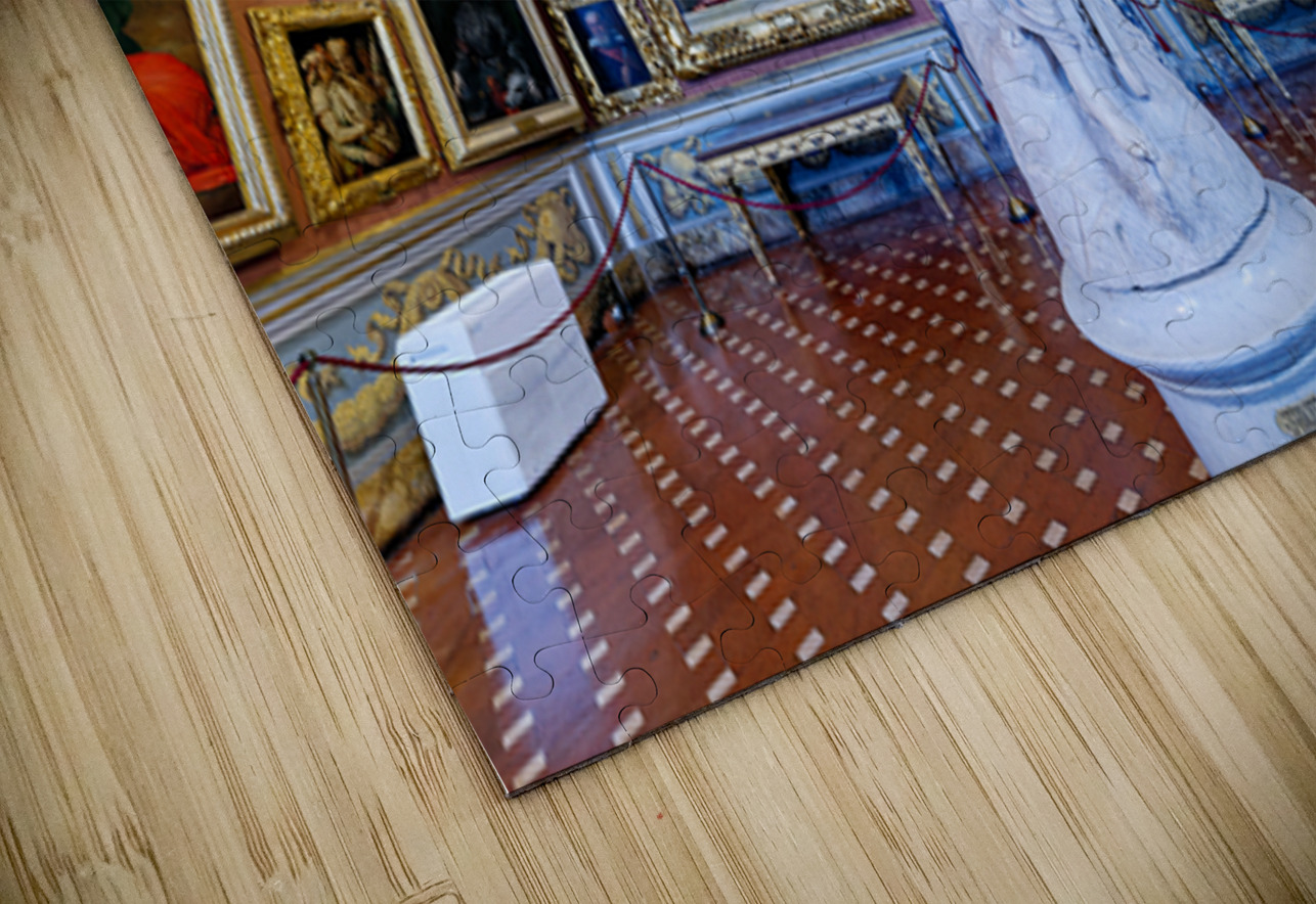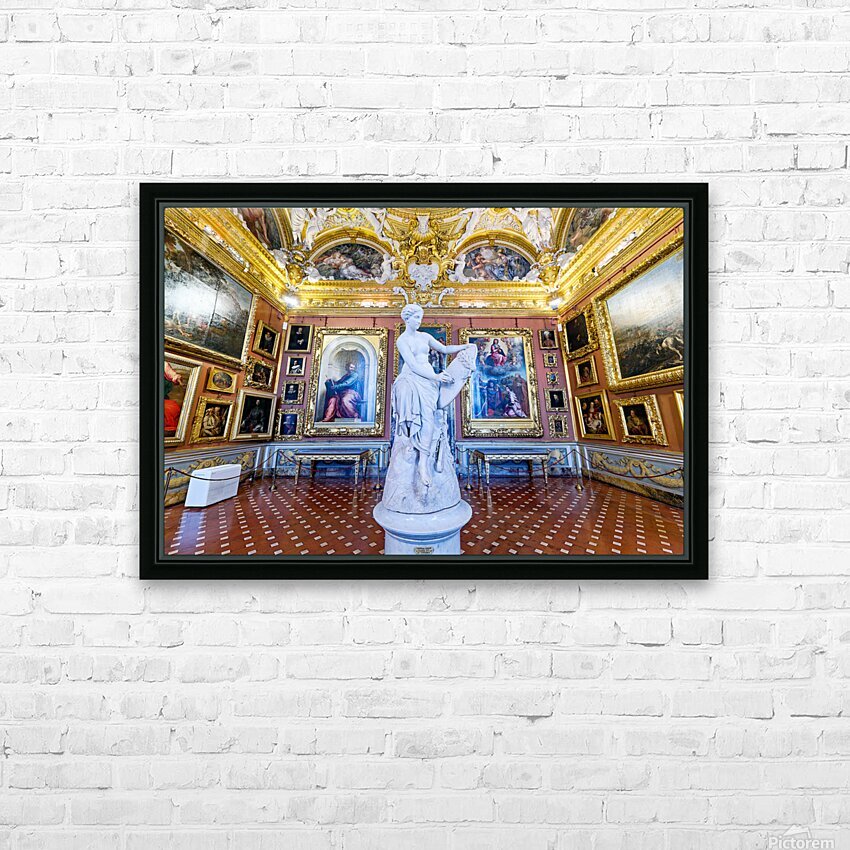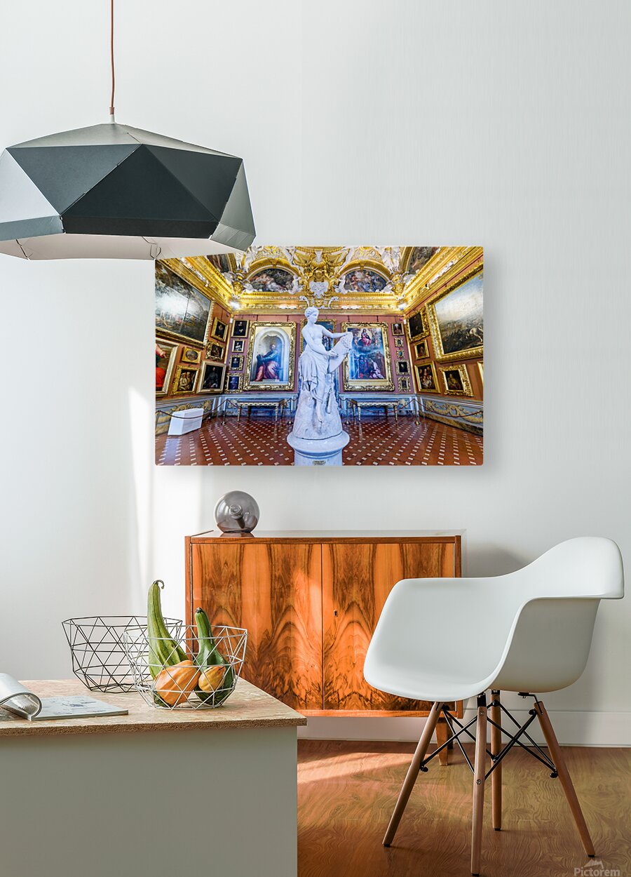 La Vittoria by Vincenzo Consani stands in the Palatine Gallery. The room displays many artworks featuring a rich history in Florence.