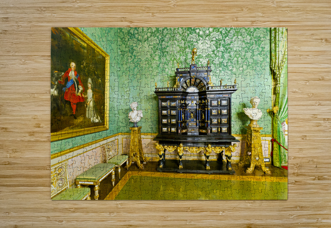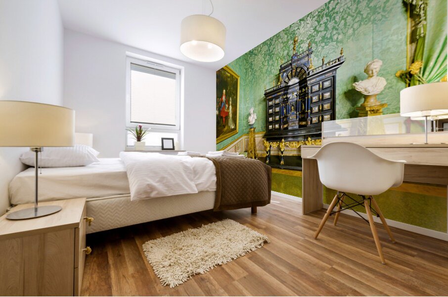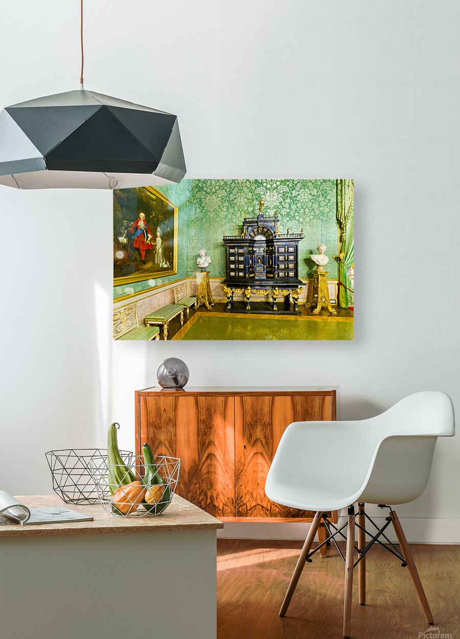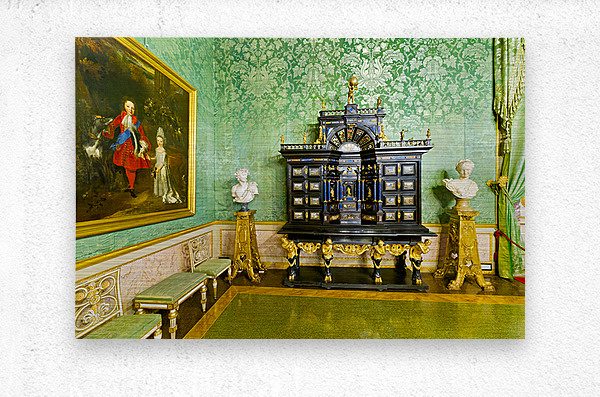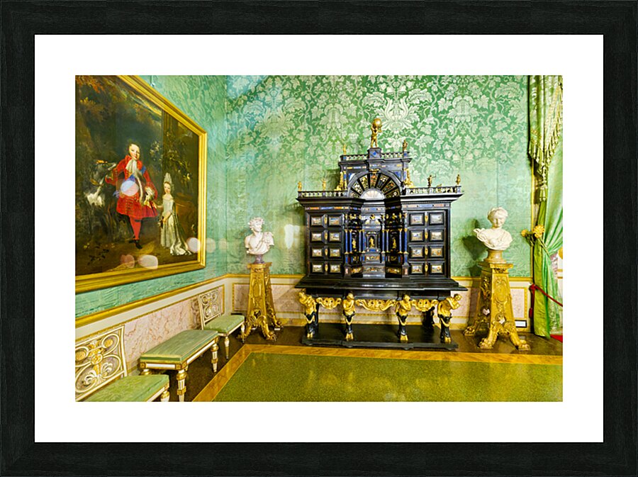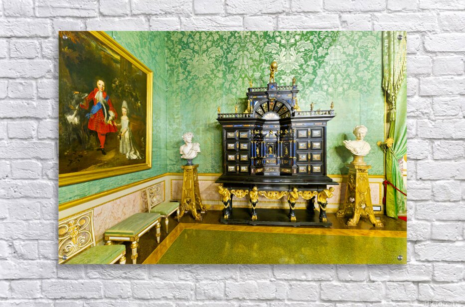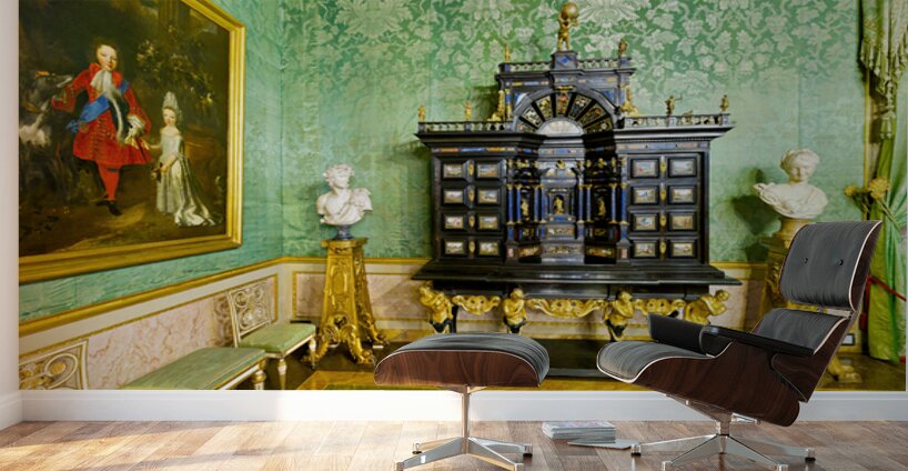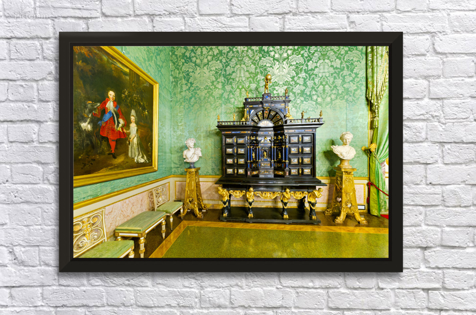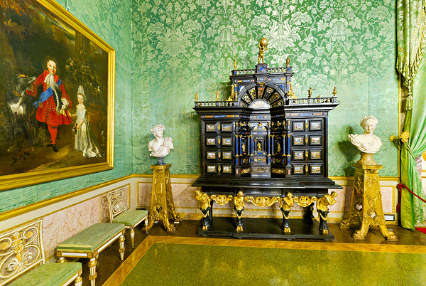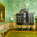 In the Green Room of the Palatine Gallery visitors see a decorative cabinet and paintings on the wall.