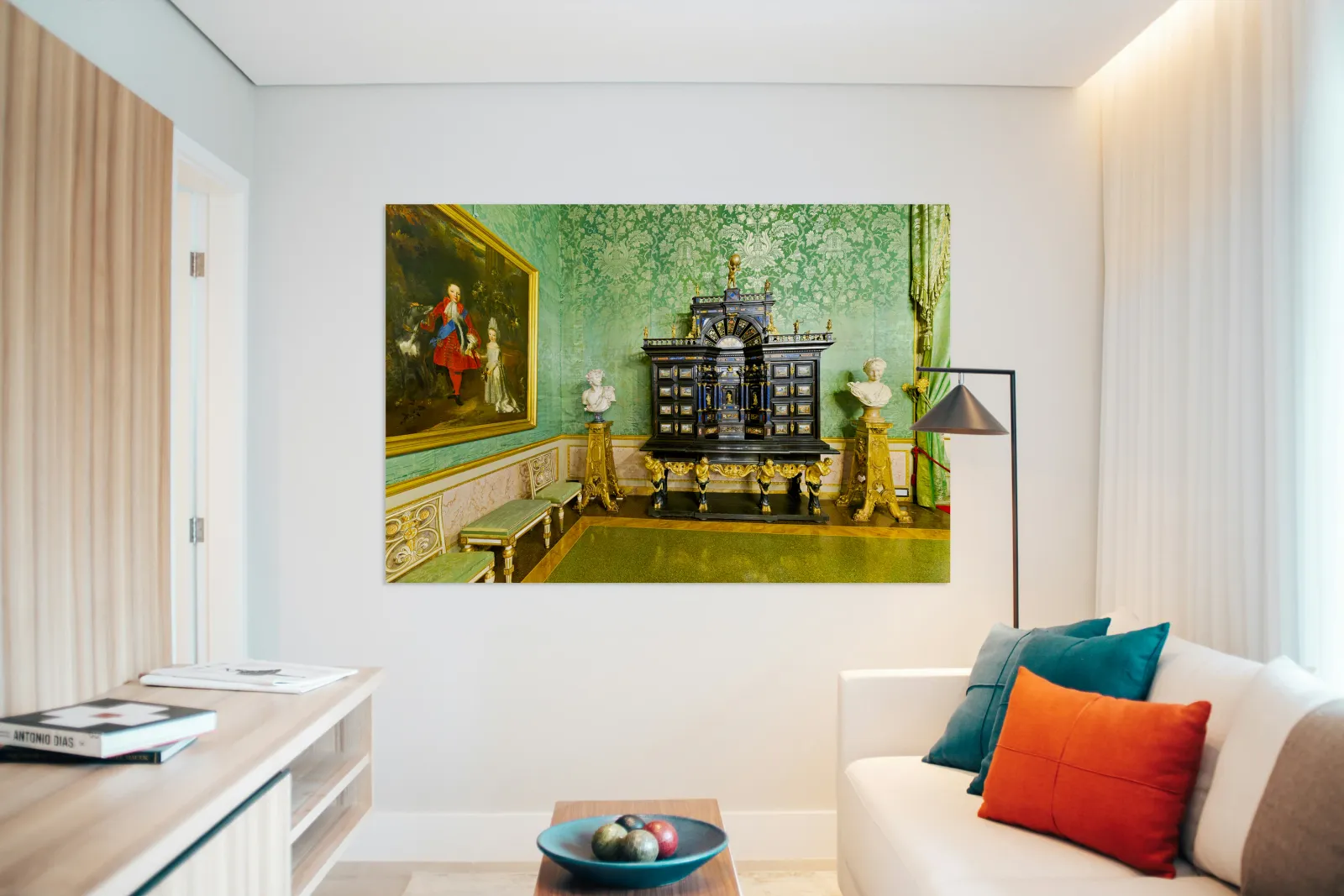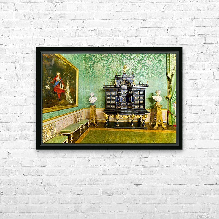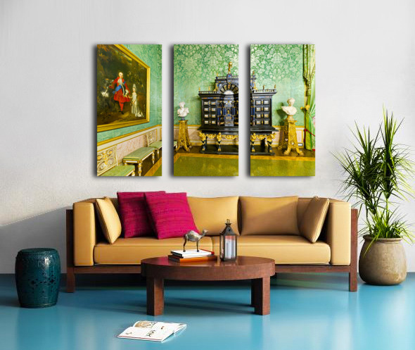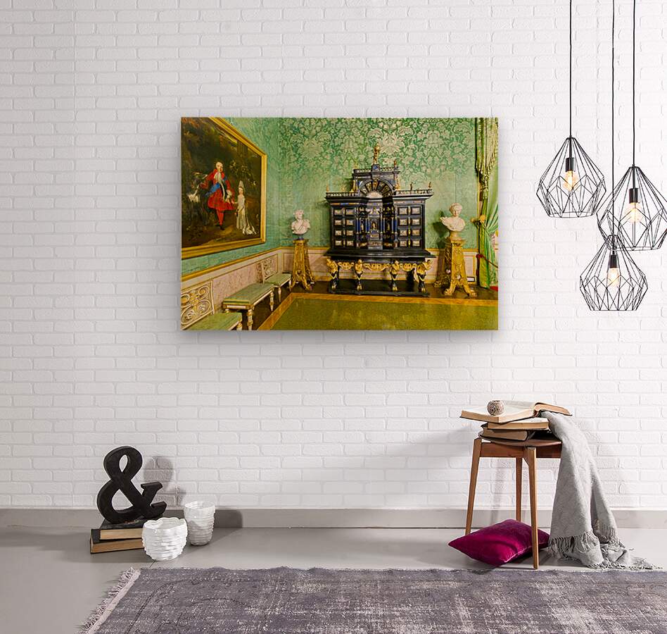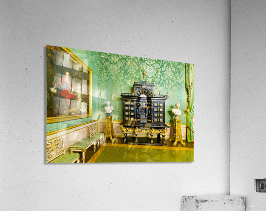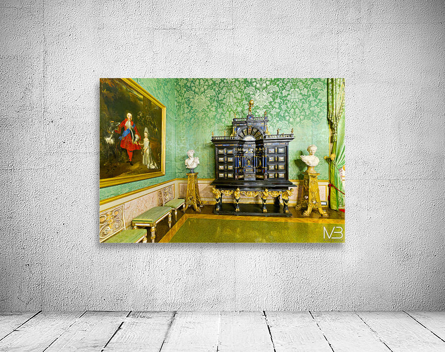 In the Green Room of the Palatine Gallery visitors see a decorative cabinet and paintings on the wall.