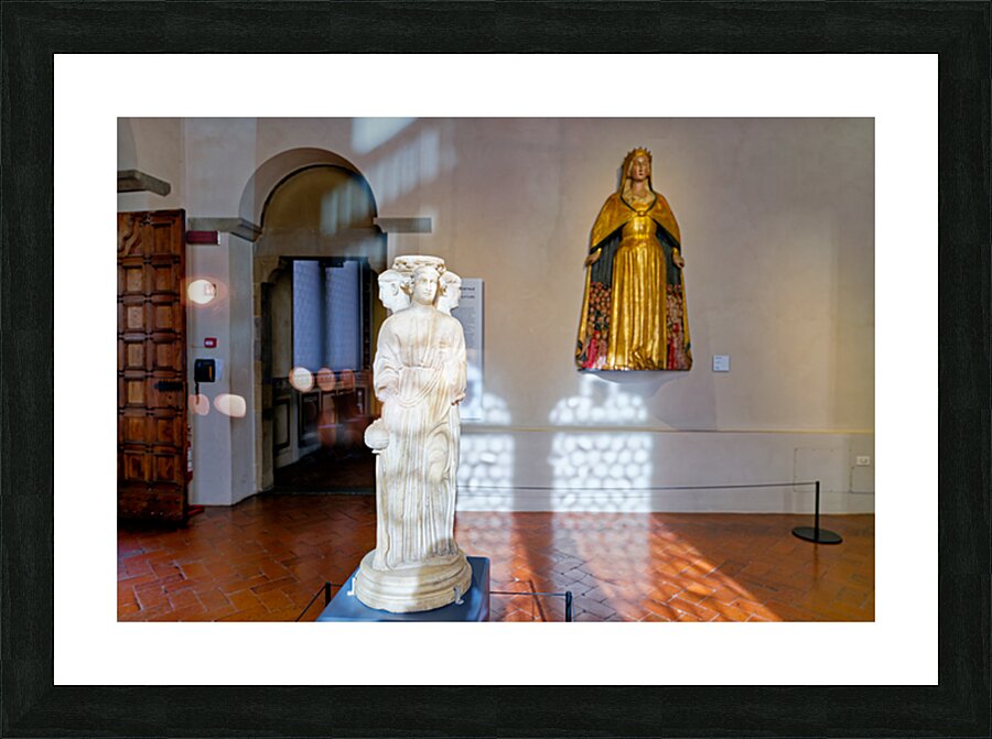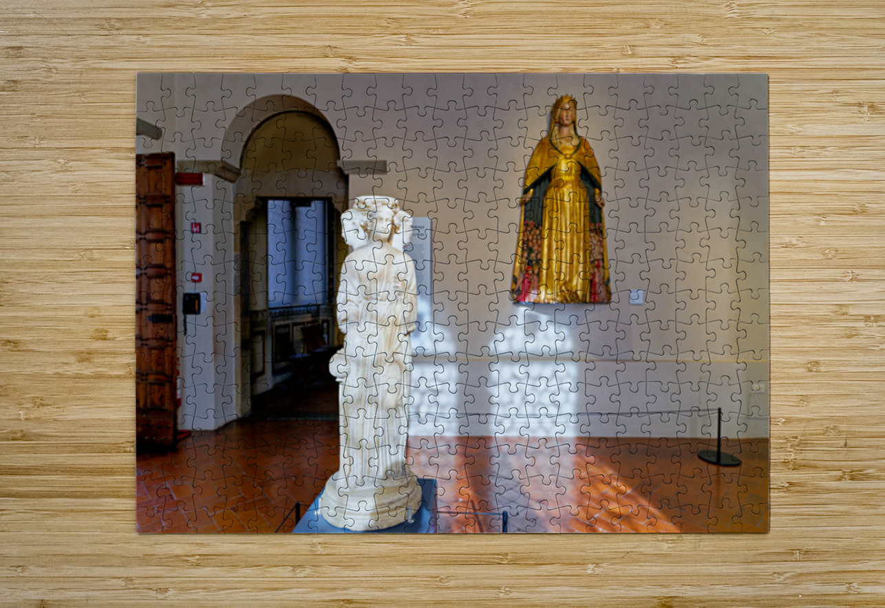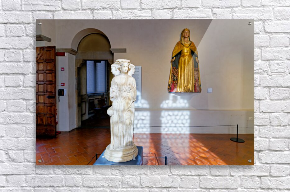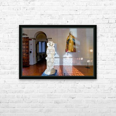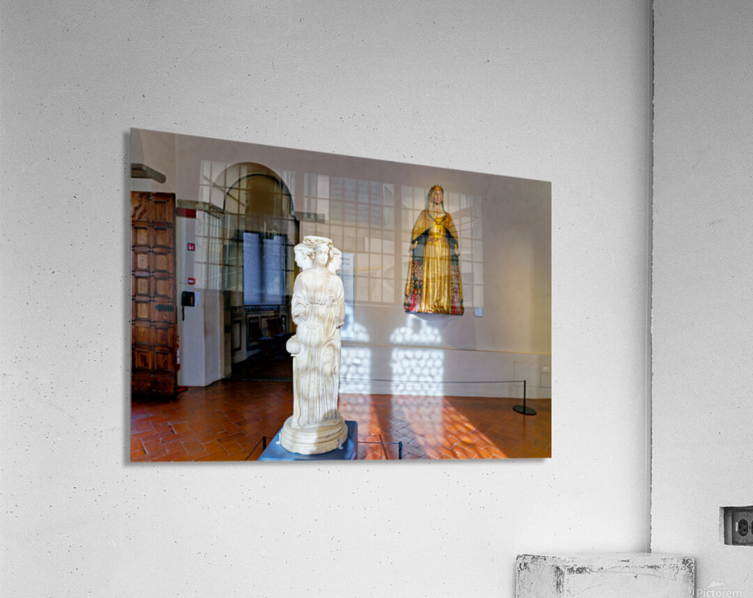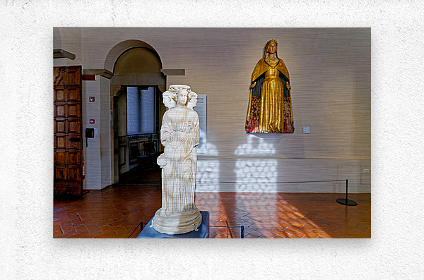 People look at a sculpture and a figure in the Museo Nazionale del Bargello in Florence Tuscany. Light shines through the windows in the room.