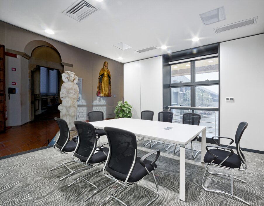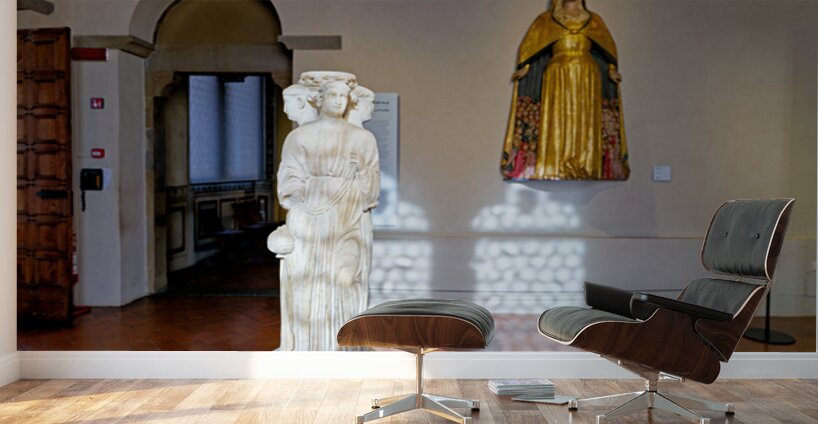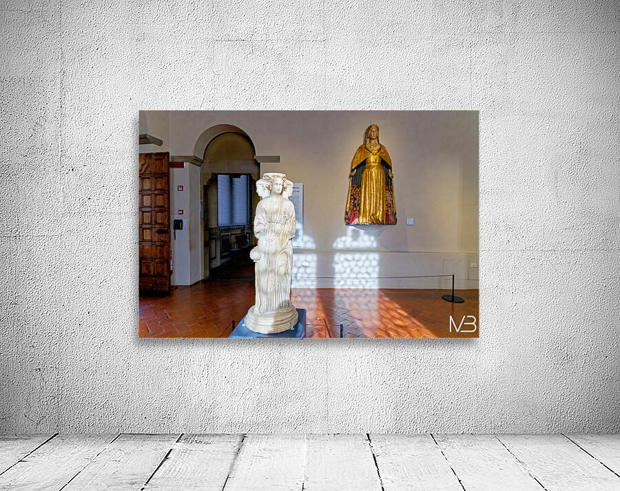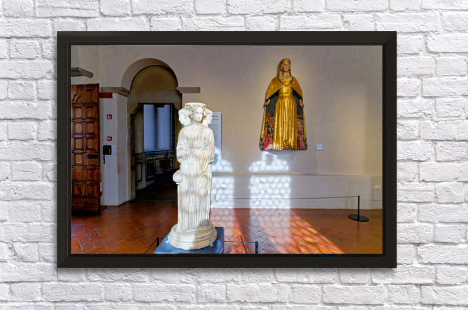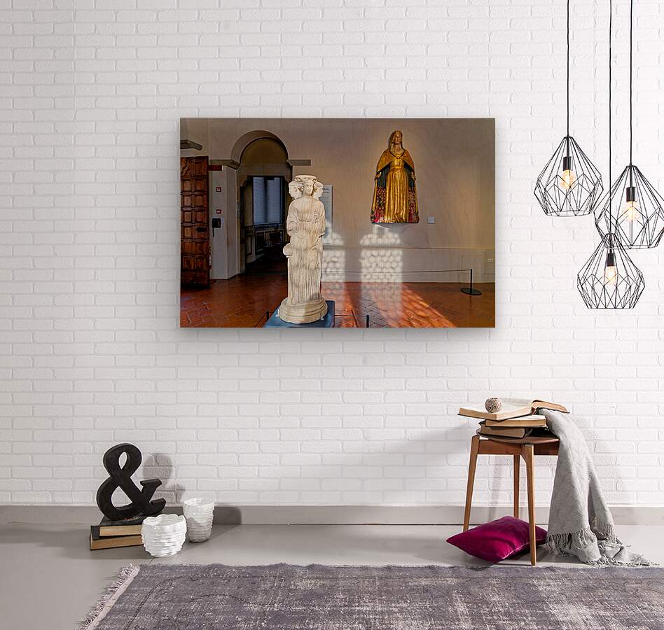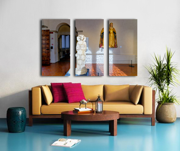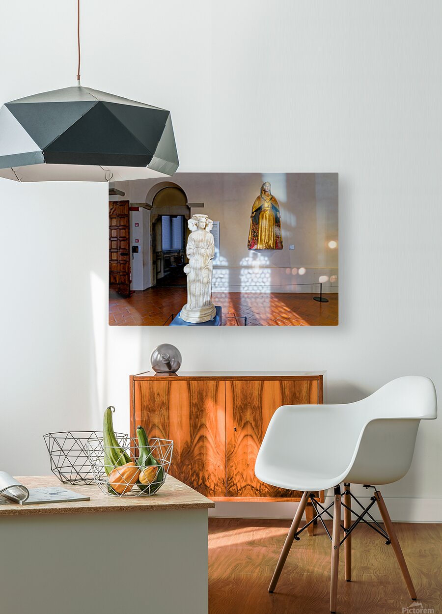 People look at a sculpture and a figure in the Museo Nazionale del Bargello in Florence Tuscany. Light shines through the windows in the room.