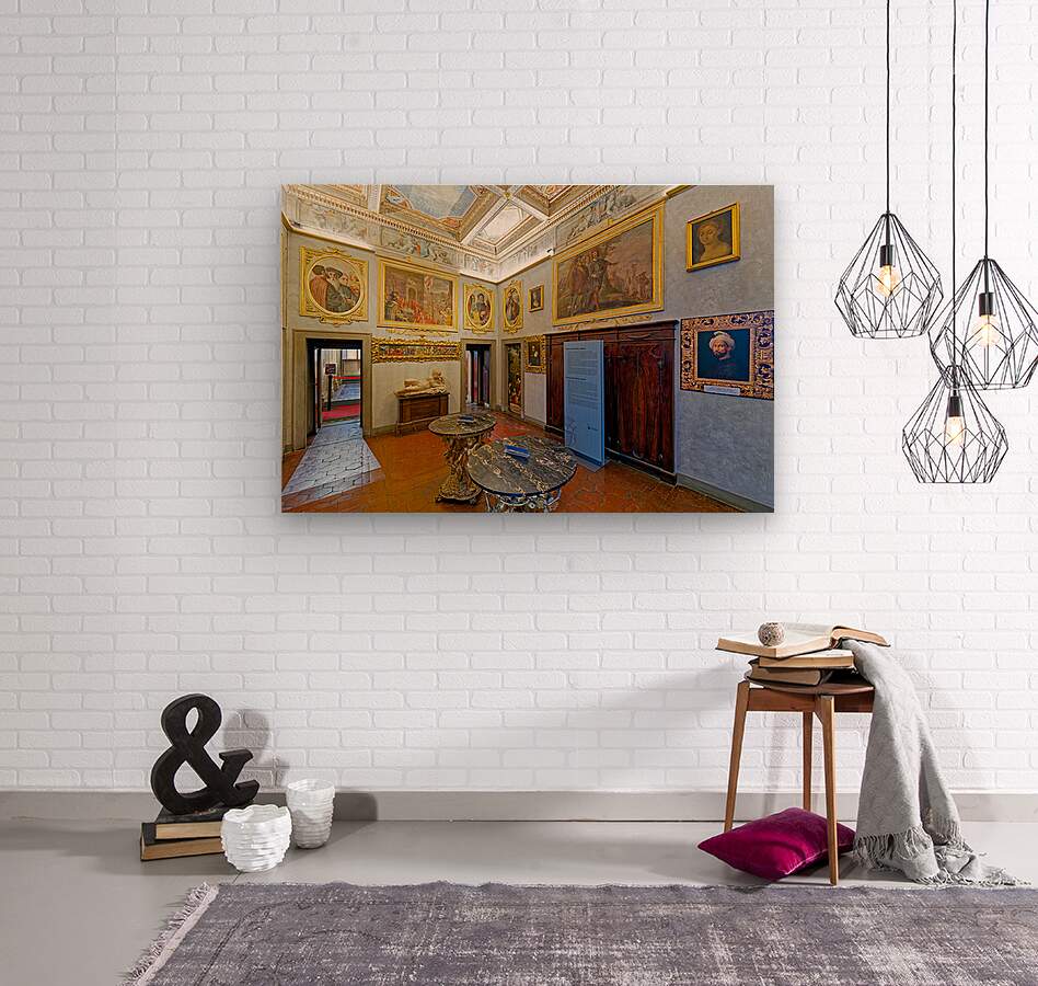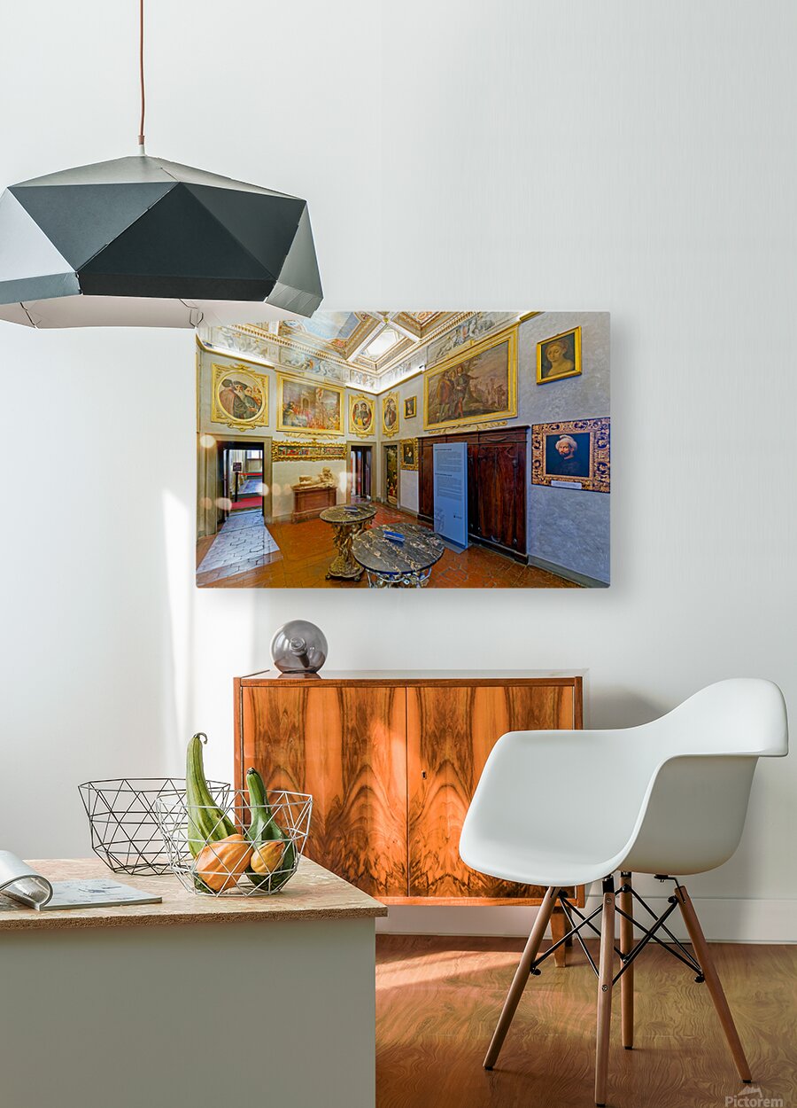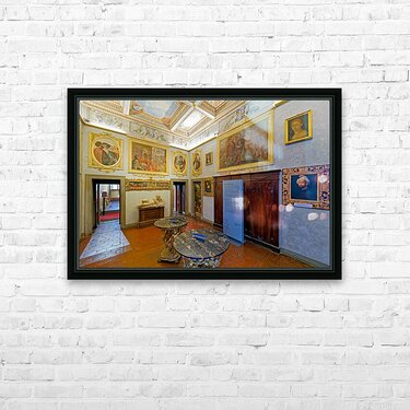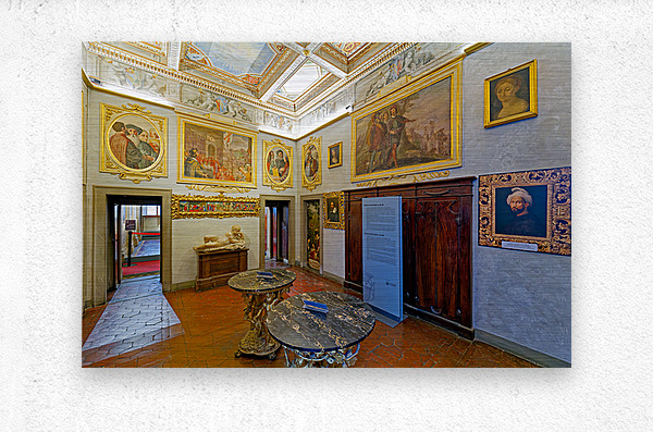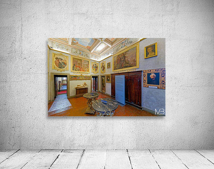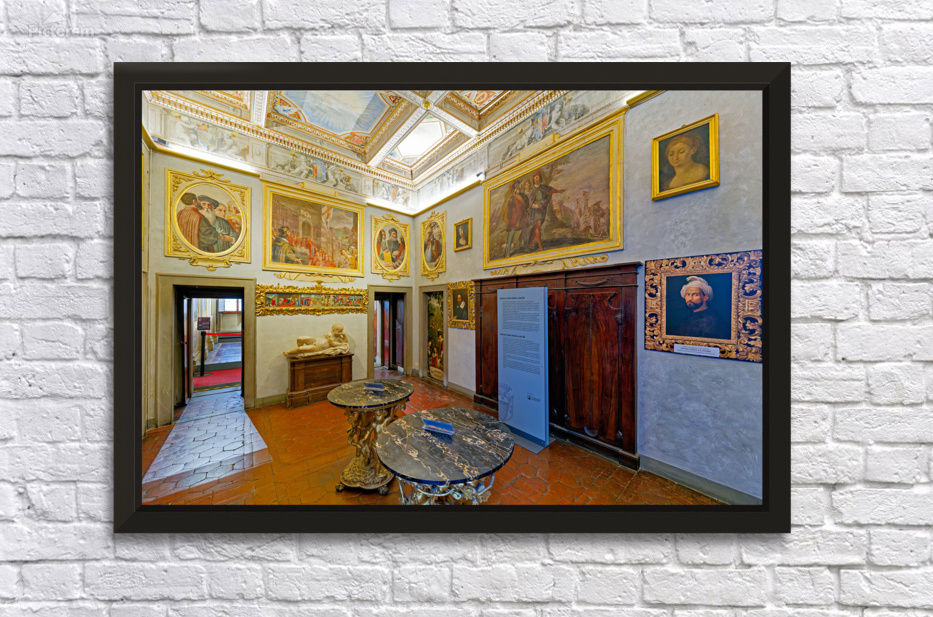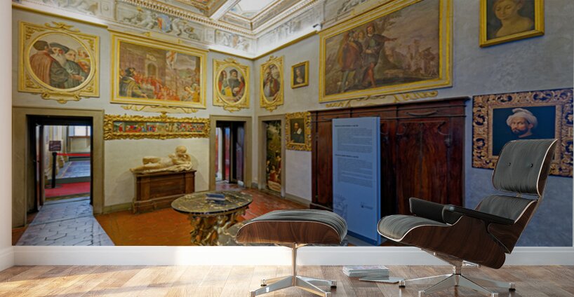 Visitors explore Casa Buonarroti in Florence Tuscany viewing art and historical details within the room. The space features paintings and decor.
