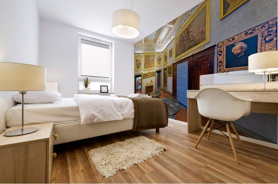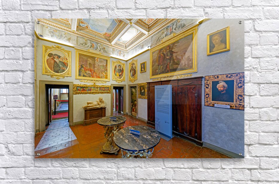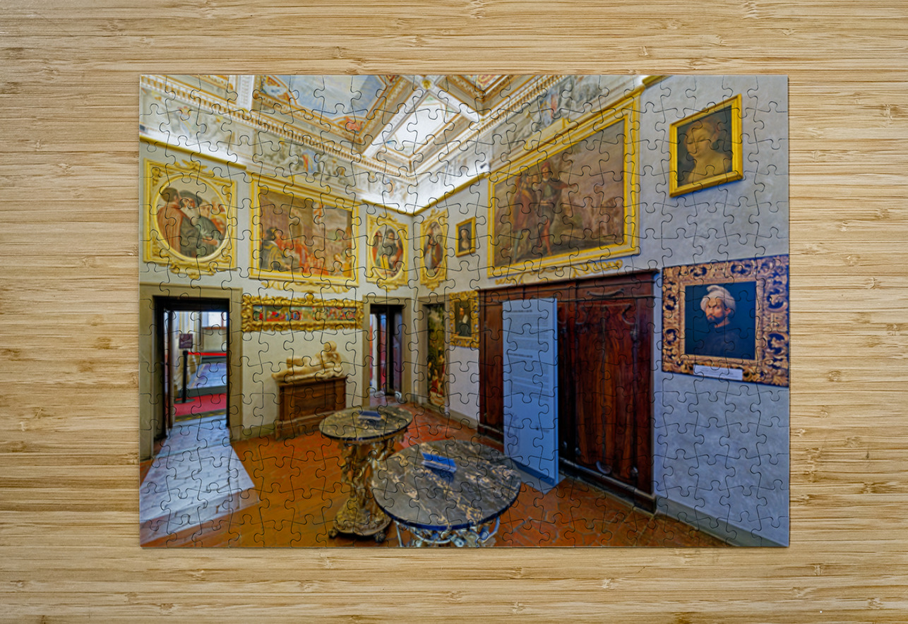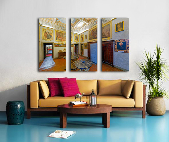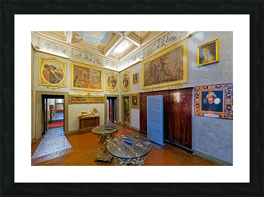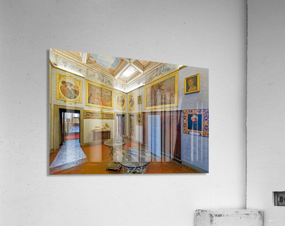 Visitors explore Casa Buonarroti in Florence Tuscany viewing art and historical details within the room. The space features paintings and decor.