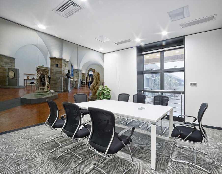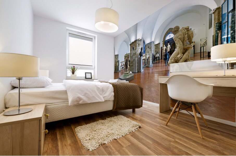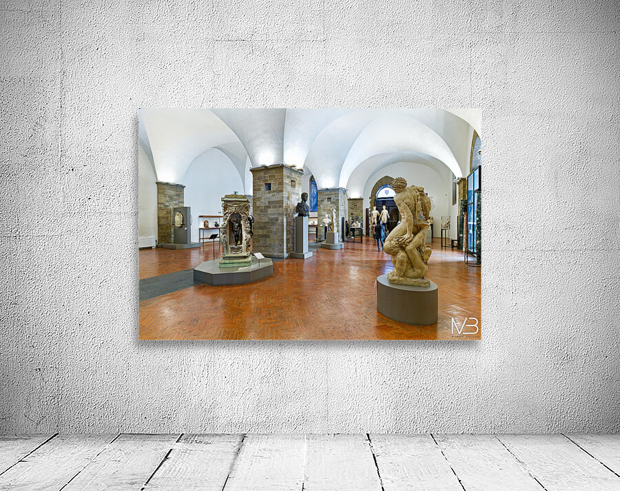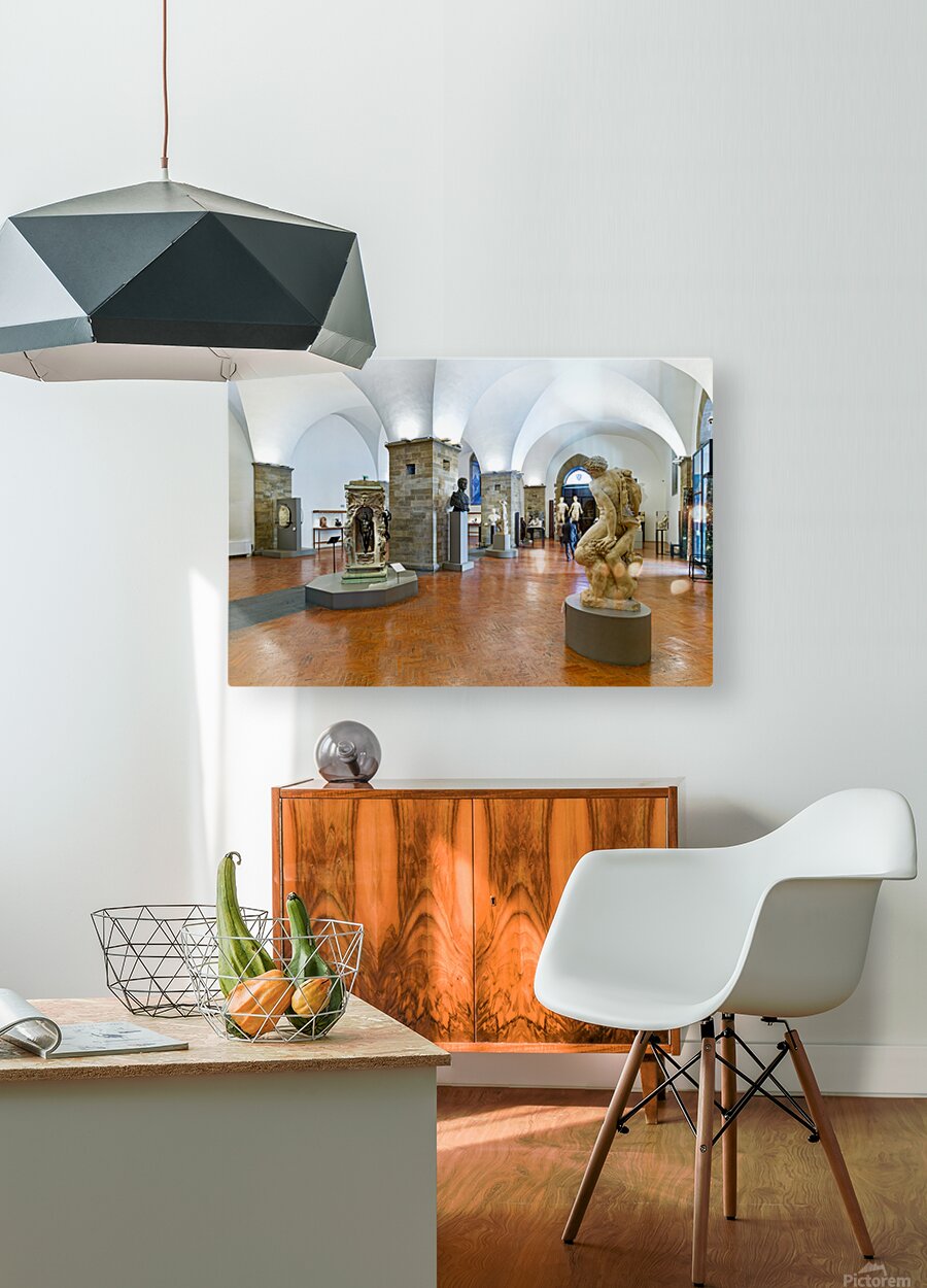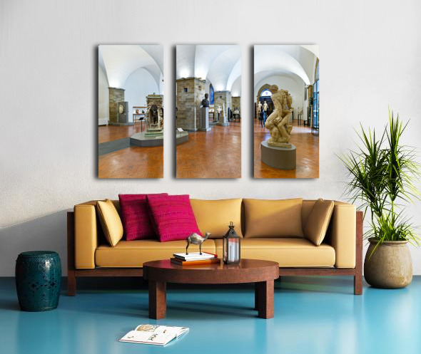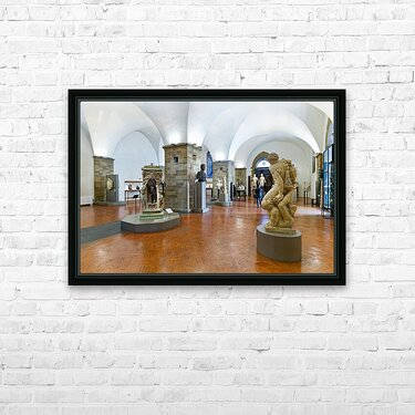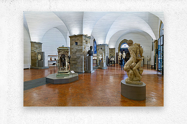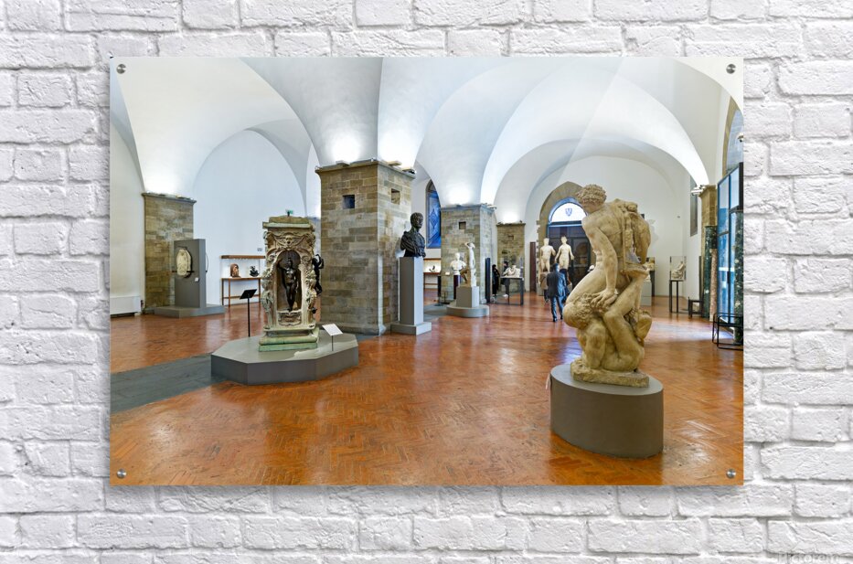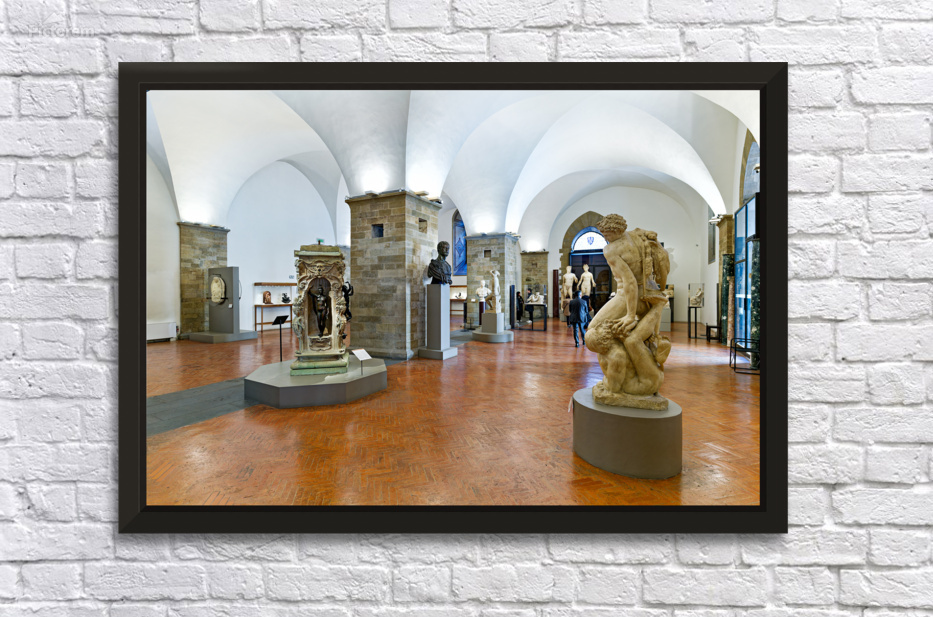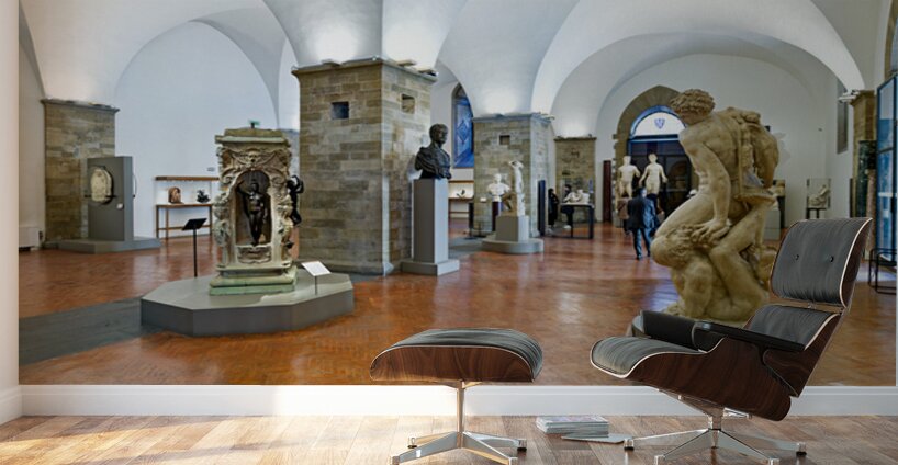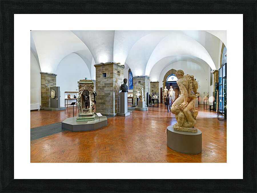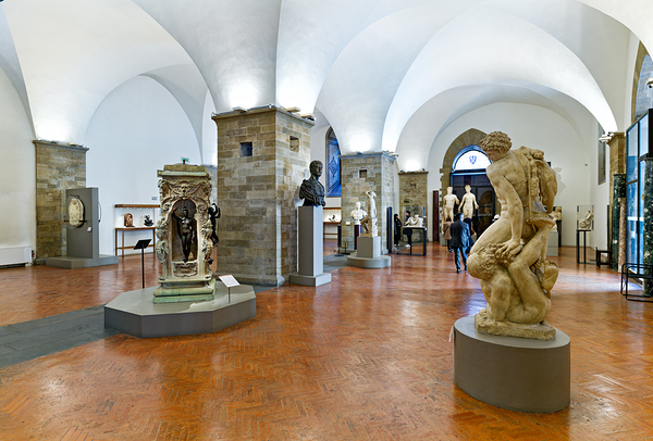Visitors explore classic sculptures in Museo Nazionale del Bargello in Florence. The museum showcases important artwork and historical pieces.