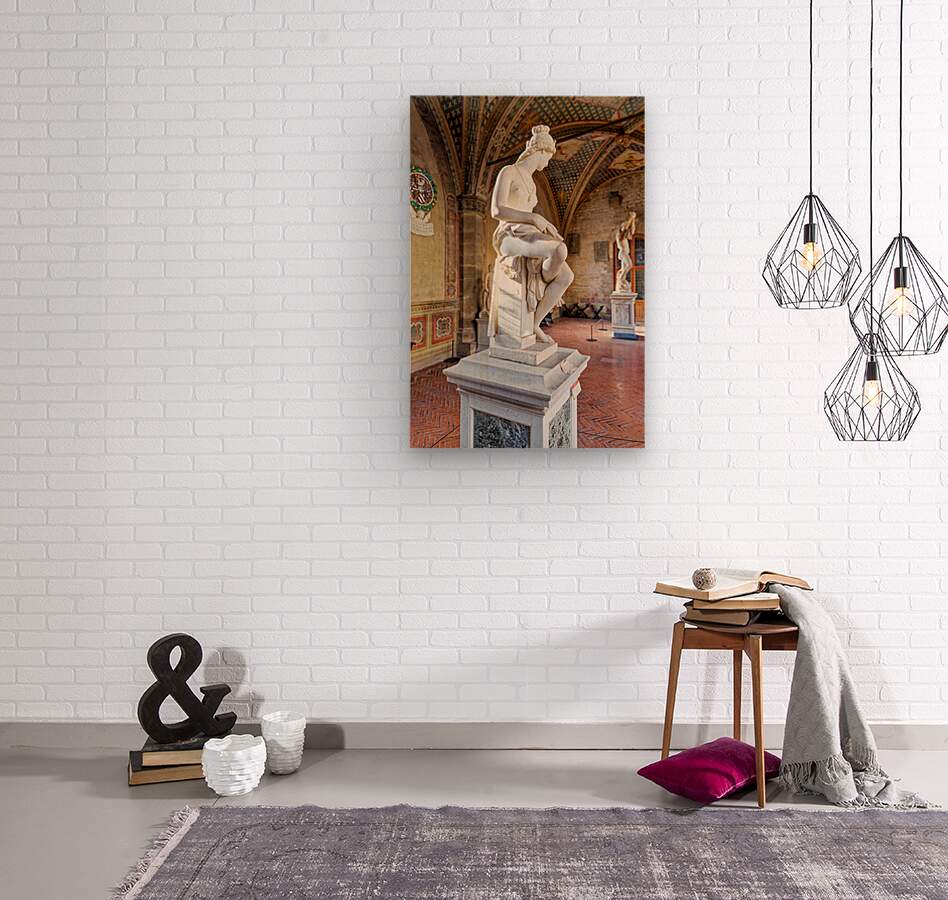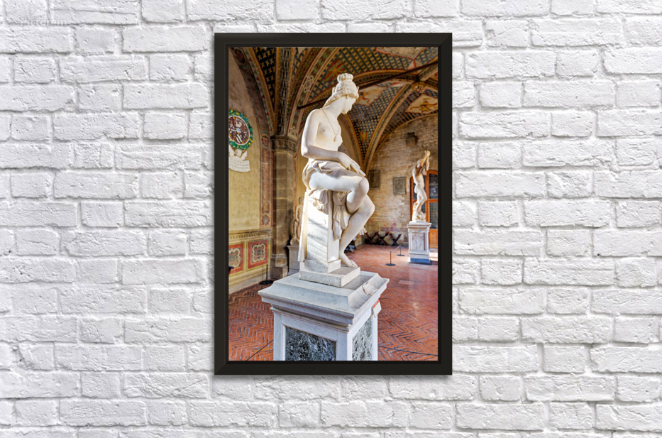 A marble sculpture sits on a pedestal in the Museo Nazionale del Bargello in Florence Tuscany. Visitors admire the art and architecture.