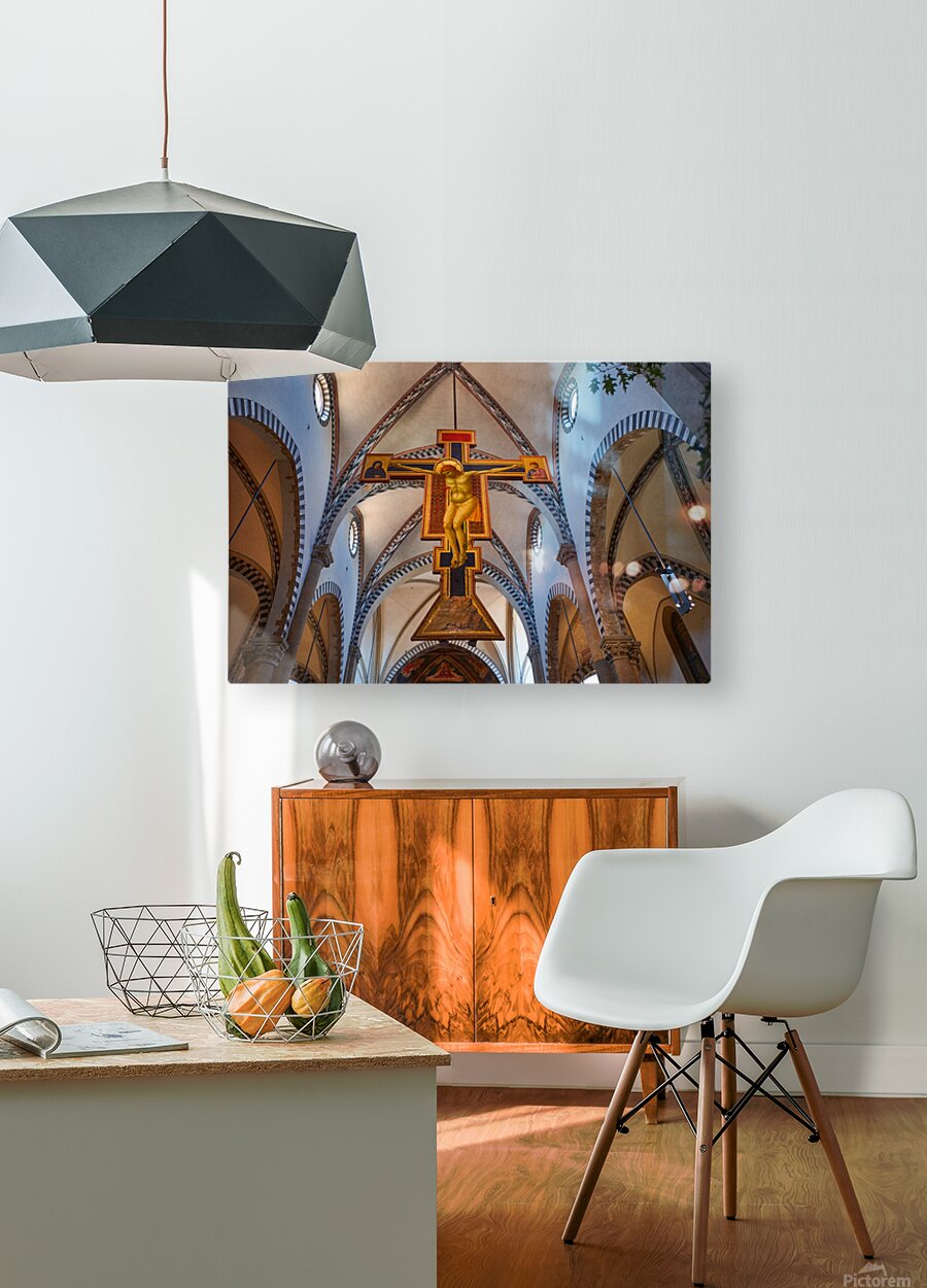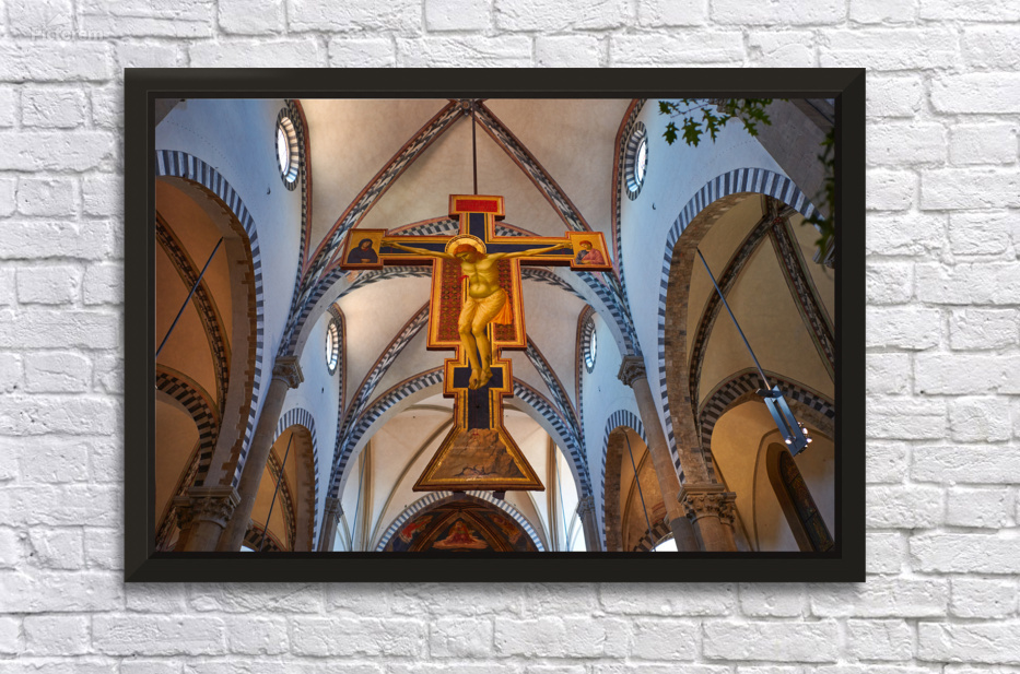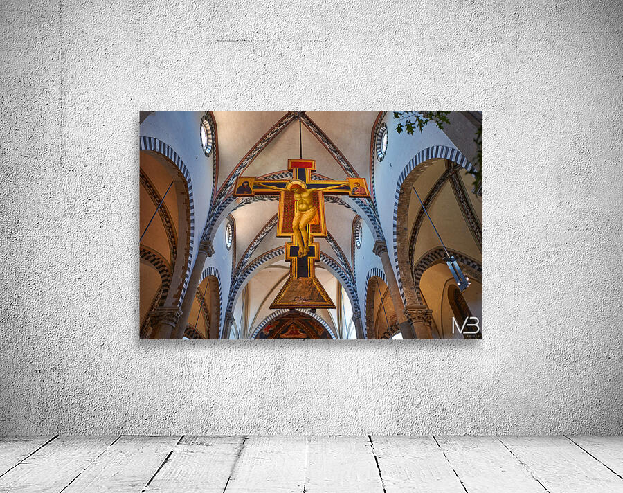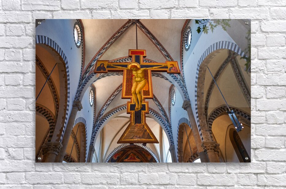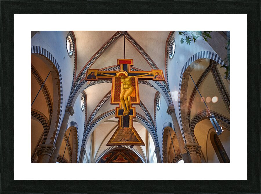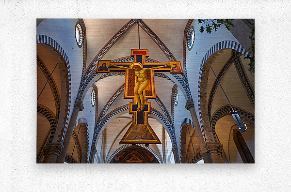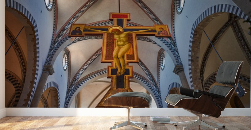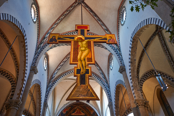 The view shows the large crucifix within Santa Maria Novella Church during daytime. Visitors admire the art and architecture inside the church.