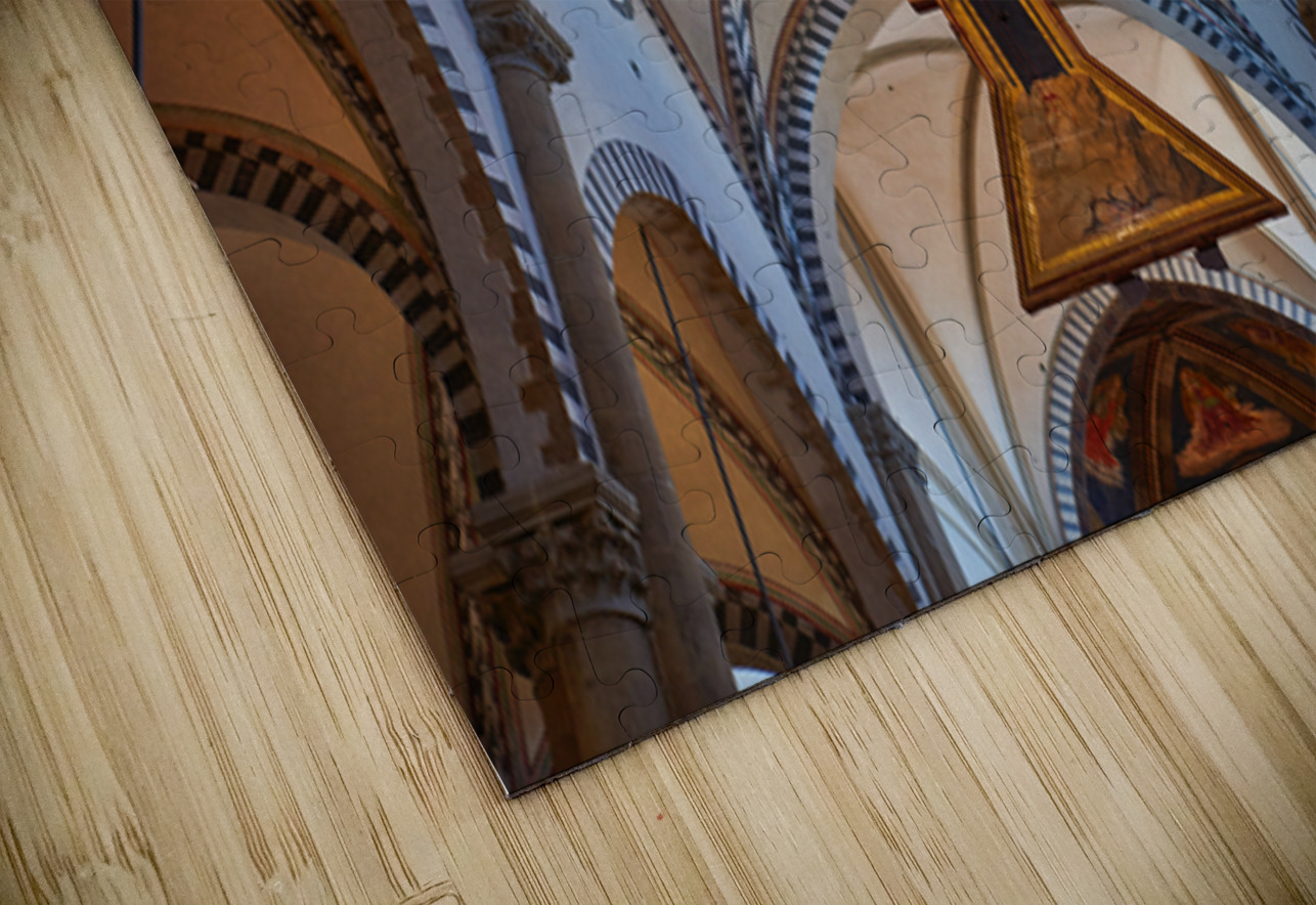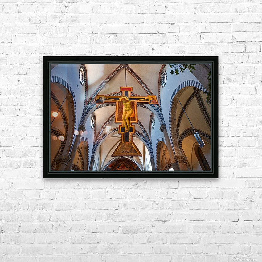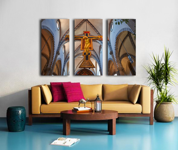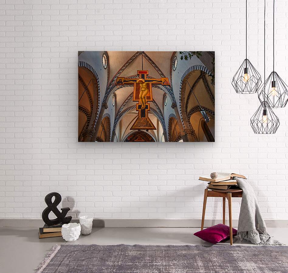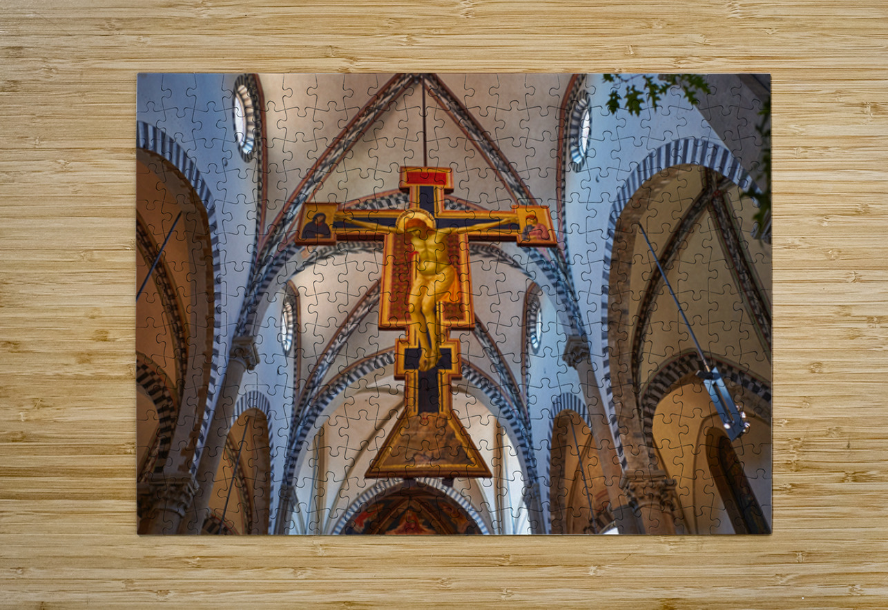 The view shows the large crucifix within Santa Maria Novella Church during daytime. Visitors admire the art and architecture inside the church.