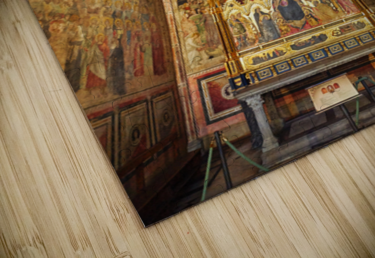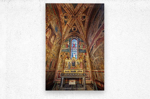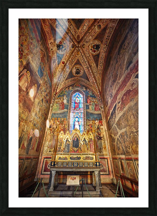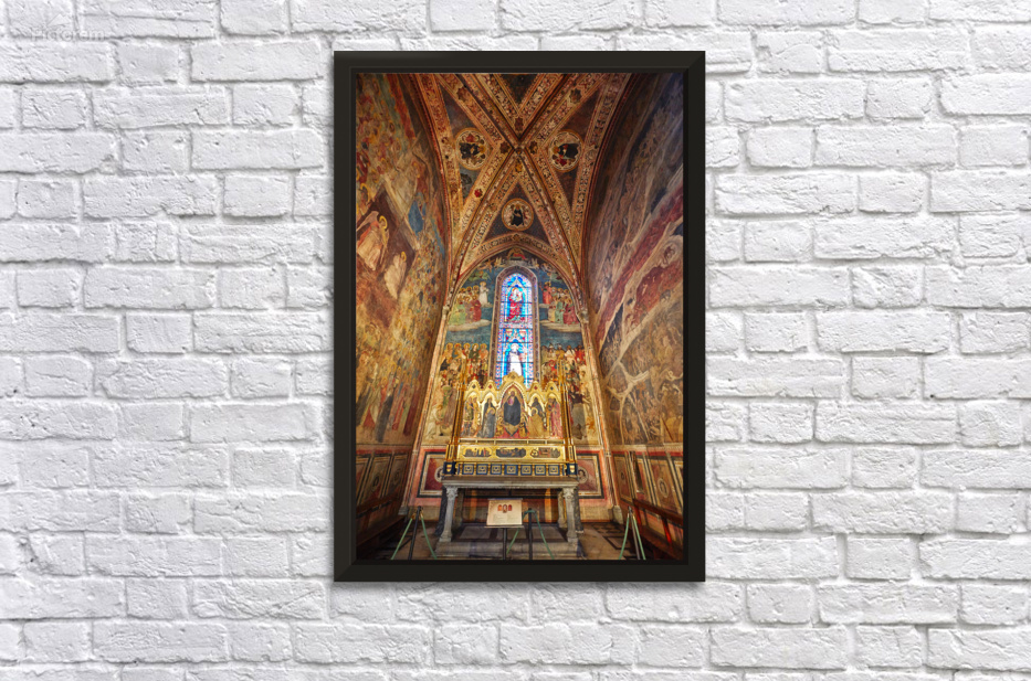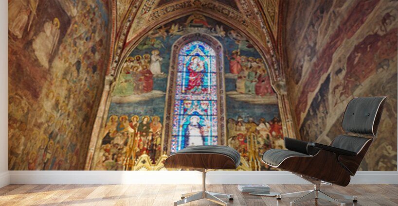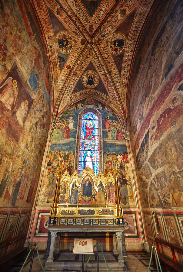 Visitors explore the Santa Maria Novella church in Florence Italy. The walls display colorful frescoes and an altar is in the center.