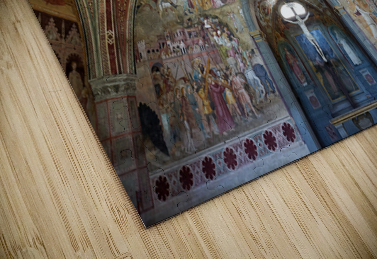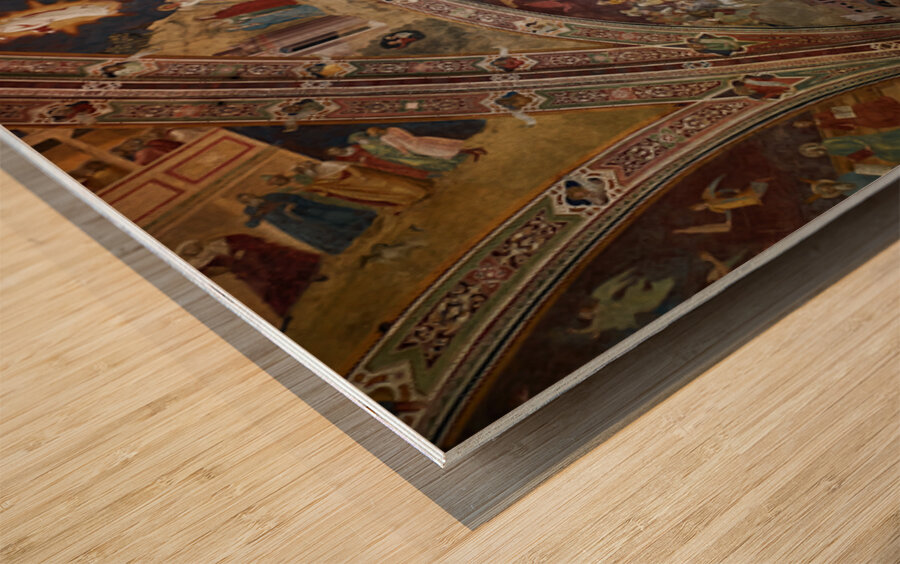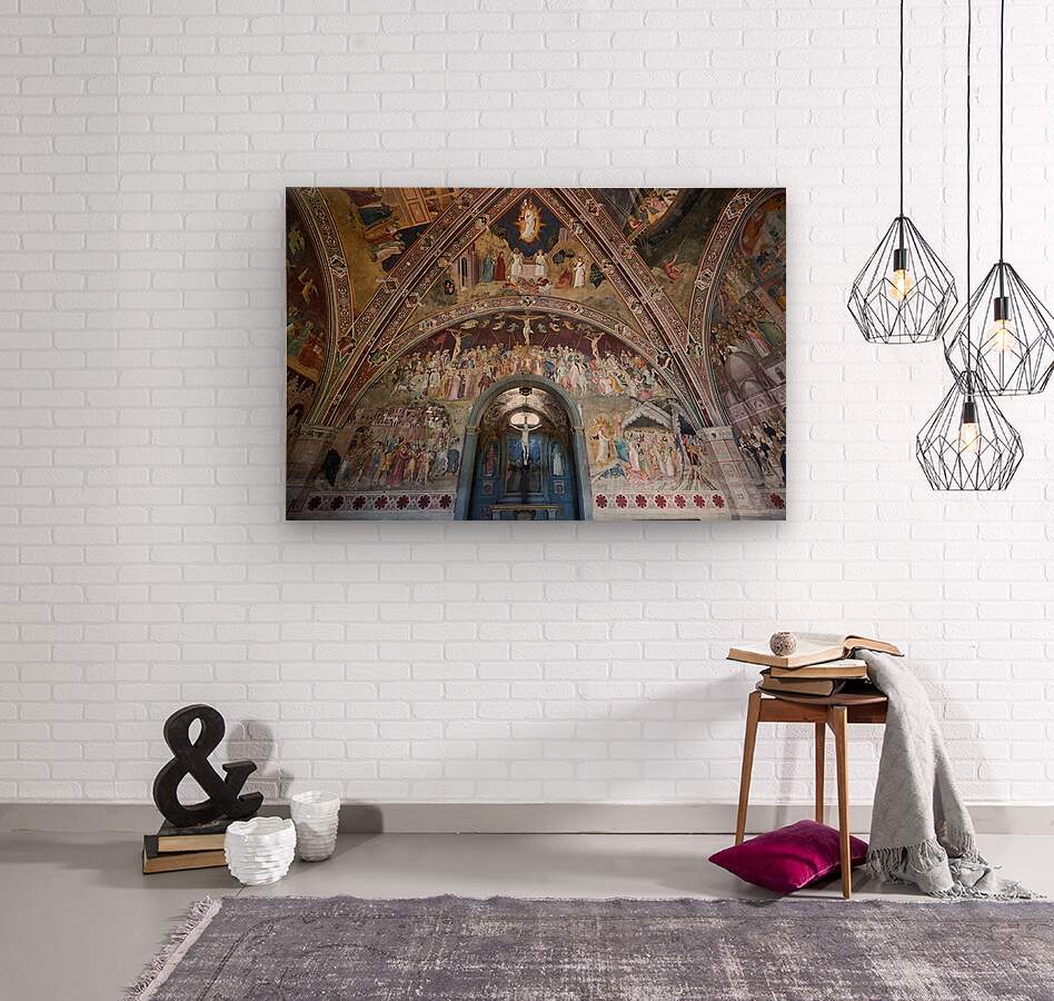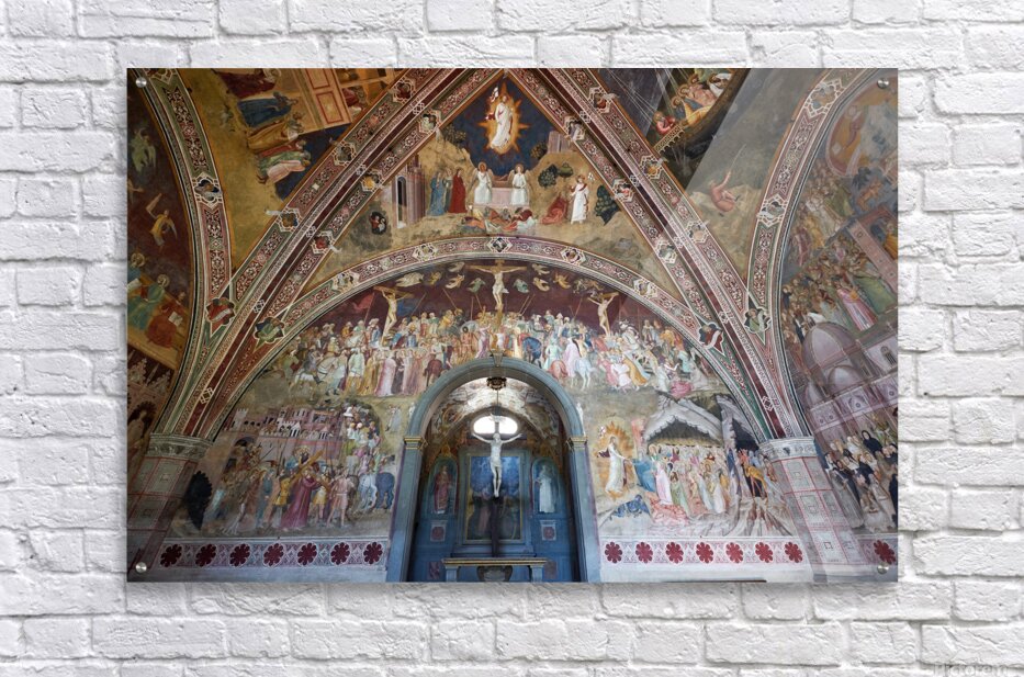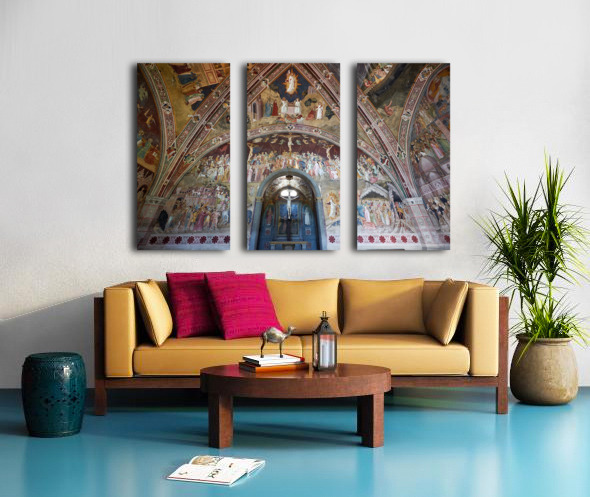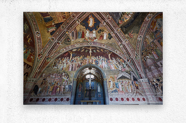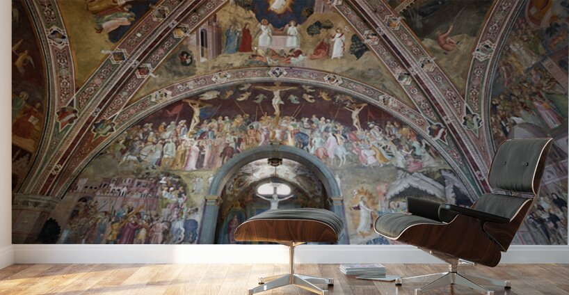 Visitors view colorful artwork on the walls and ceilings of Santa Maria Novella Church in Florence Tuscany during a sunny afternoon.