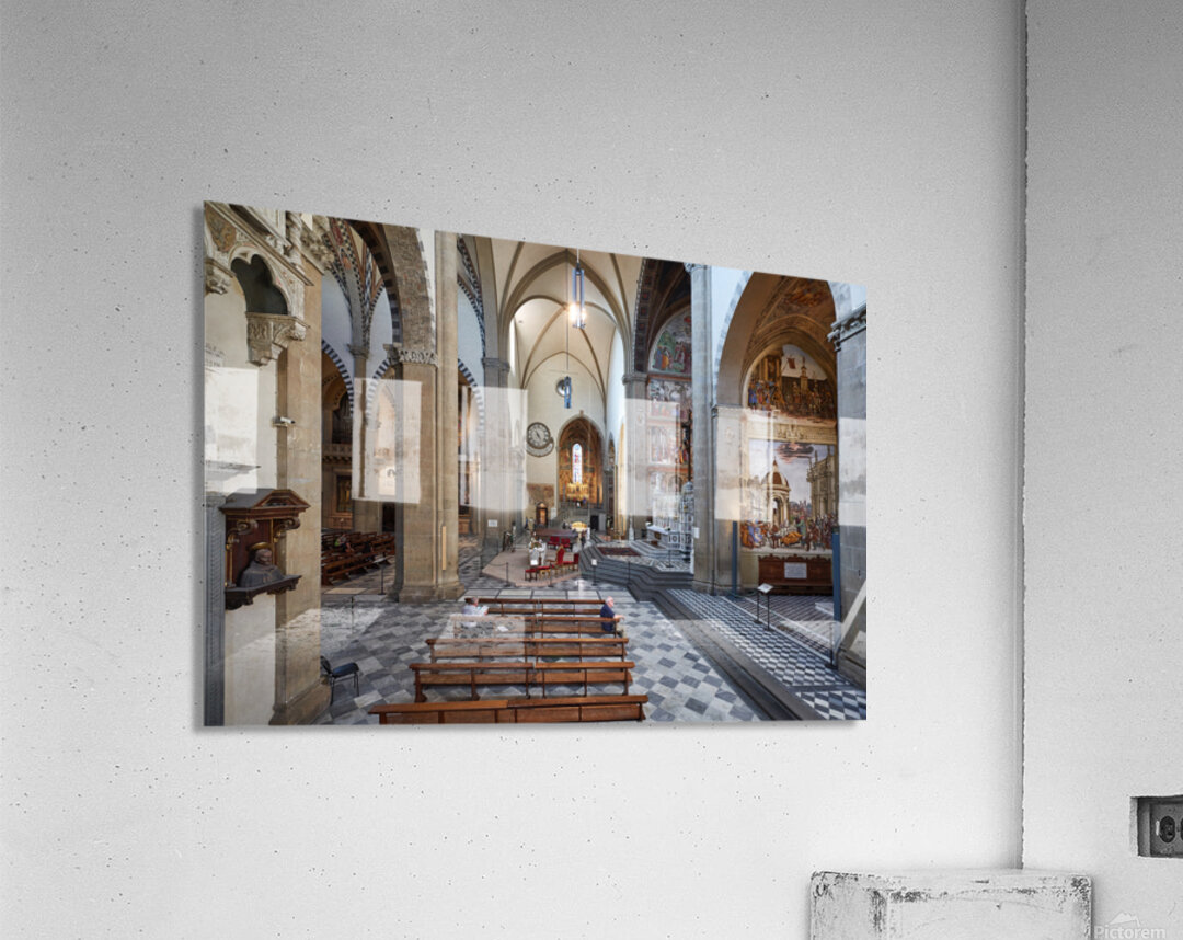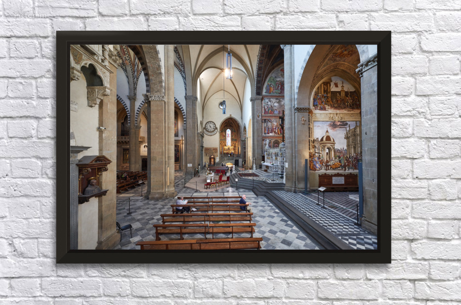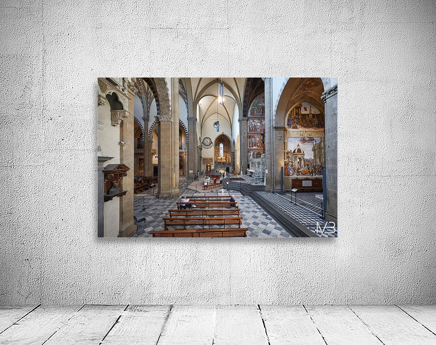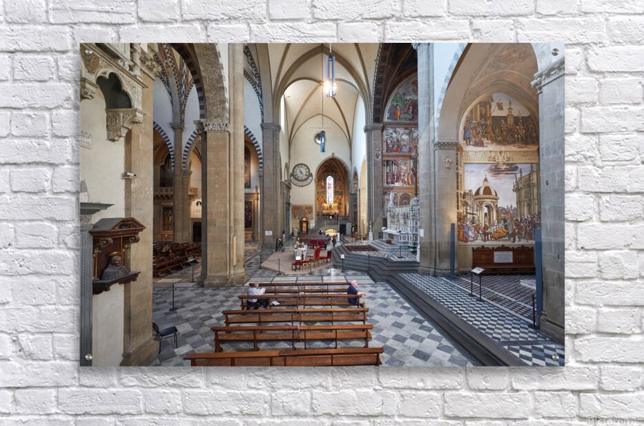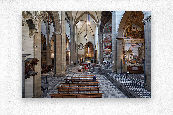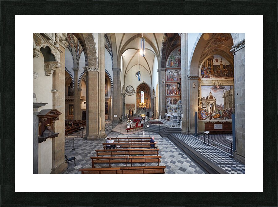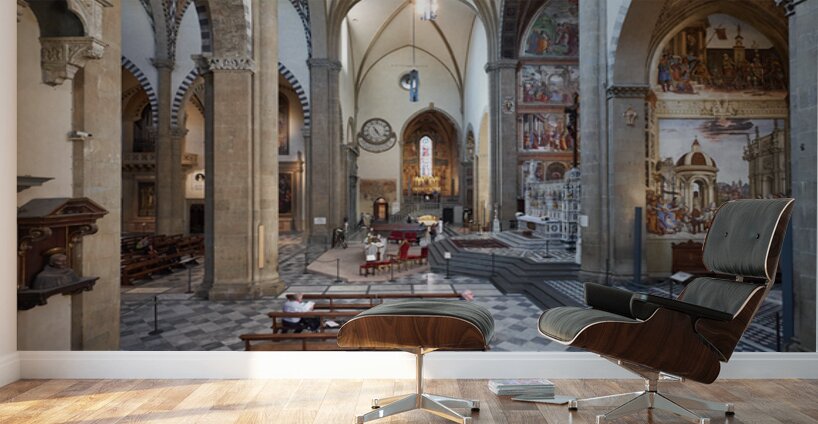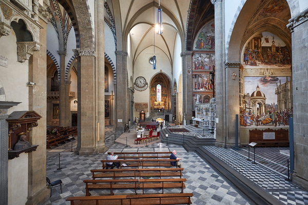 People sit quietly inside Santa Maria Novella Church in Florence Tuscany. The church features art and architecture from various periods.