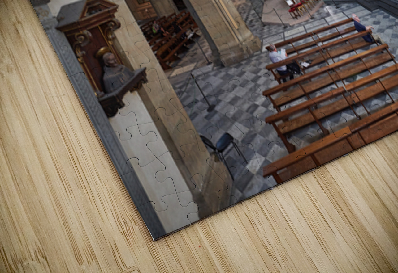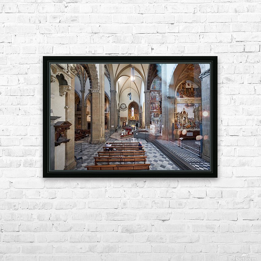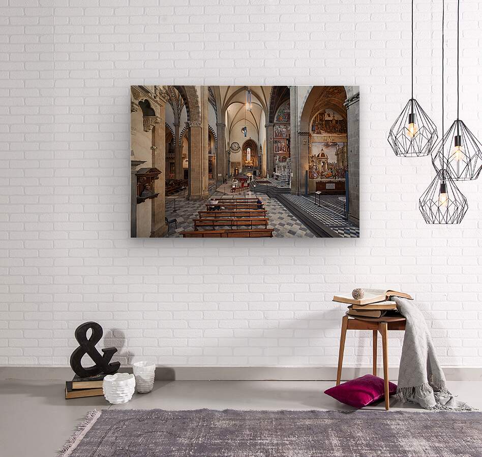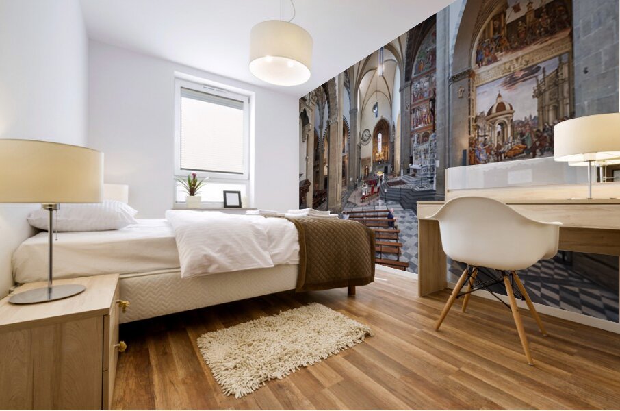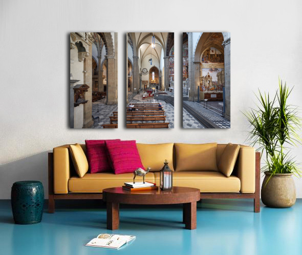 People sit quietly inside Santa Maria Novella Church in Florence Tuscany. The church features art and architecture from various periods.