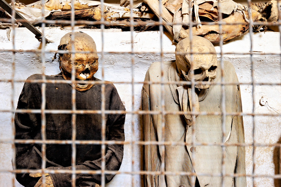 Tourists explore the Capuchin Catacombs in Palermo Sicily where mummies are displayed behind a metal grid for all to see.