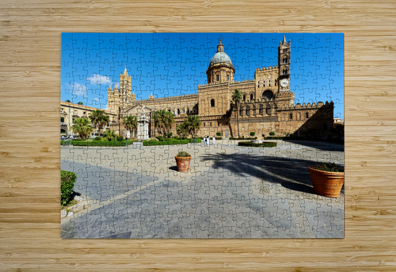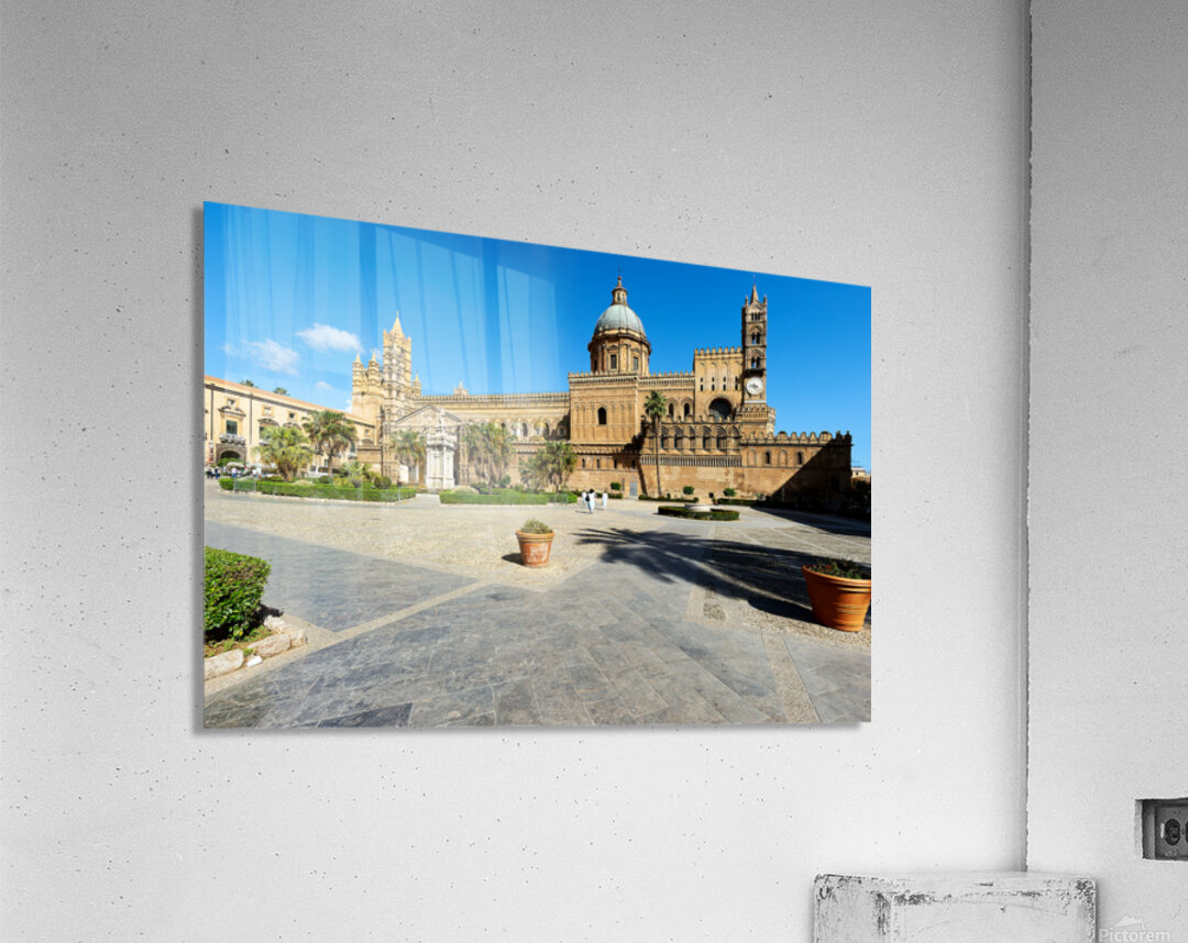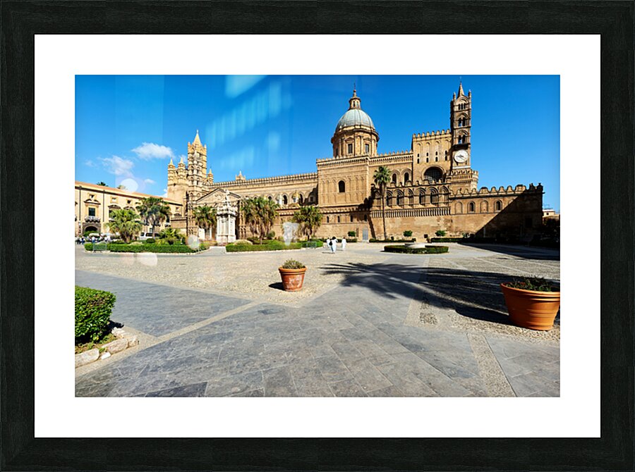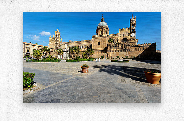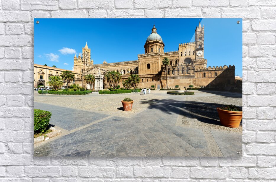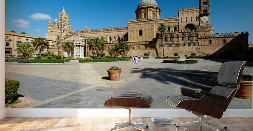 People visit Palermo Cathedral in Sicily. The sun shines on the historic building and surrounding area. Palm trees stand nearby.