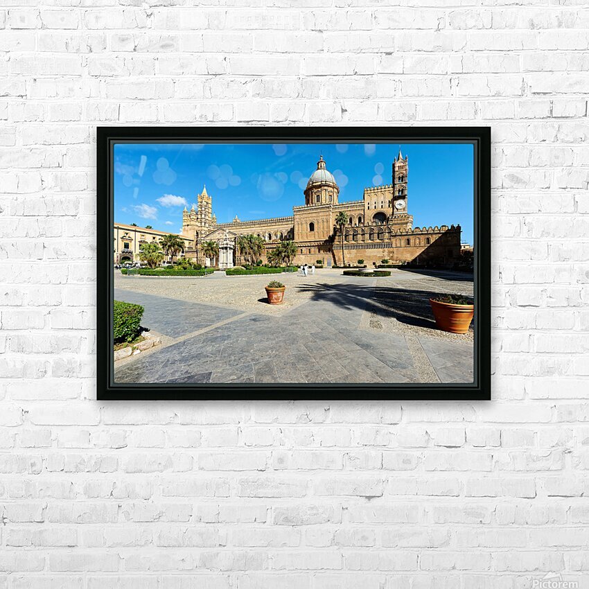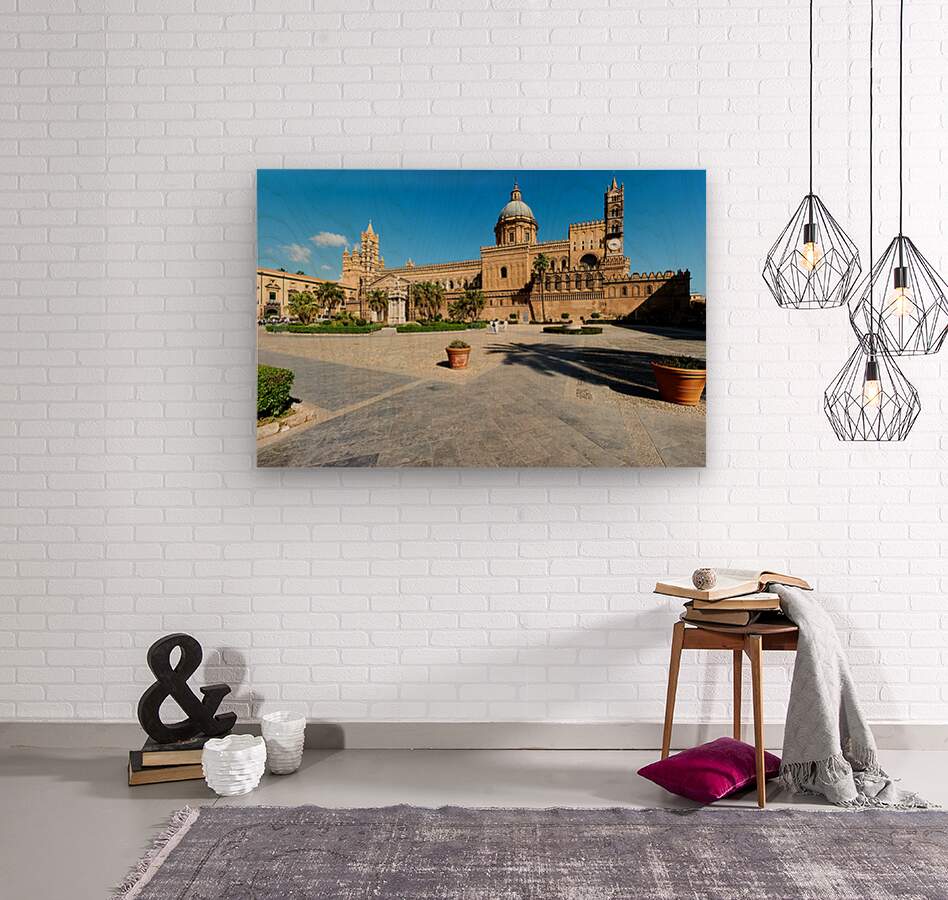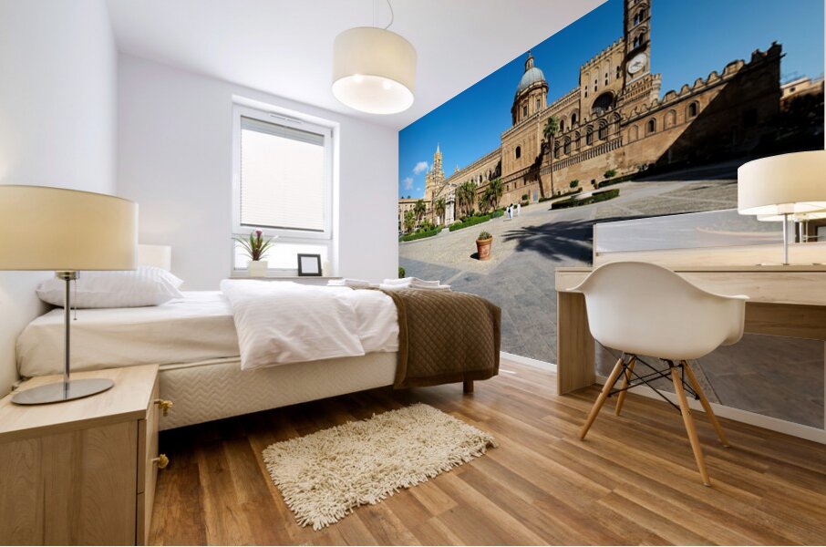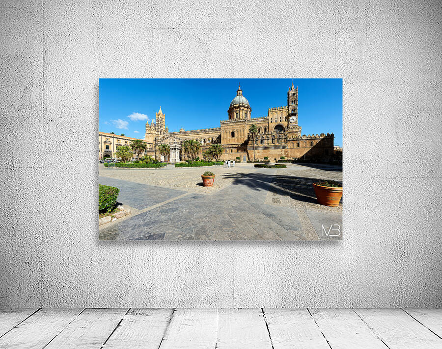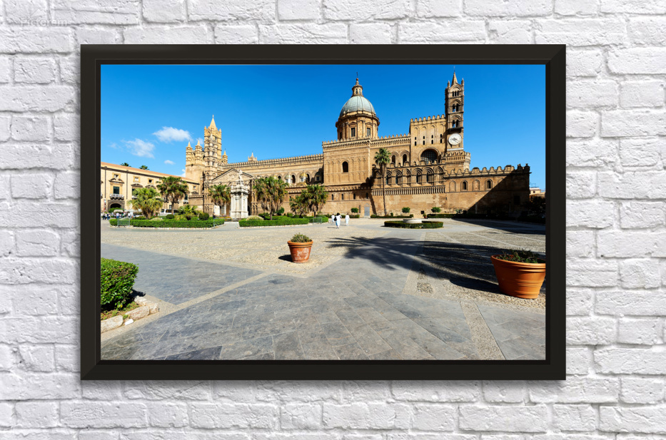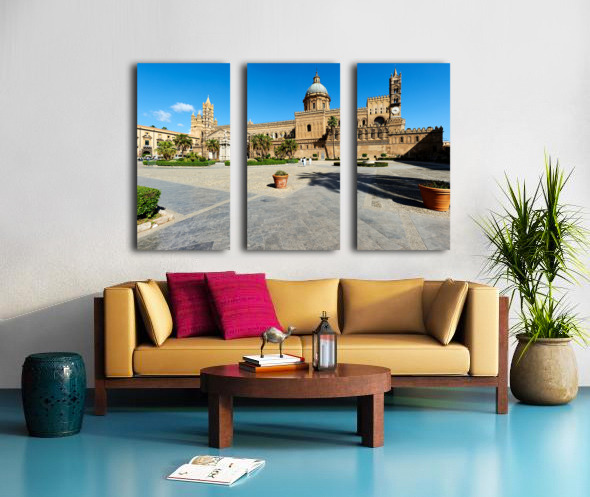 People visit Palermo Cathedral in Sicily. The sun shines on the historic building and surrounding area. Palm trees stand nearby.