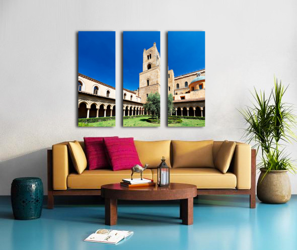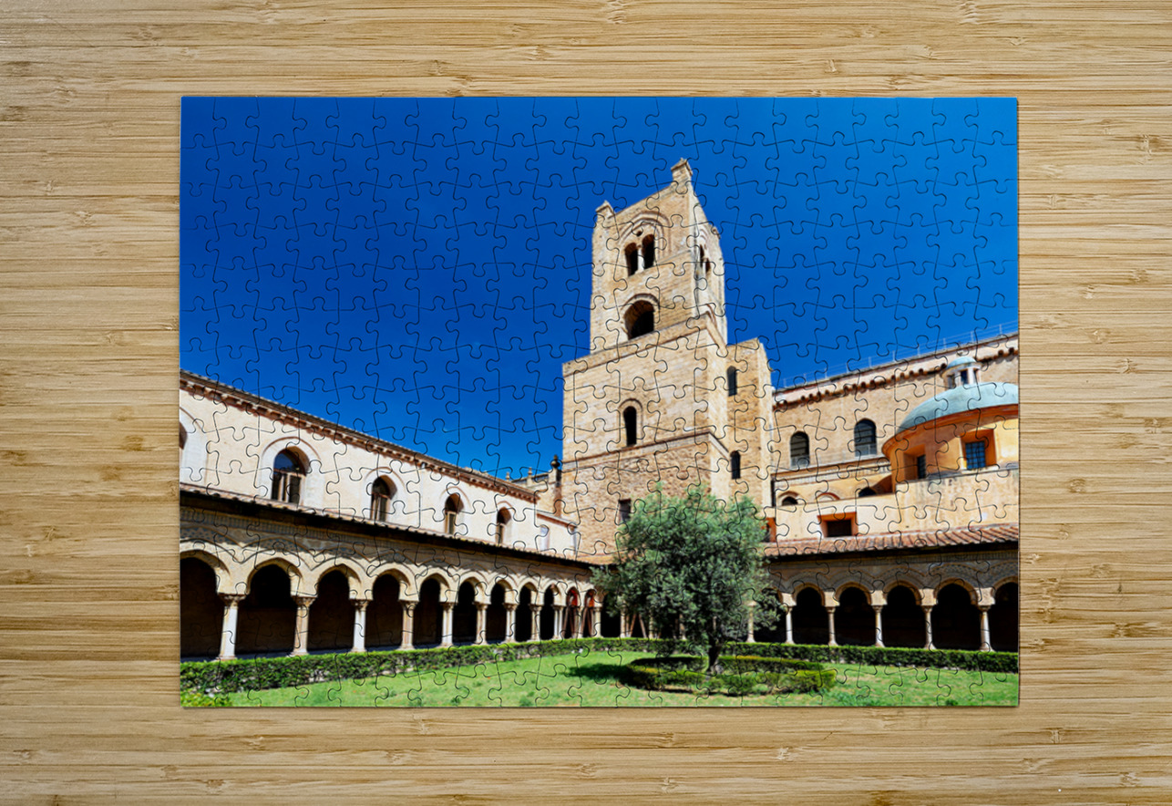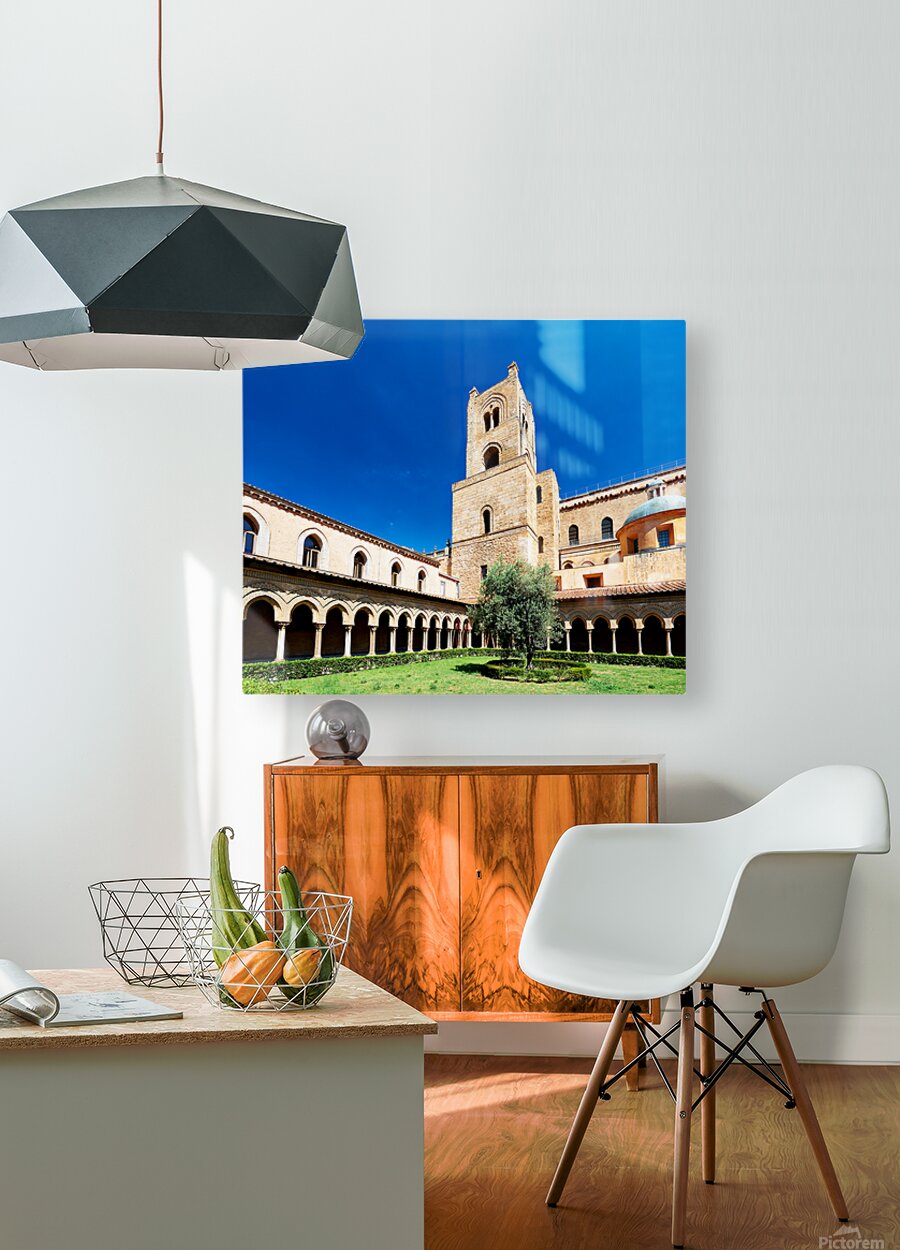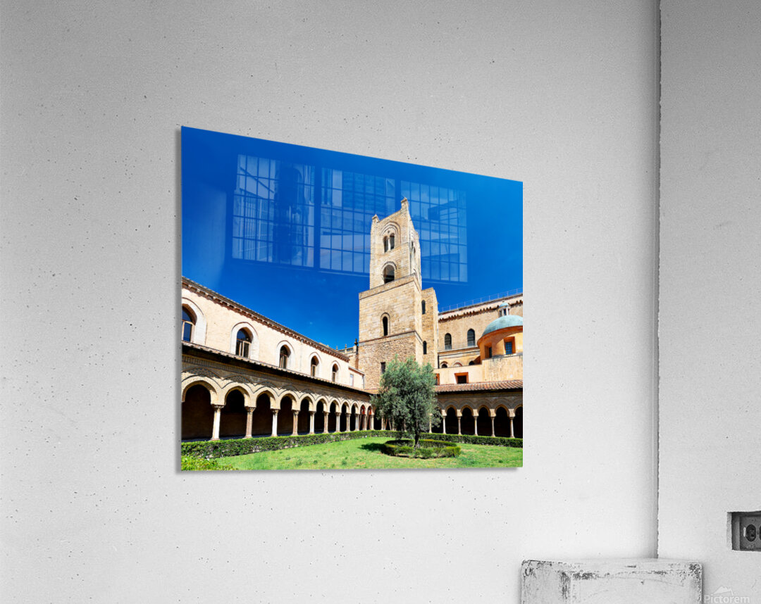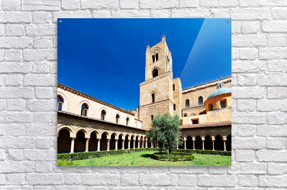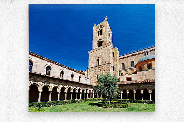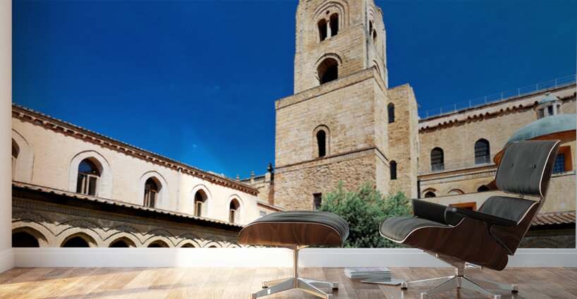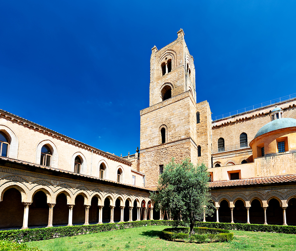 Visitors explore the courtyard of Duomo di Monreale in Palermo Sicily under a clear blue sky. The unique structures attract many tourists.
