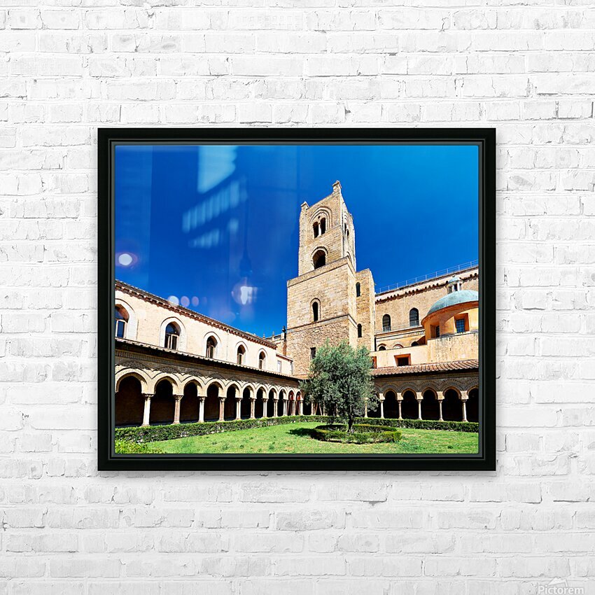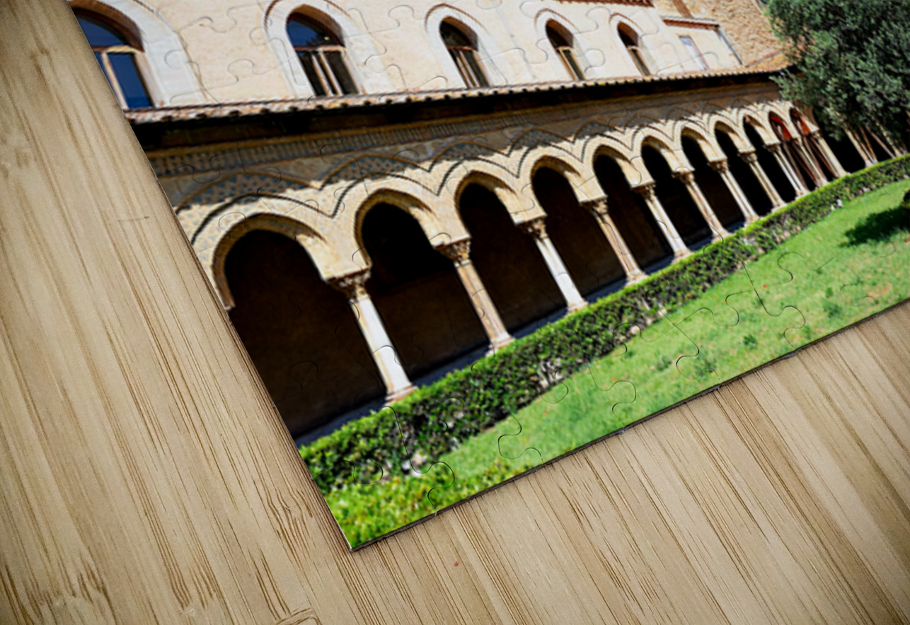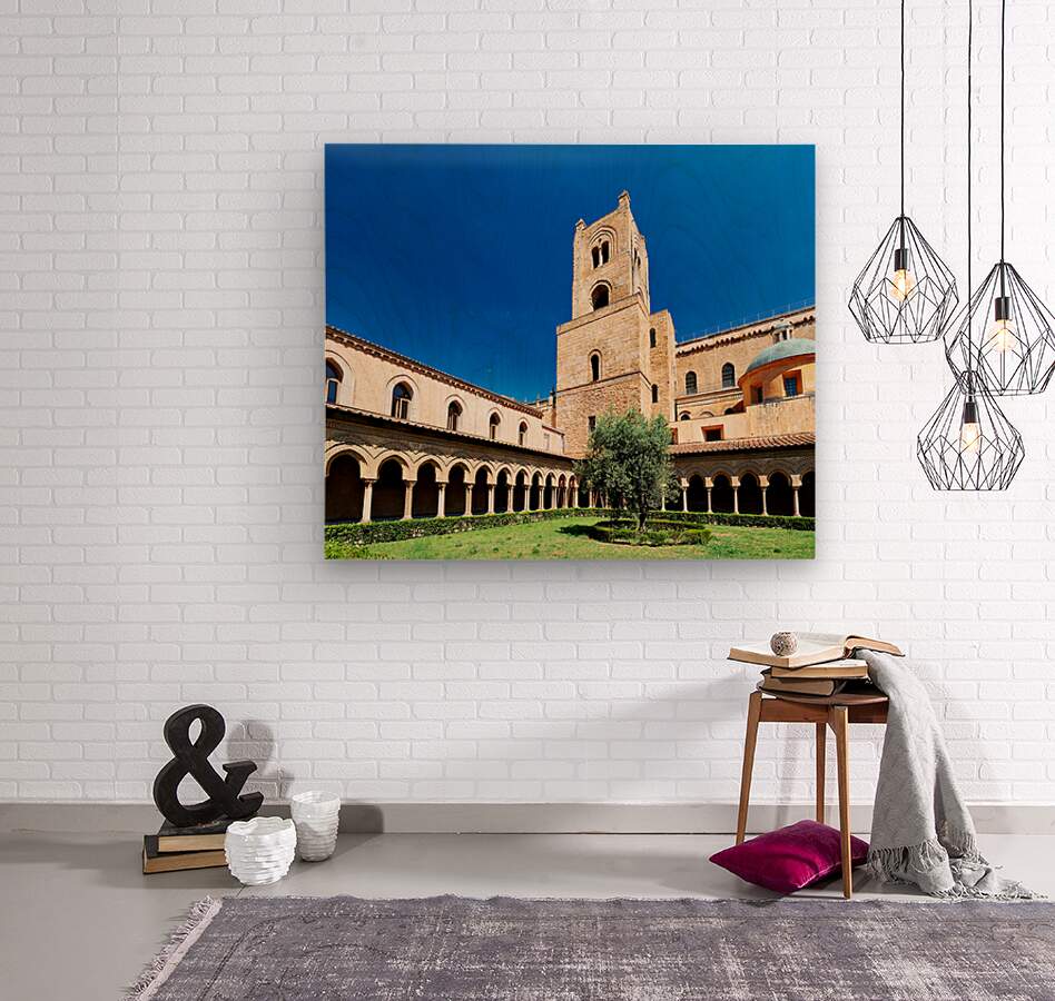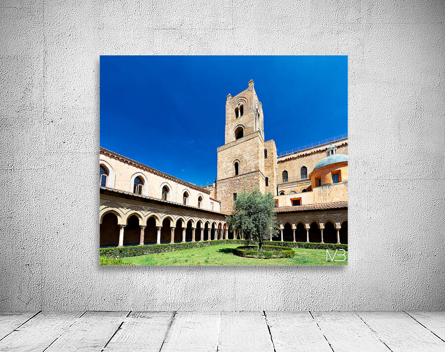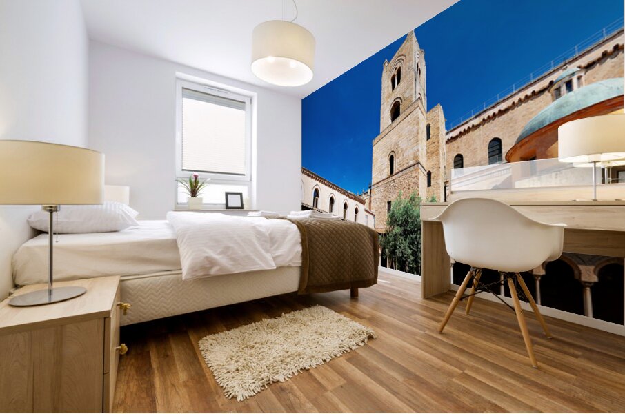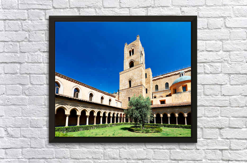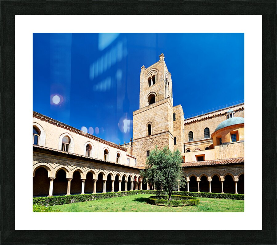 Visitors explore the courtyard of Duomo di Monreale in Palermo Sicily under a clear blue sky. The unique structures attract many tourists.