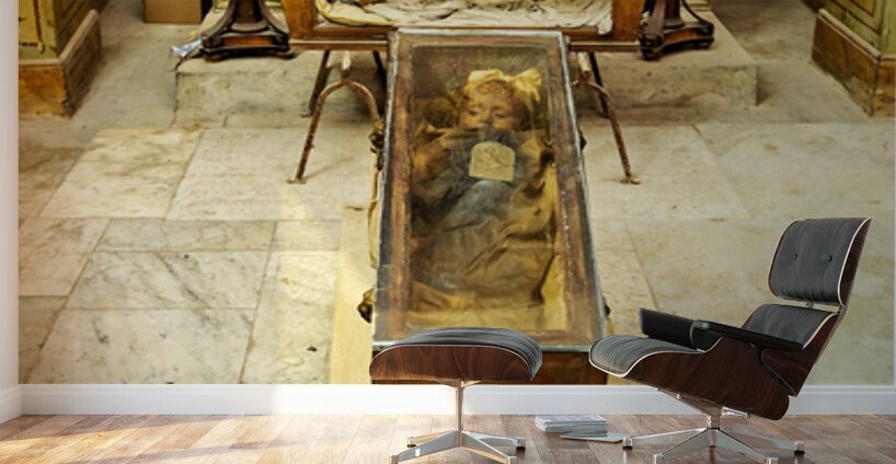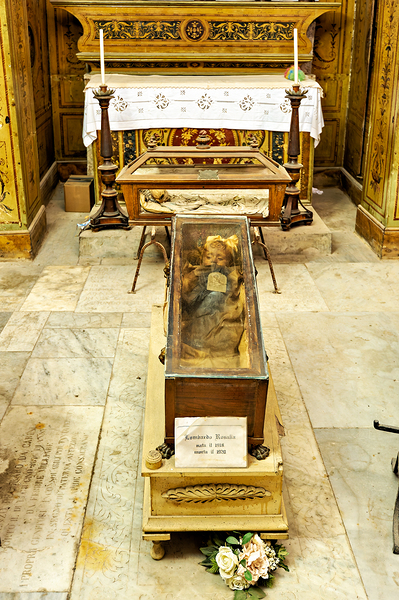A view inside the Capuchin Catacombs in Palermo Sicily showing a burial display of a body in a glass coffin. The setting has candles and a table.