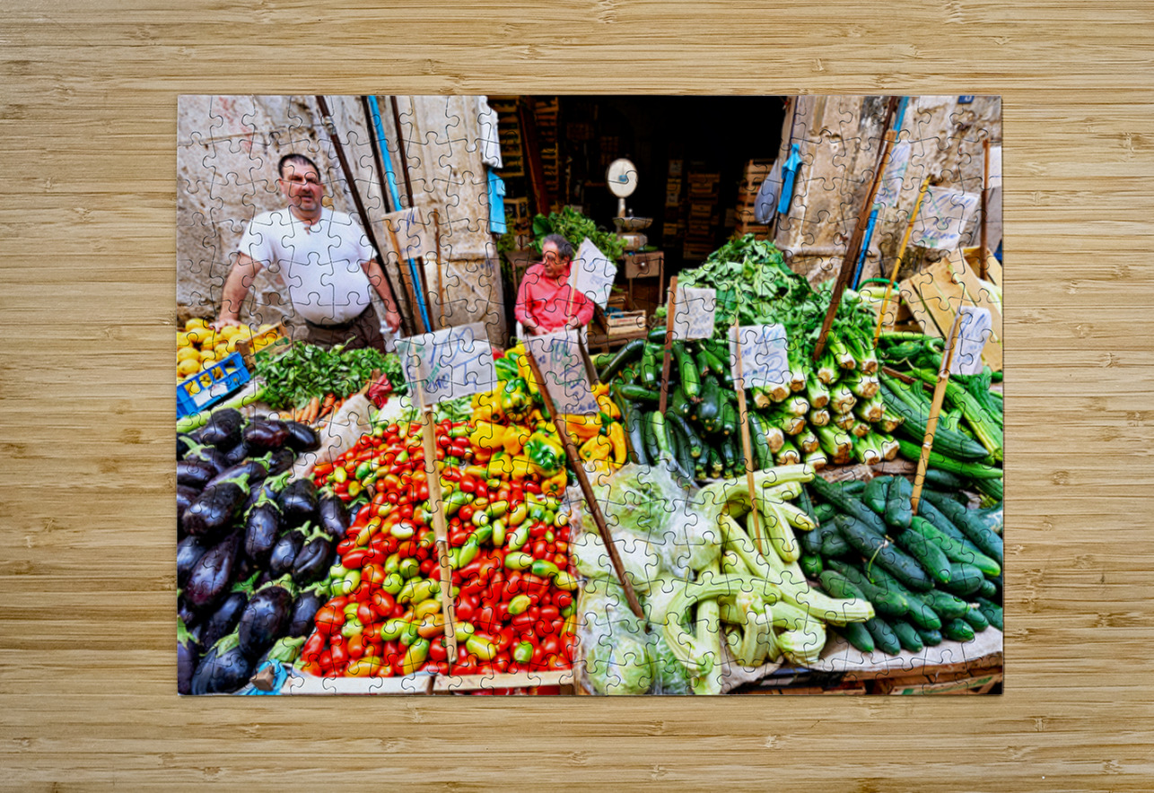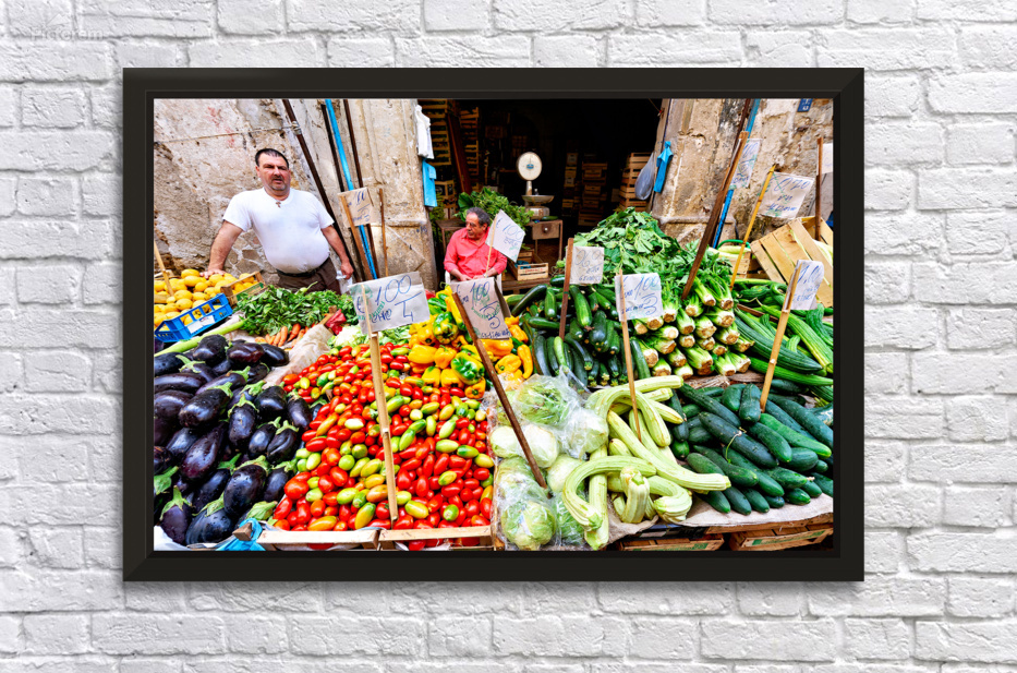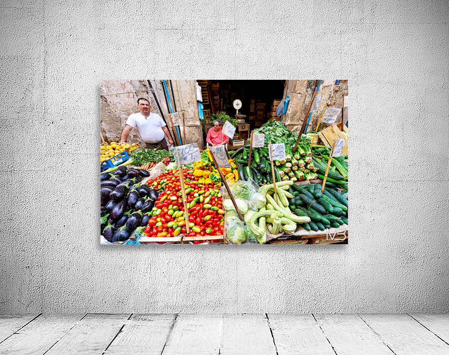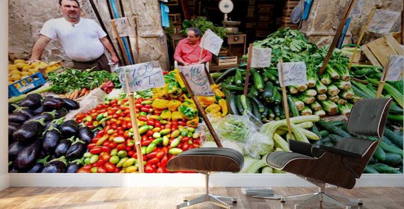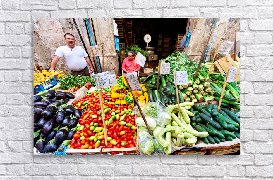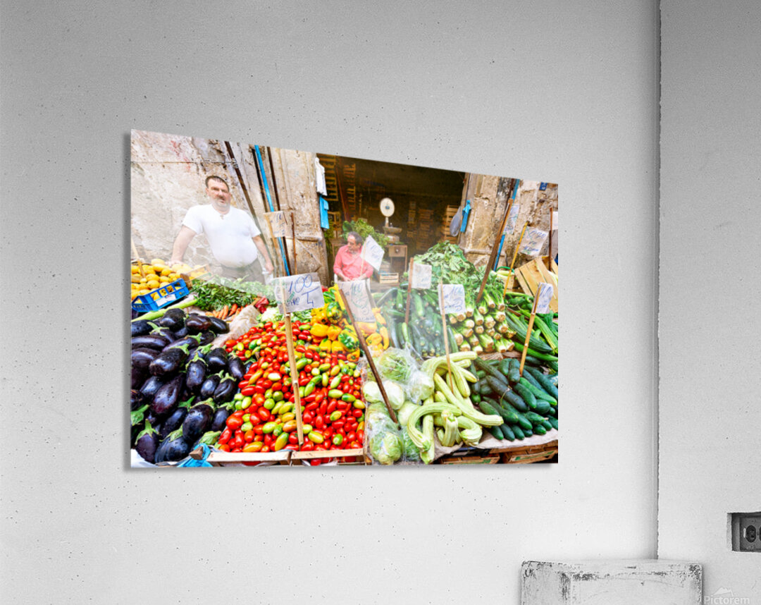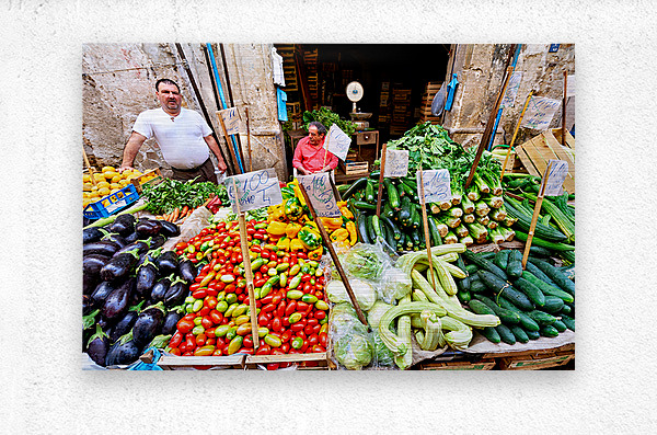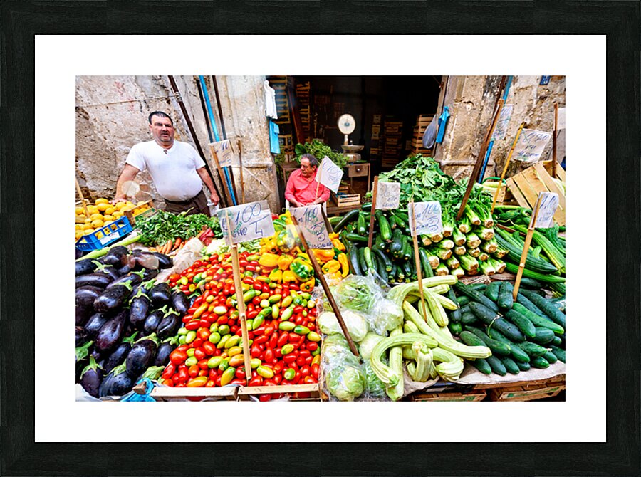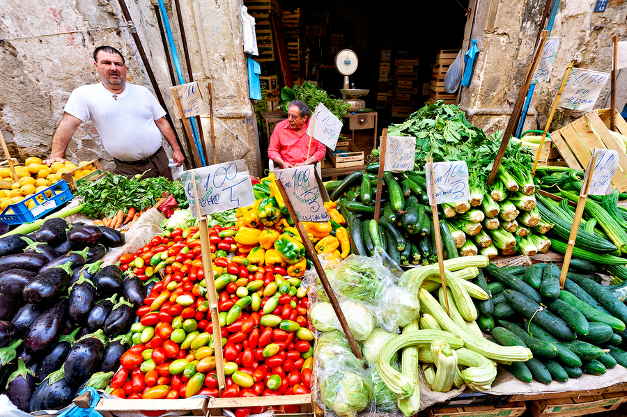 Two vendors stand beside colorful displays of vegetables and fruits at Ballaro street market in Palermo Sicily during the day.