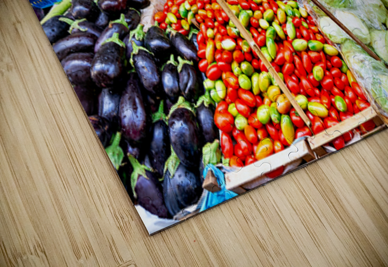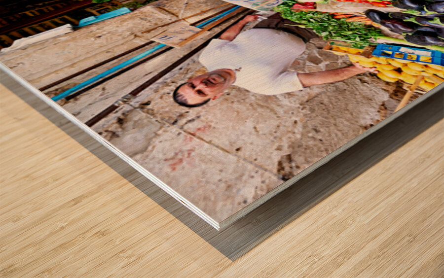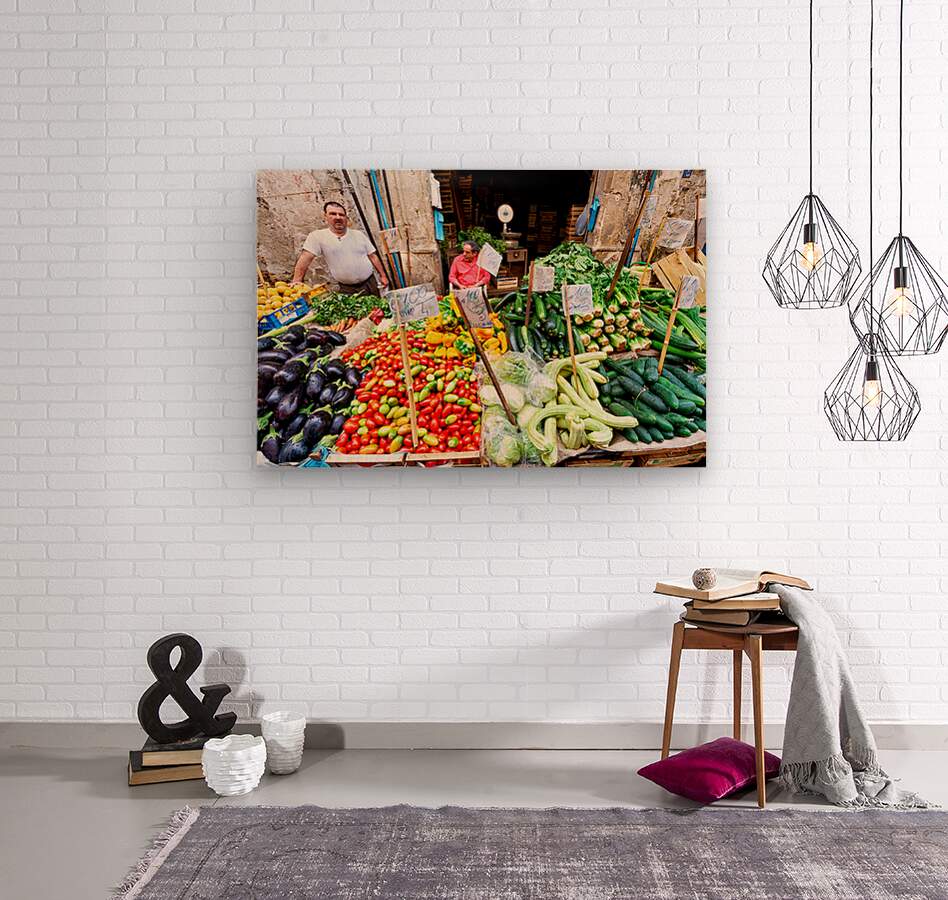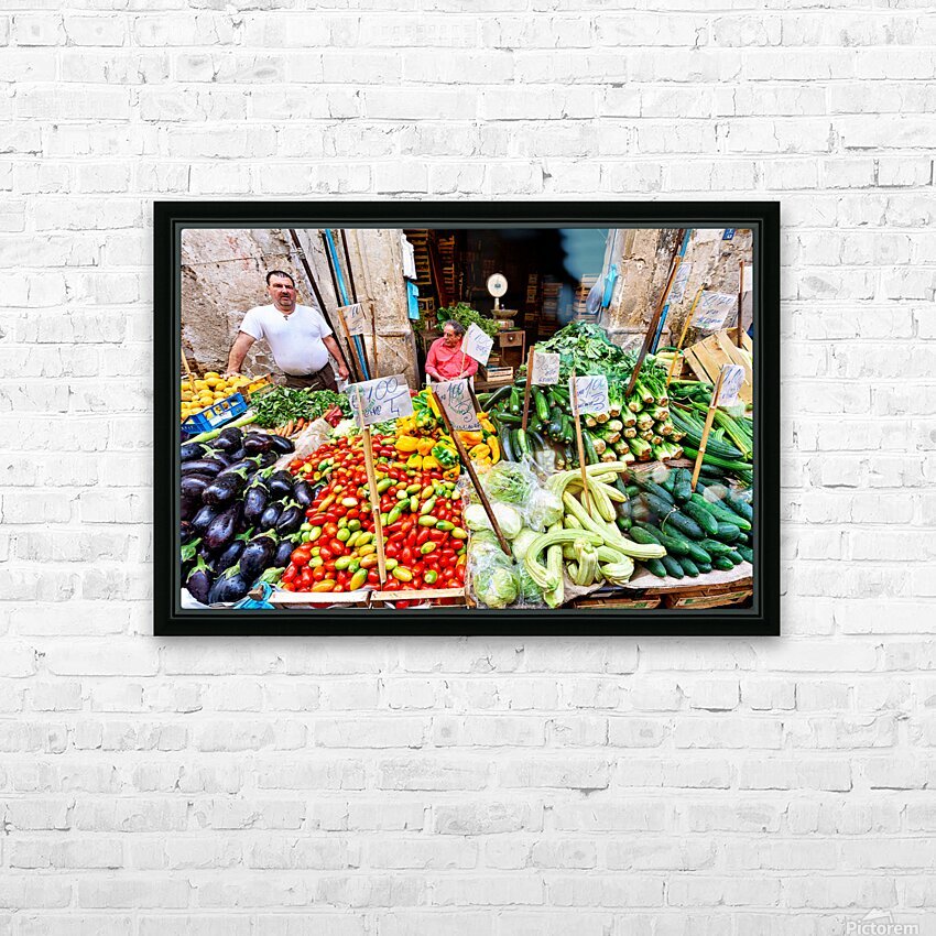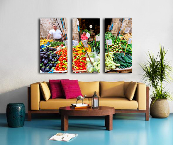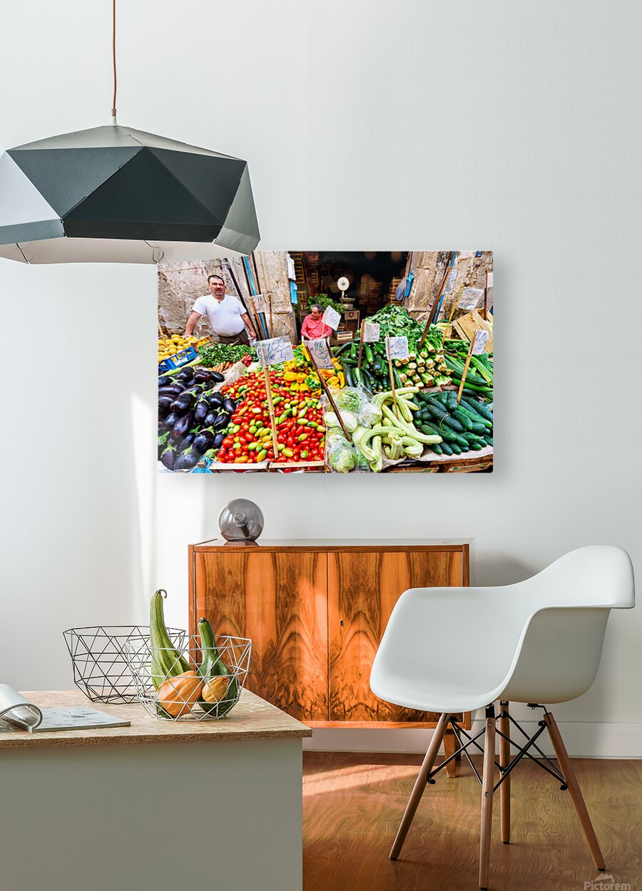 Two vendors stand beside colorful displays of vegetables and fruits at Ballaro street market in Palermo Sicily during the day.