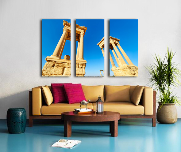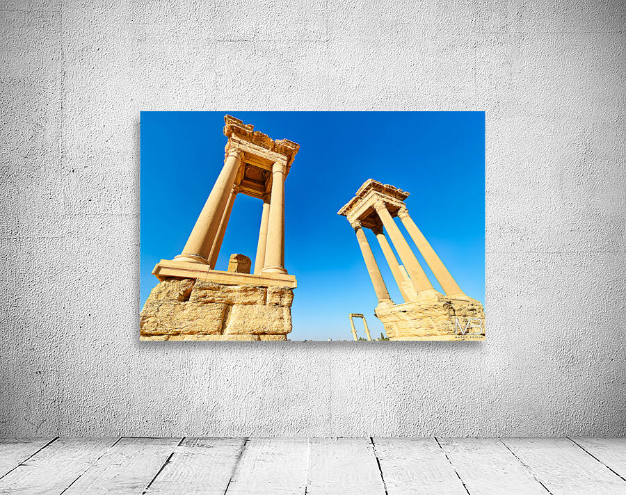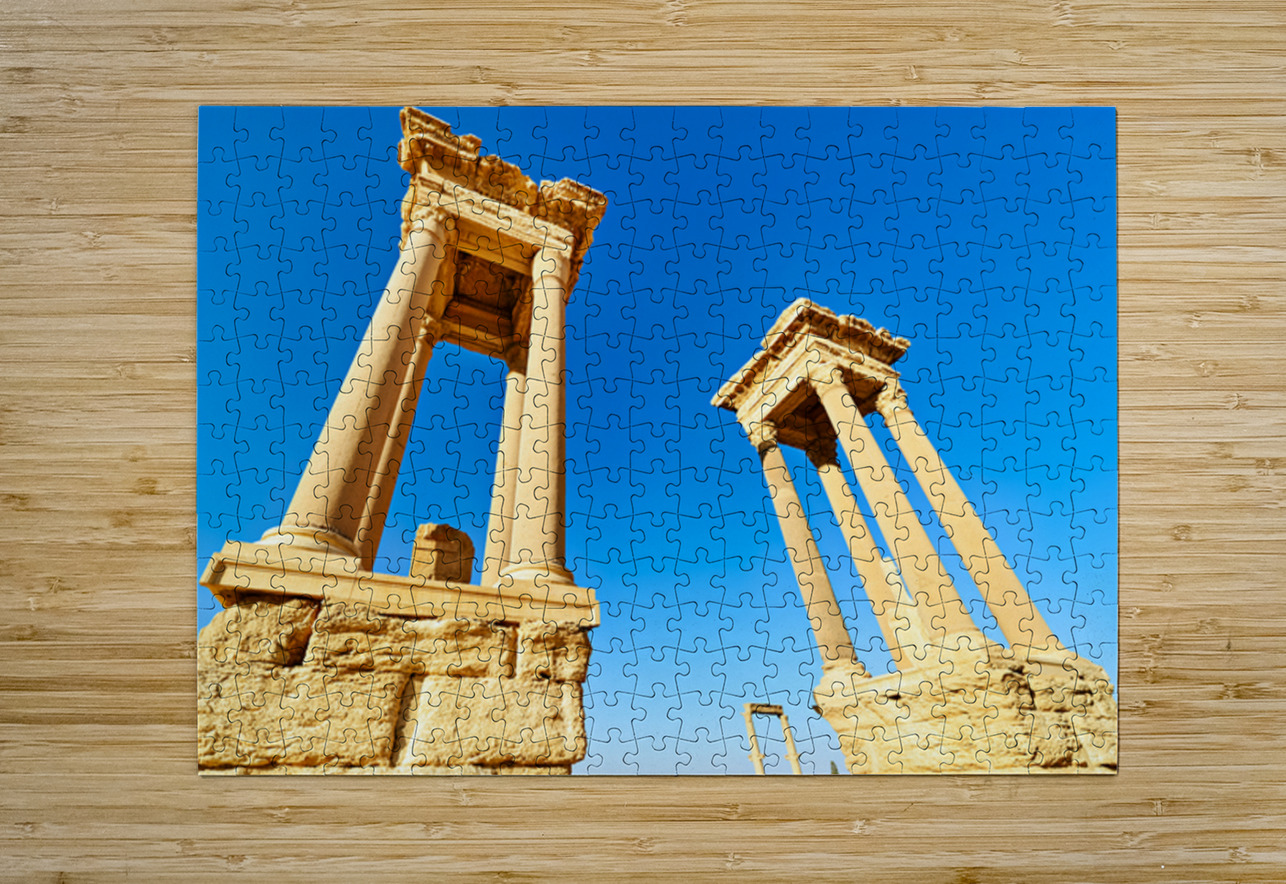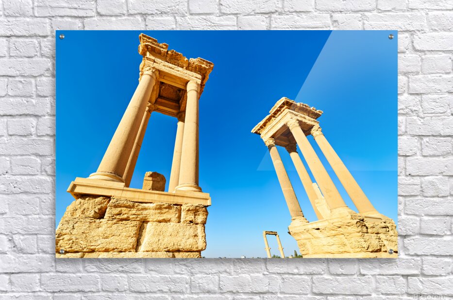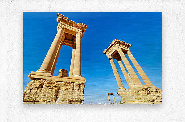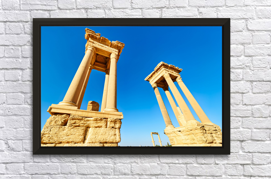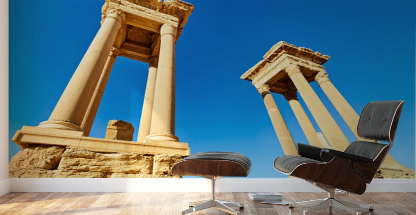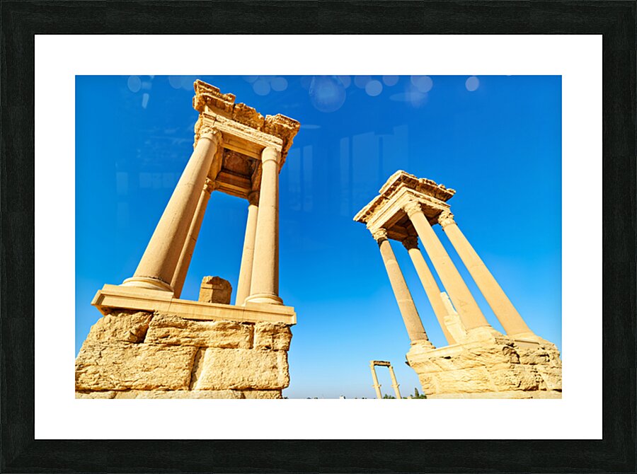 Tall columns stand firm in the ancient city of Palmyra in Syria. Visitors enjoy the impressive architecture and history at the site.