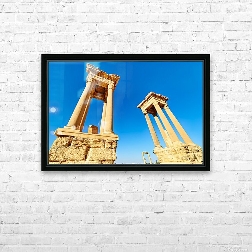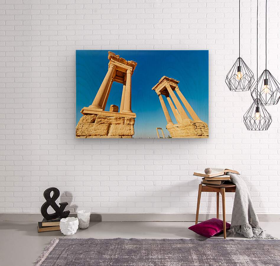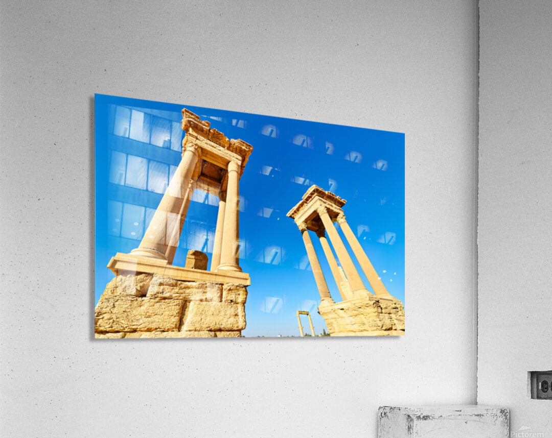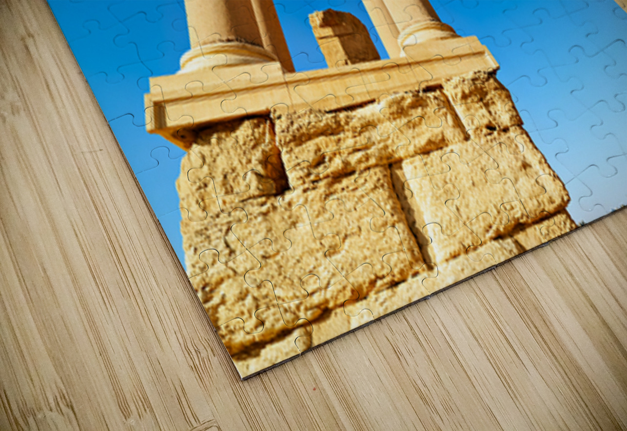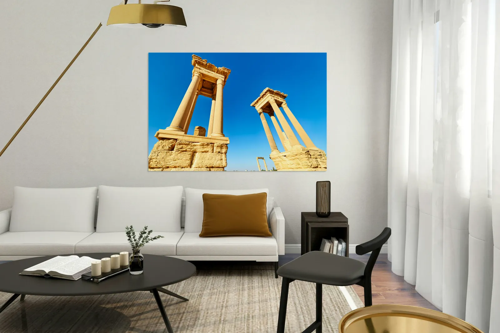 Tall columns stand firm in the ancient city of Palmyra in Syria. Visitors enjoy the impressive architecture and history at the site.