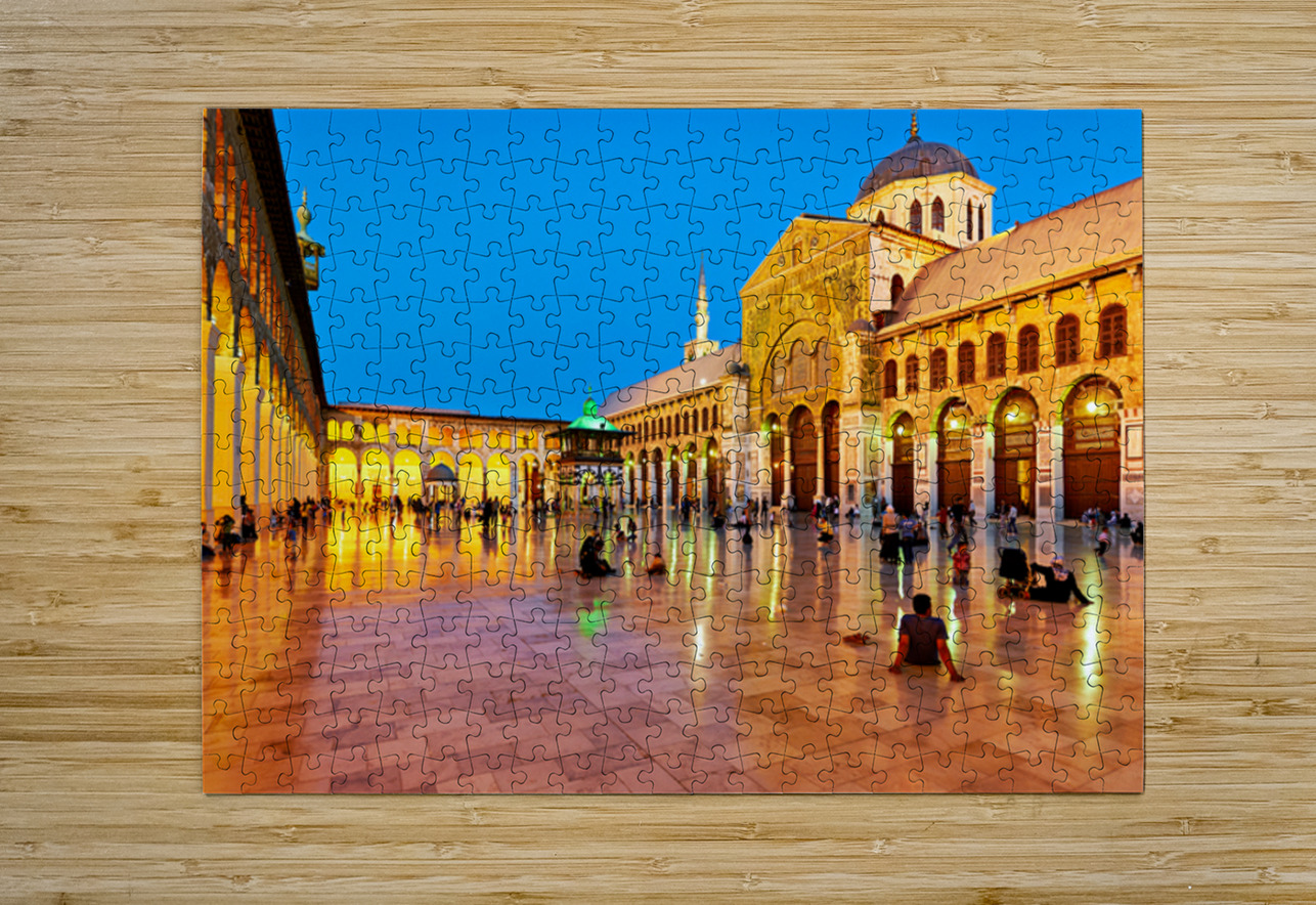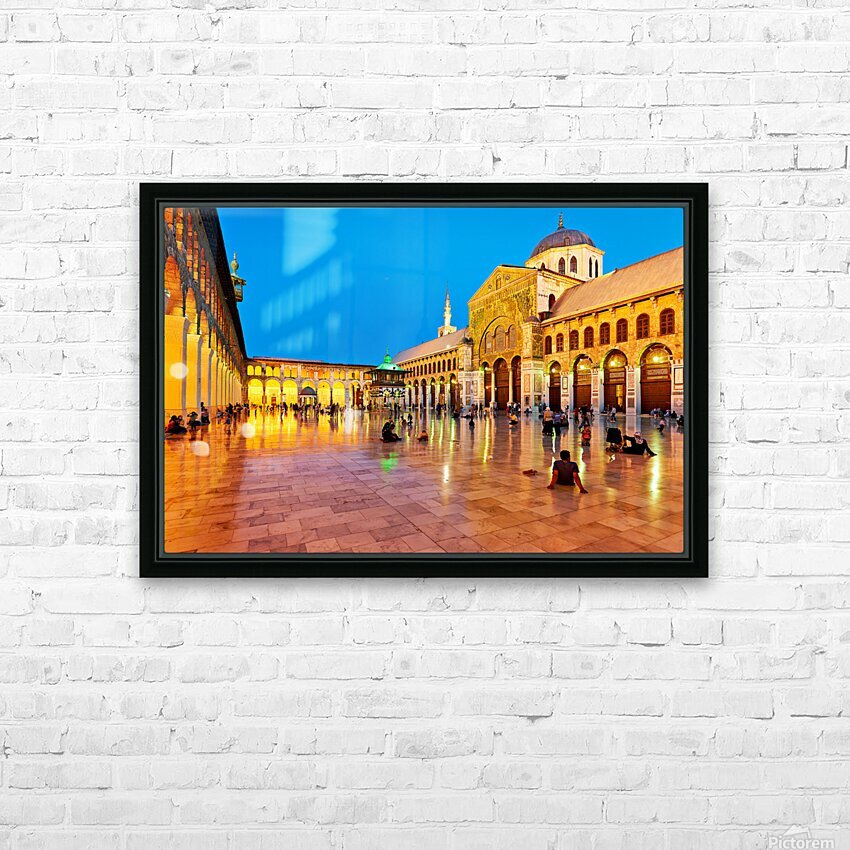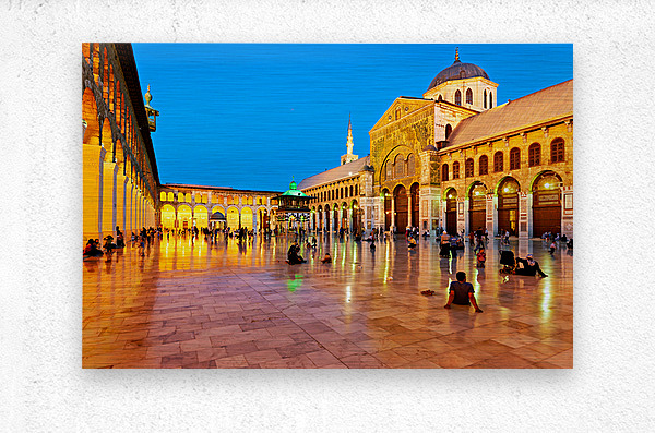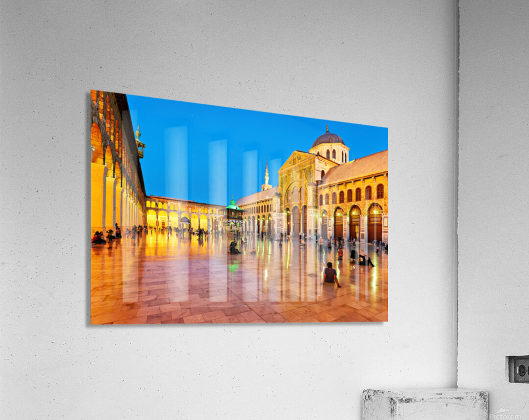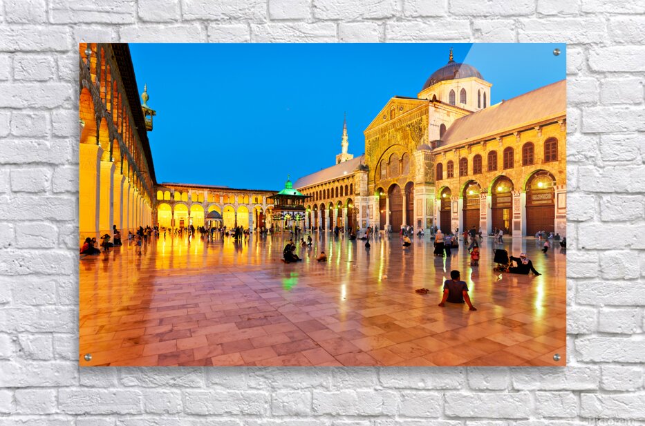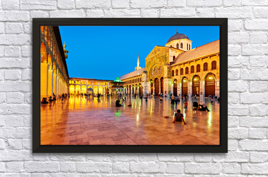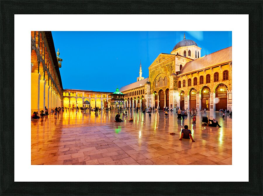 "Visit to Umayyad Mosque at night in Damascus Syria" in a framed print.