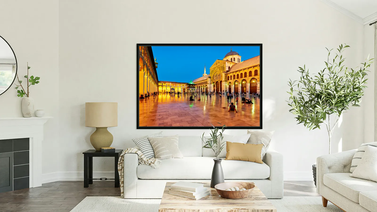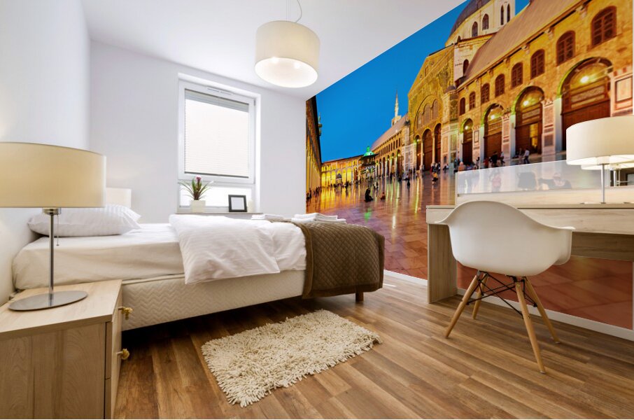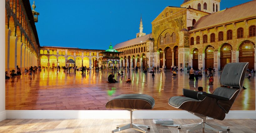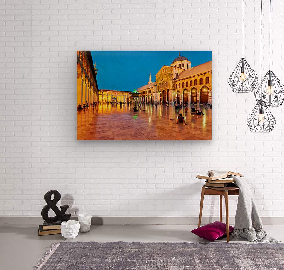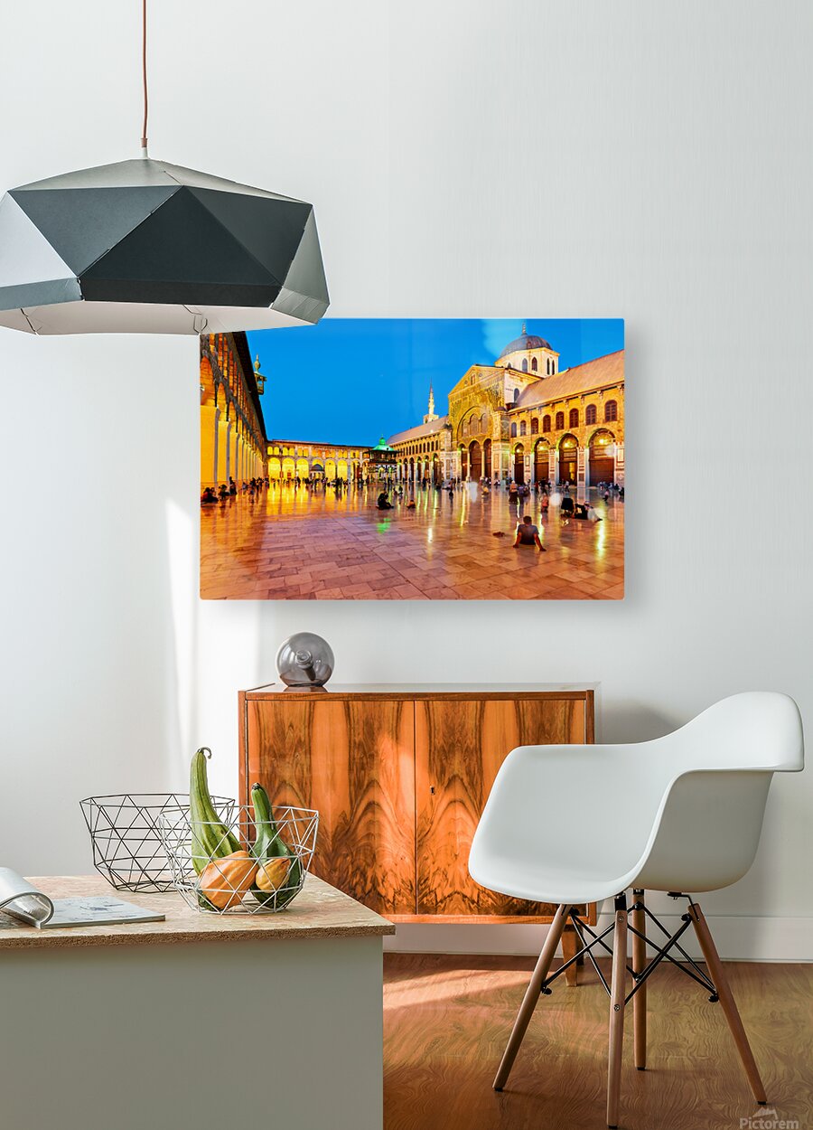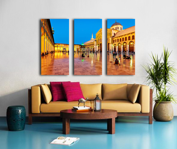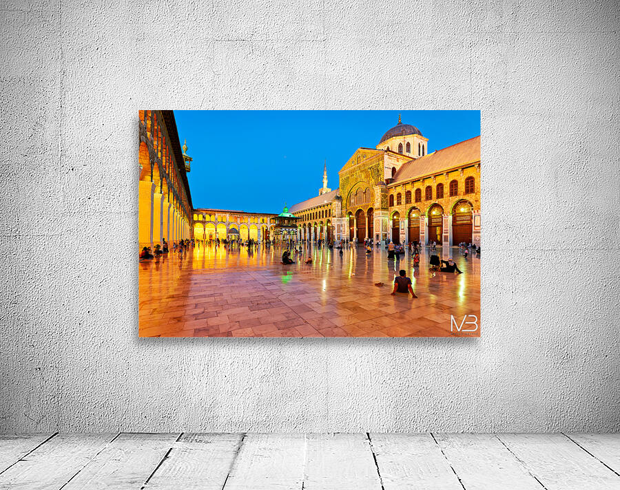 "Visit to Umayyad Mosque at night in Damascus Syria" in a framed print.