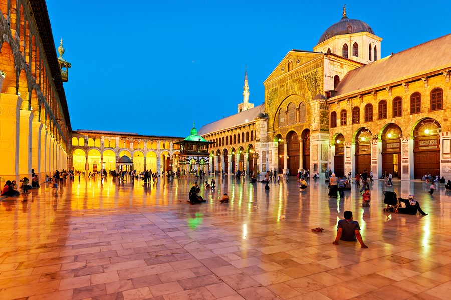 People gather in the courtyard of Umayyad Mosque at night. The lights illuminate the mosque and the atmosphere is lively and social.