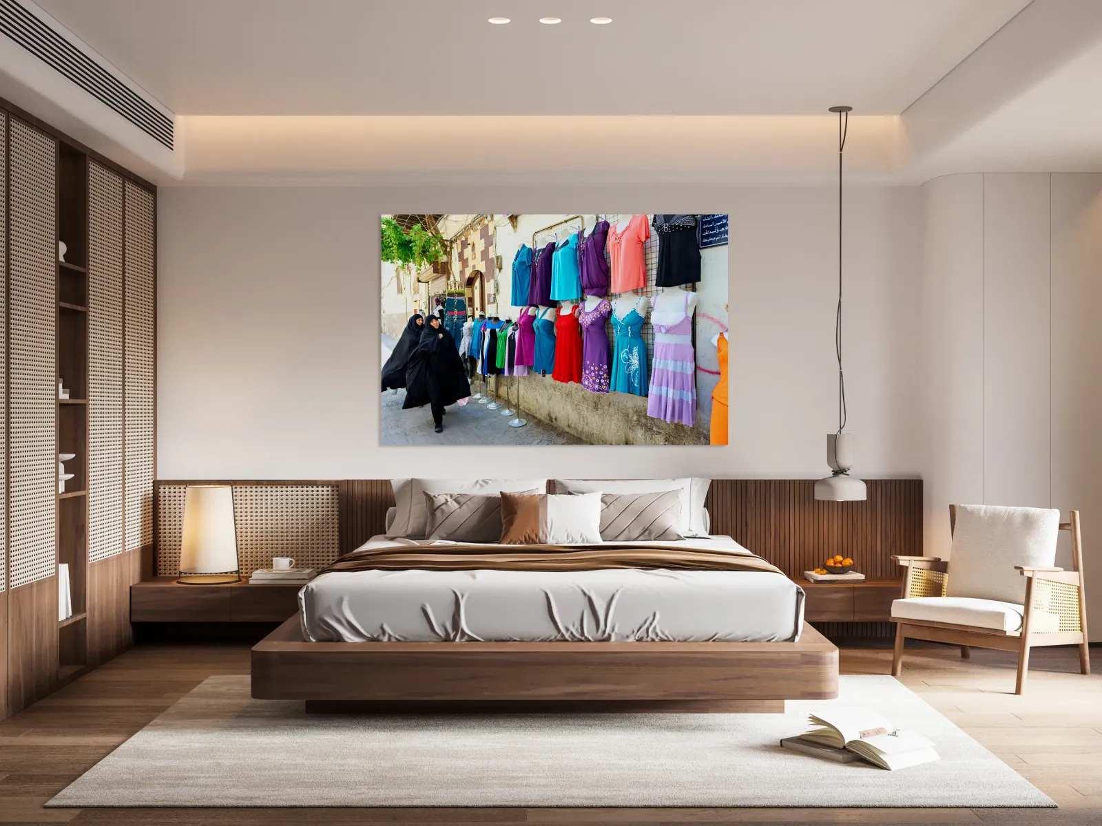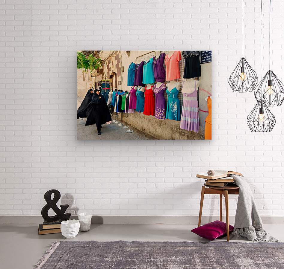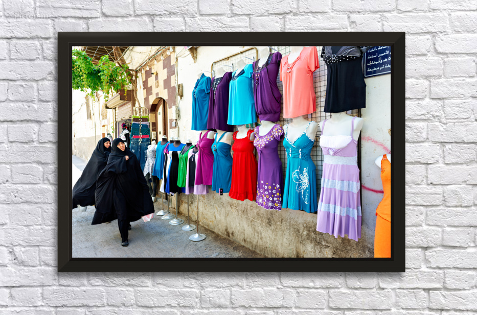 Women in traditional dress walk along a street in Damascus. They pass shops displaying various colorful clothing on mannequins.