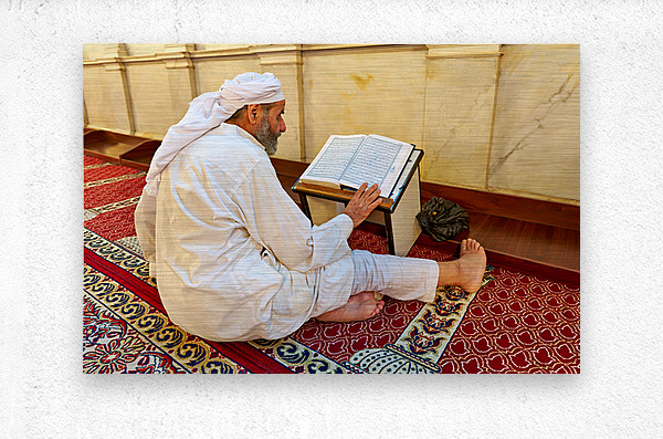 ABOUT THIS ARTWORK: ELDERLY MAN READING QURAN INSIDE UMAYYAD MOSQUE IN DAMASCUS SYRI