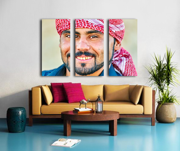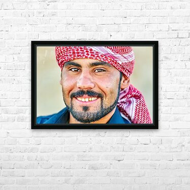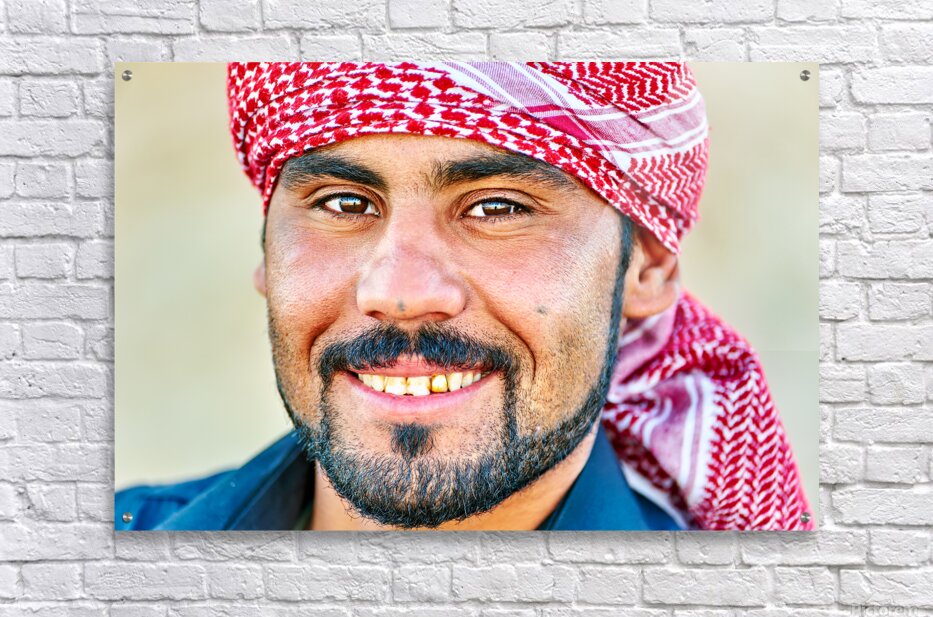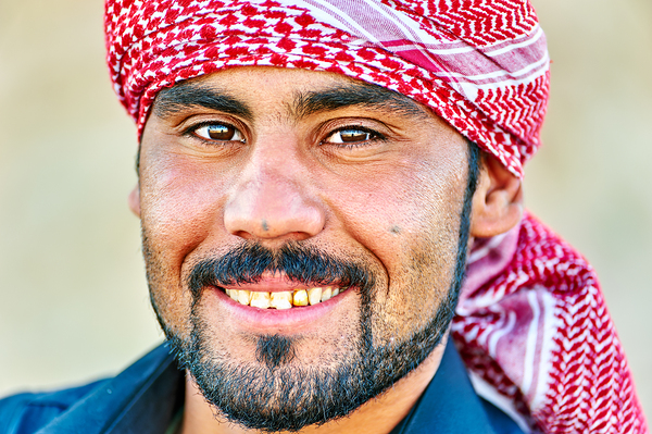 A young man smiles while wearing a red and white headscarf in Syria. His expression shows warmth and friendliness in a casual setting.