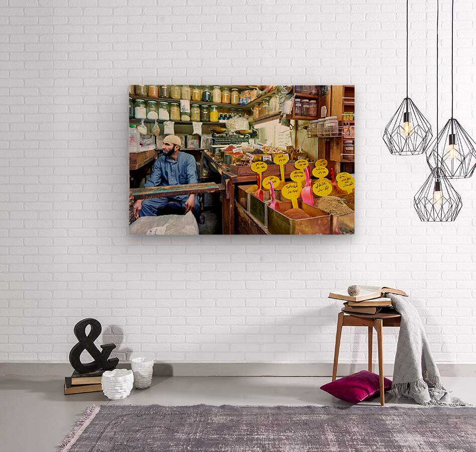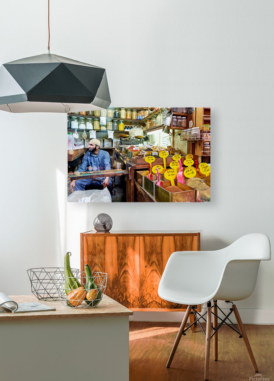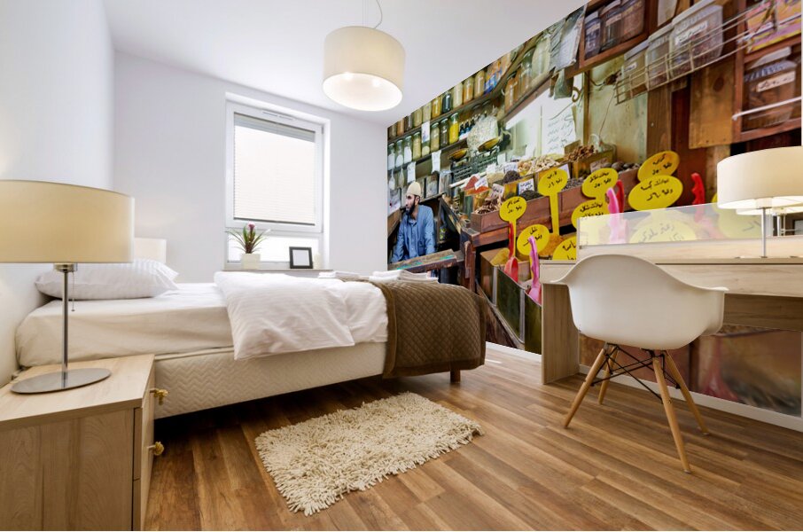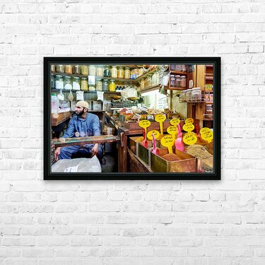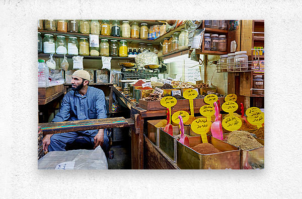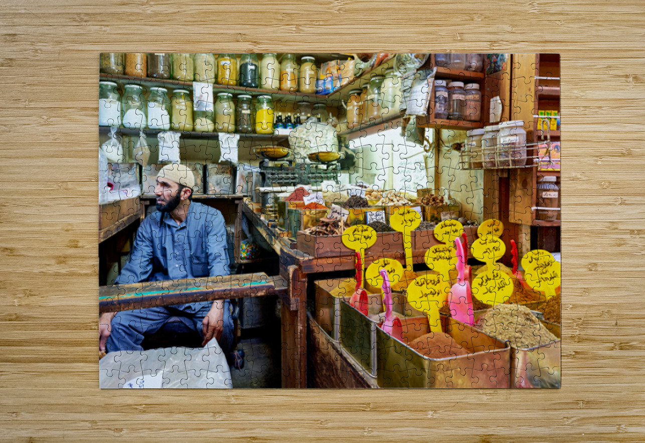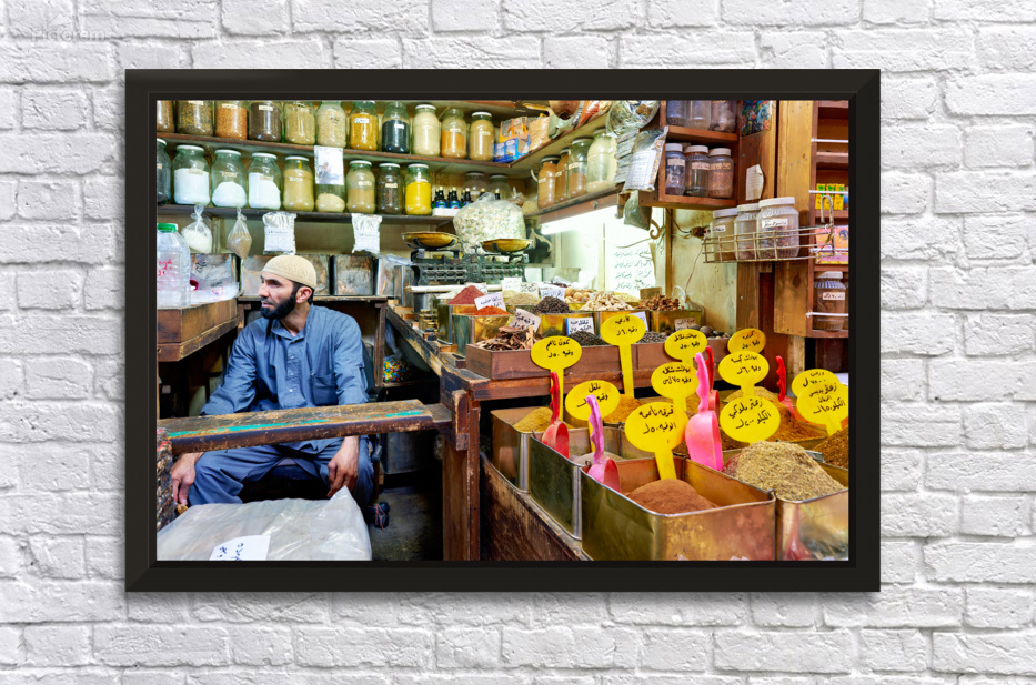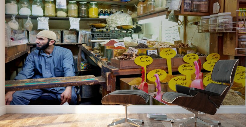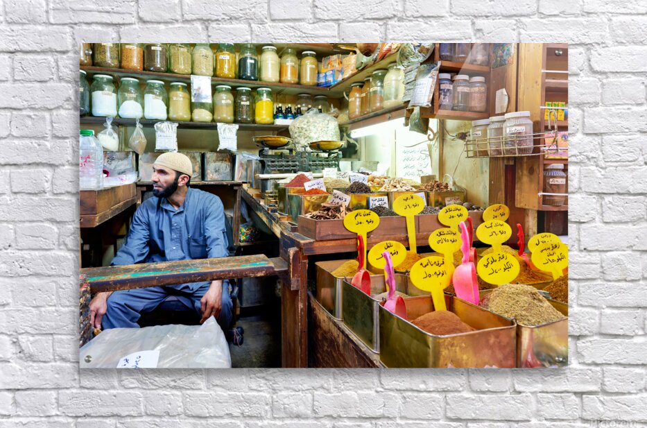 A vendor sits among jars and containers of spices in Al-Hamidiyah Souq. Customers browse and shop in the busy market in Damascus.