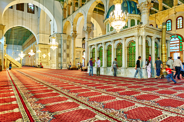 People walk around the spacious interior of Umayyad Mosque in Damascus. The area has beautiful arches and a rich carpet.