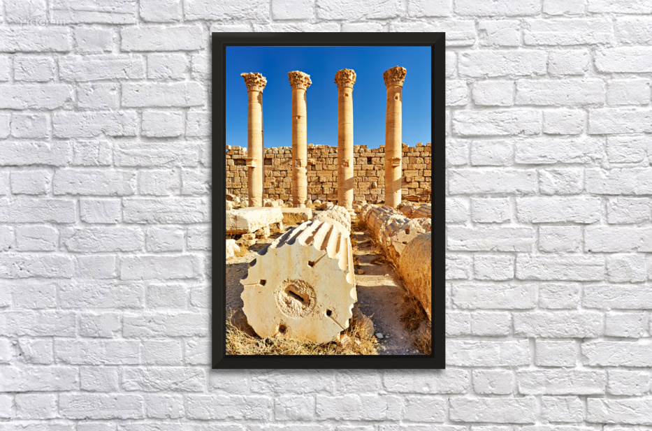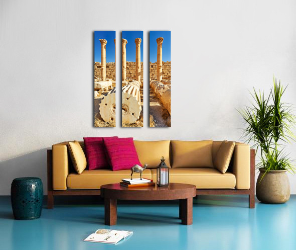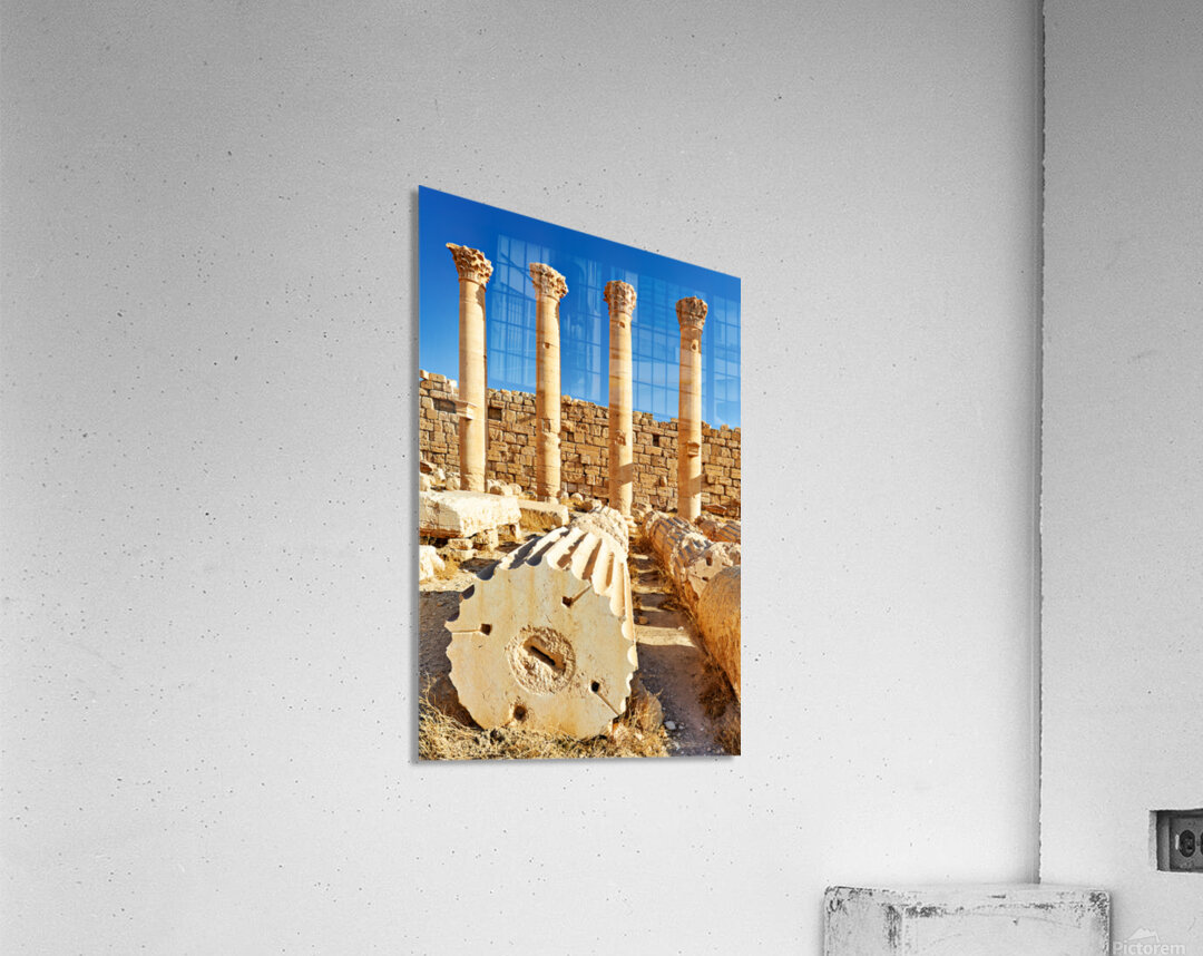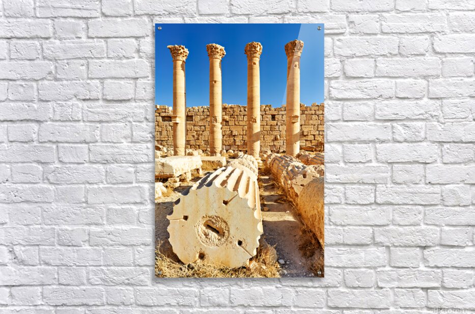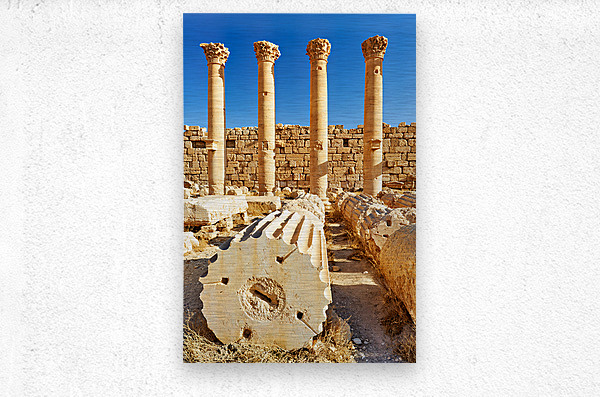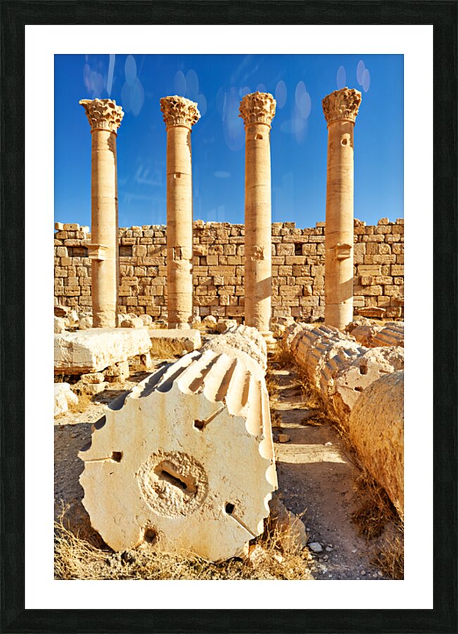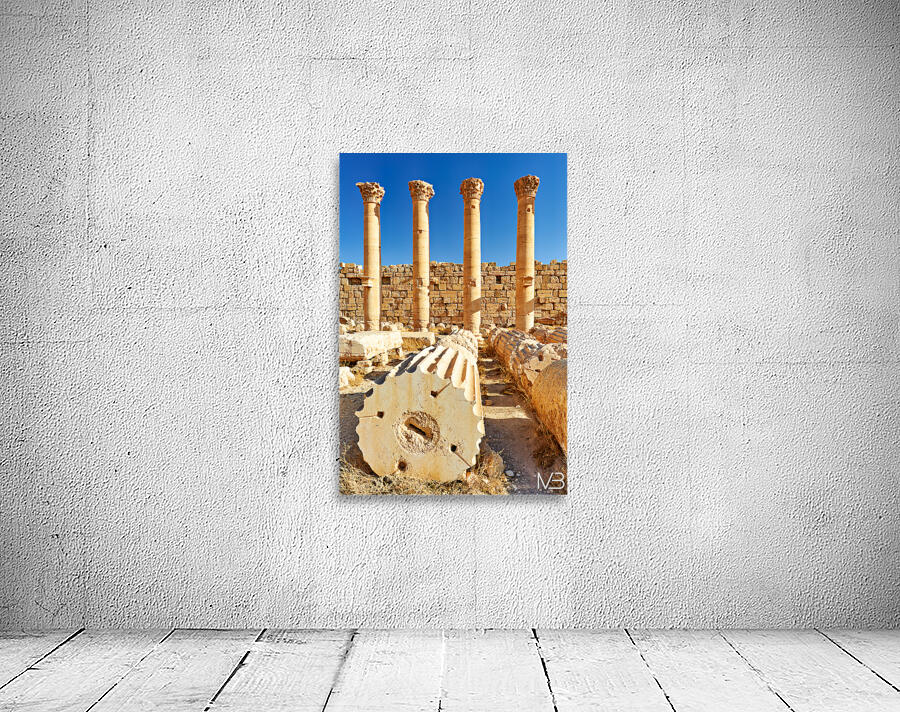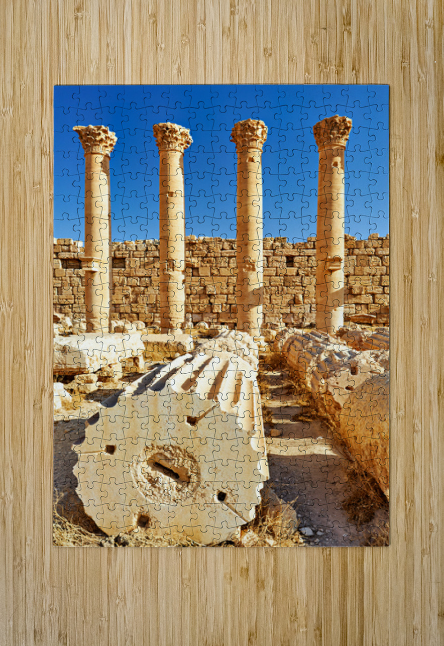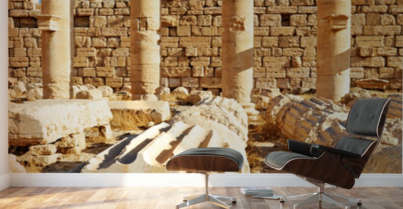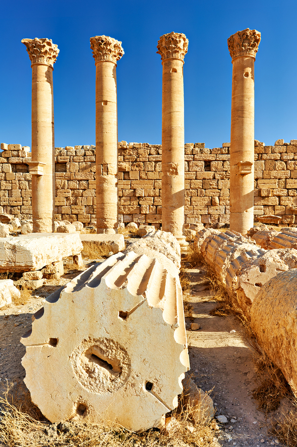 Columns stand tall among the ruins of the Temple of Bel in Palmyra Syria. The site shows parts of fallen structures and ancient stone.