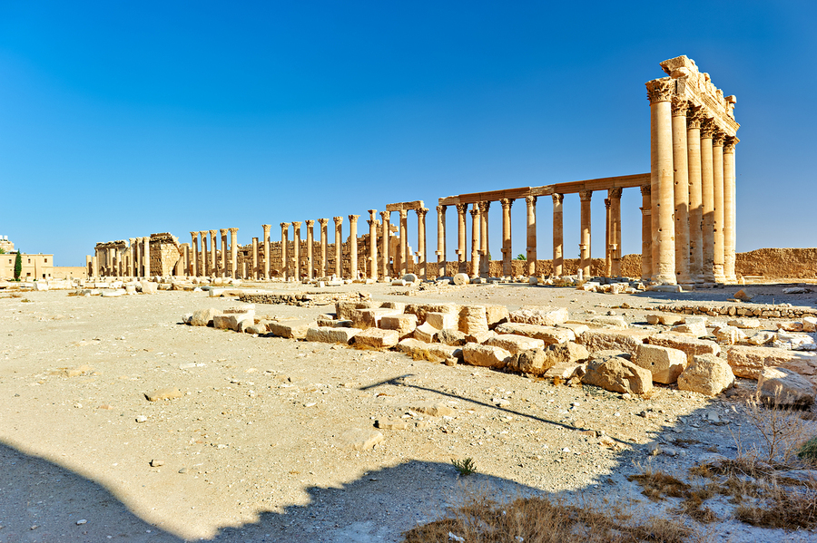 Visitors walk through the ruins of Palmyra in Syria exploring the Temple of Bel and other ancient structures under a clear blue sky.