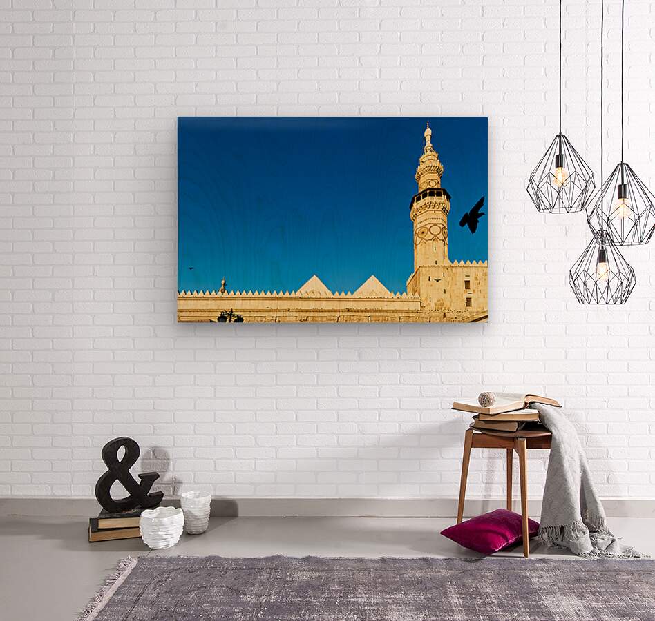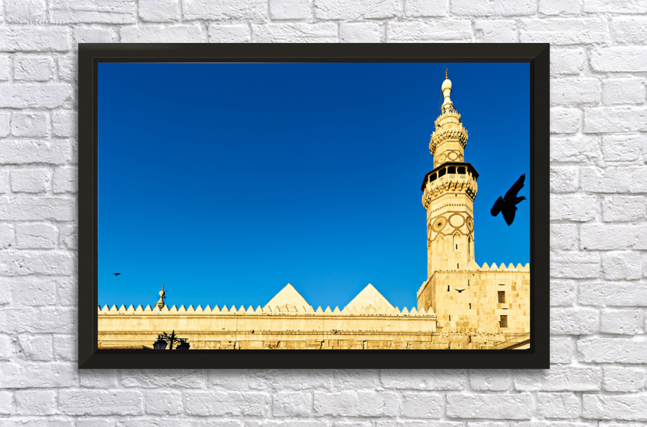 "Mosque tower in Damascus against clear blue sky" in a framed print.