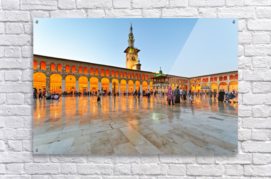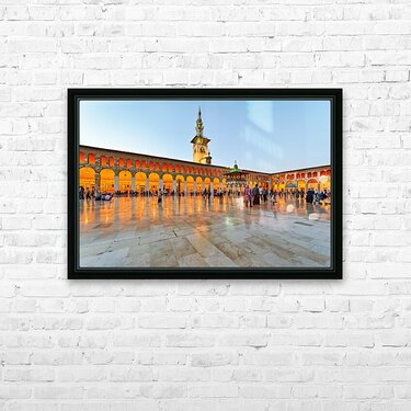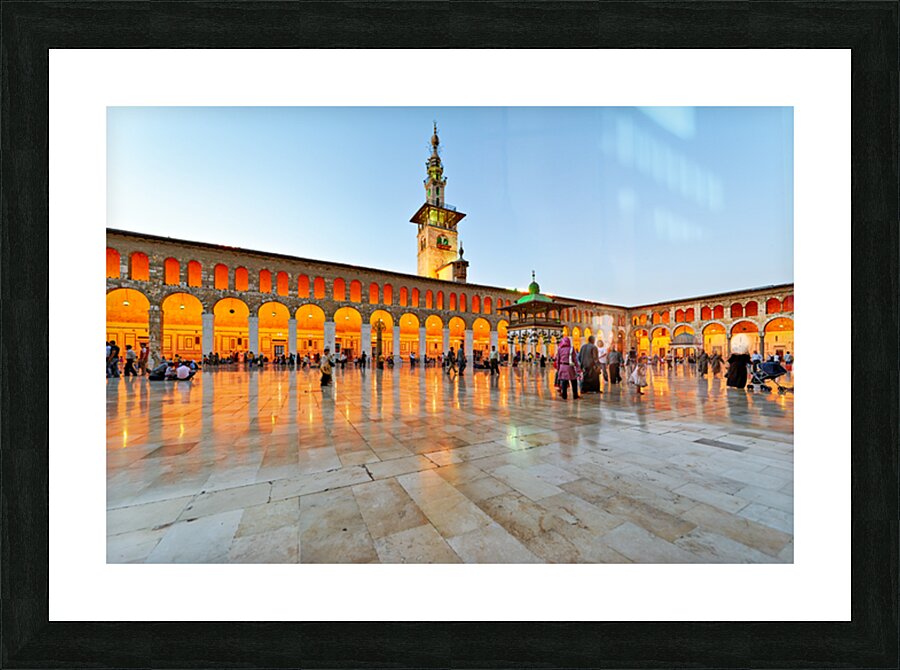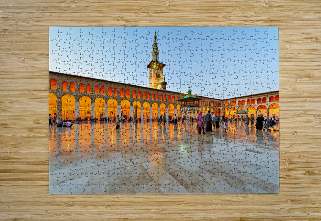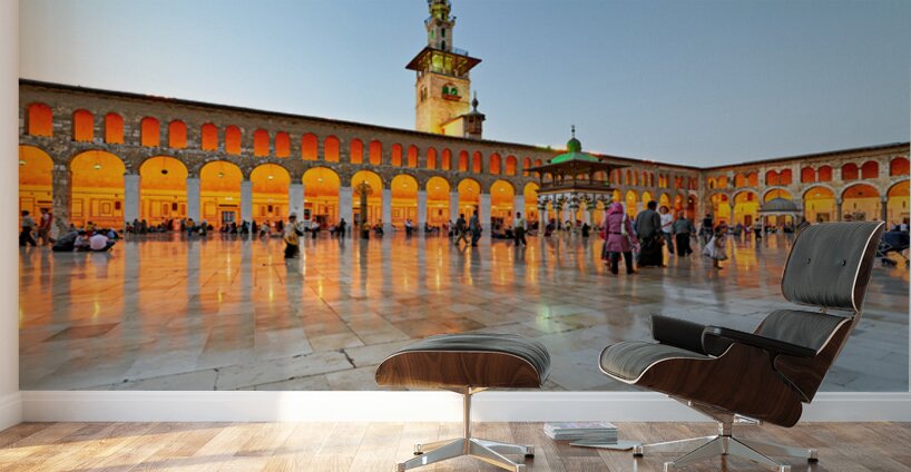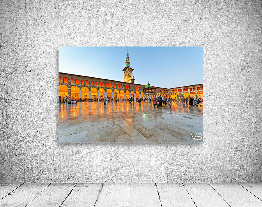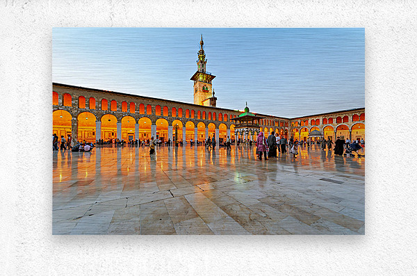 People walk and gather at the Umayyad Mosque in Damascus during the evening as the lights illuminate the area and create reflections on the ground.