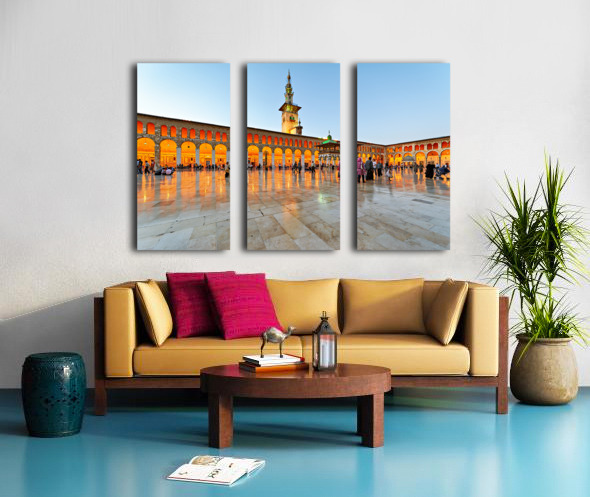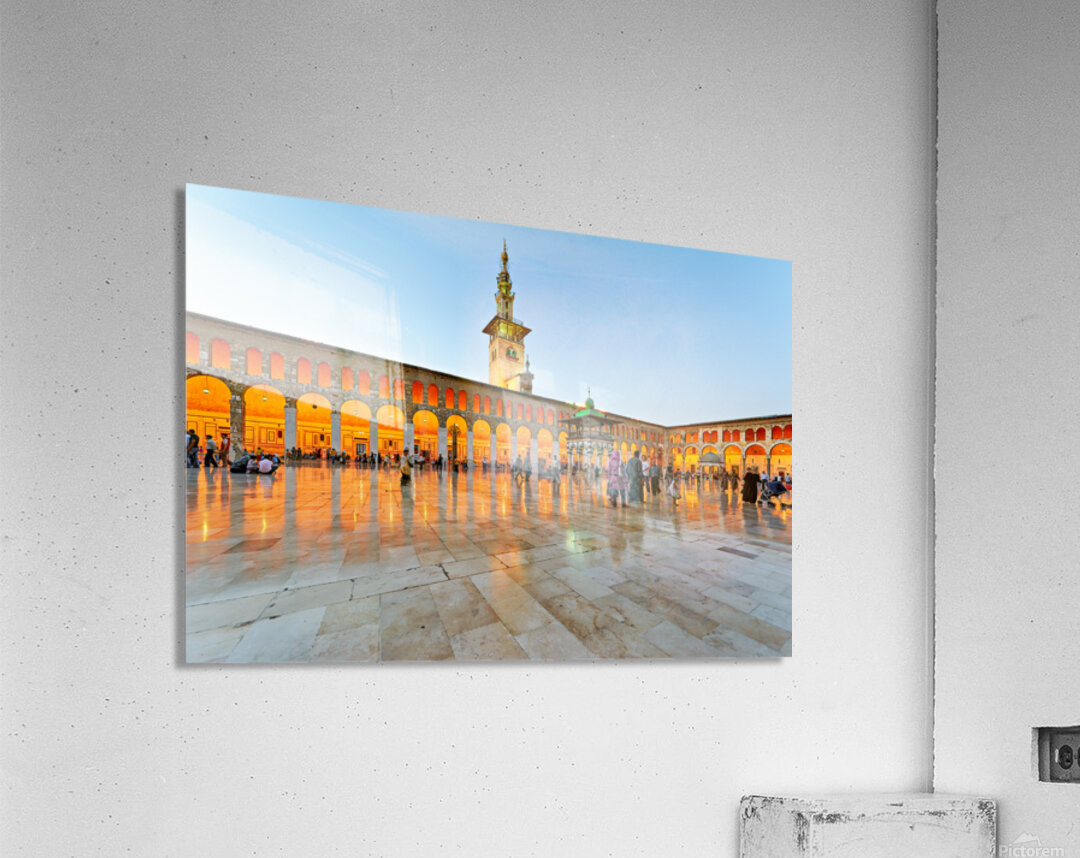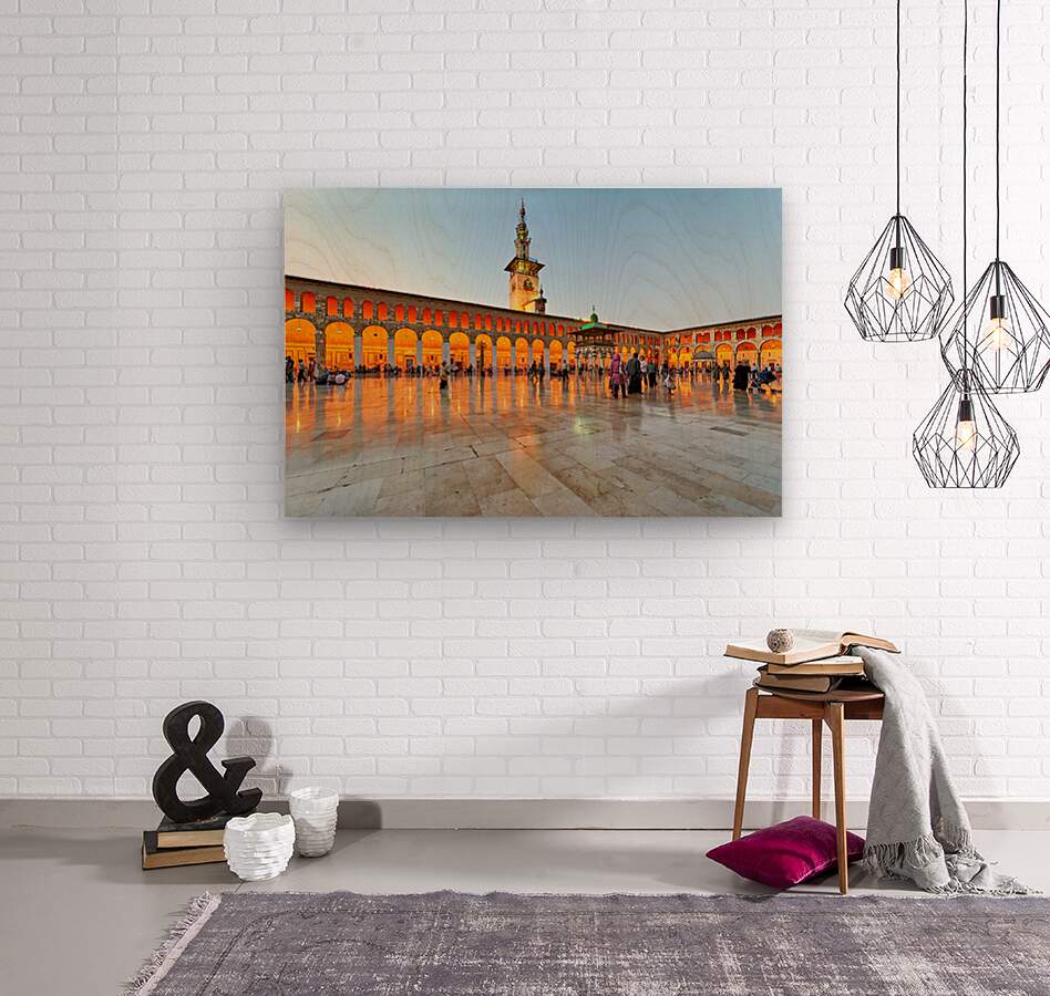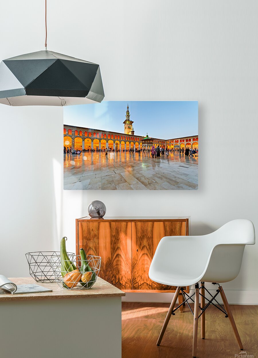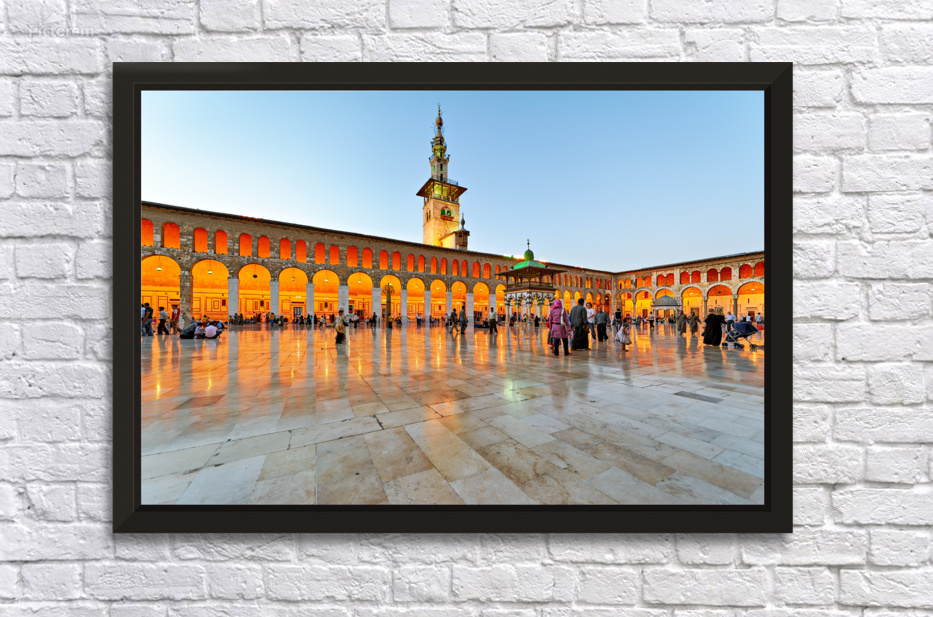People walk and gather at the Umayyad Mosque in Damascus during the evening as the lights illuminate the area and create reflections on the ground.