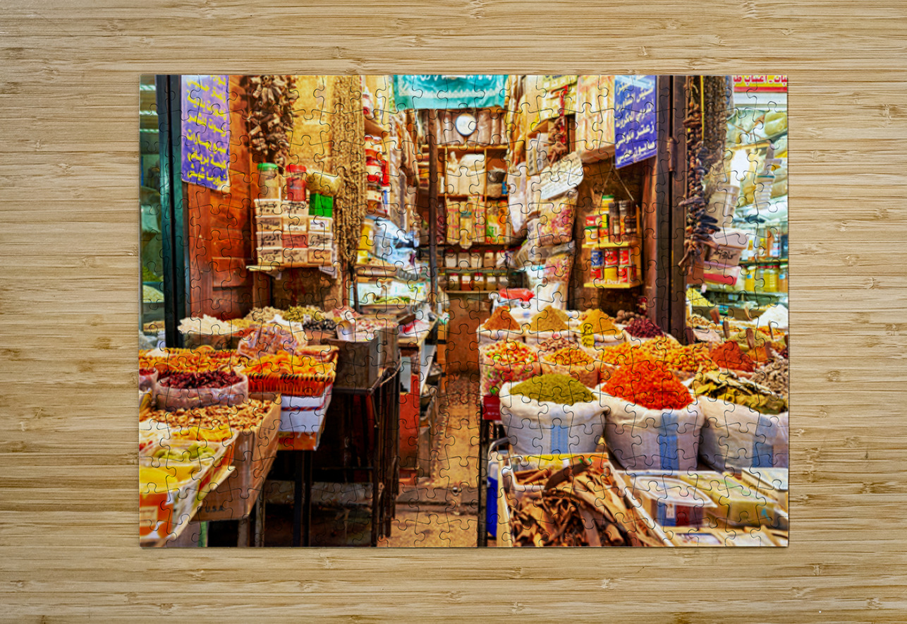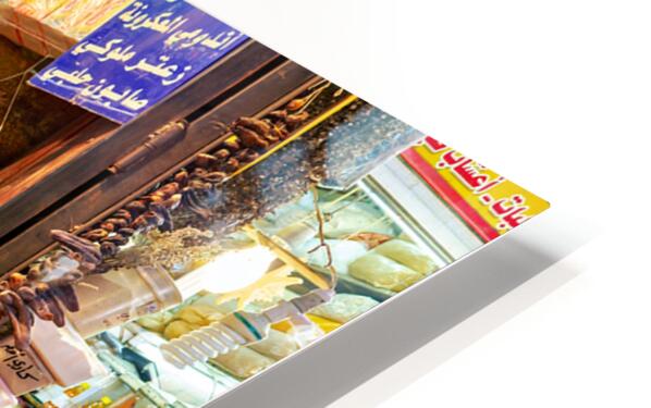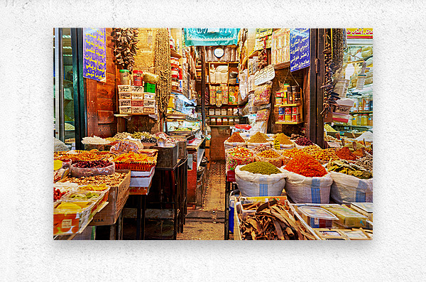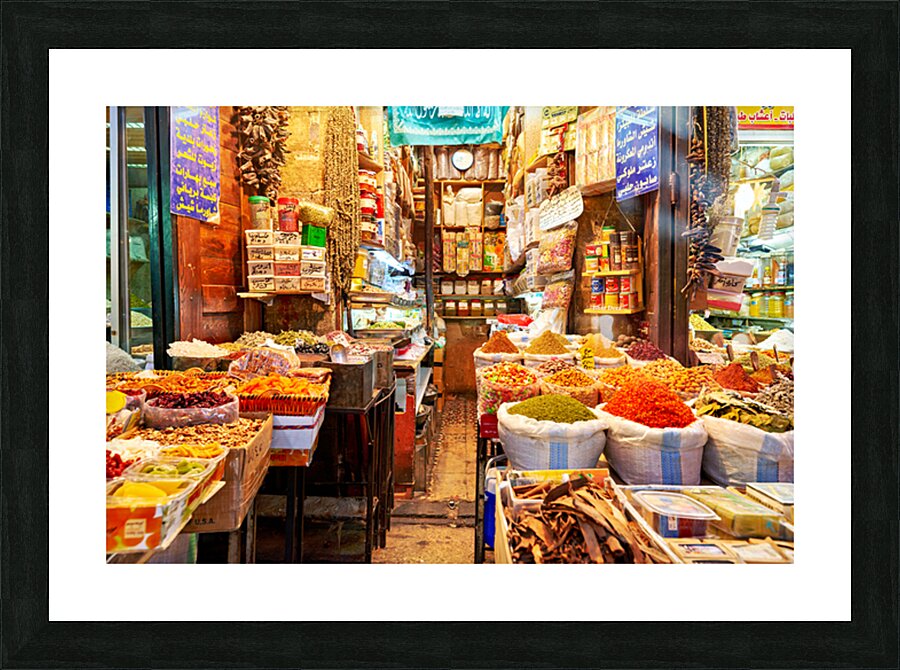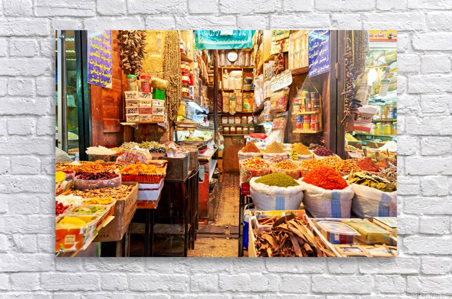 People visit Al-Hamidiyah Souq in Damascus. Stalls display spices nuts and sweets in an open market. The atmosphere is lively and bustling.