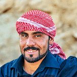 A young man stands outdoors in Syria wearing a red and white headscarf. He smiles and looks at the camera with a friendly expression.