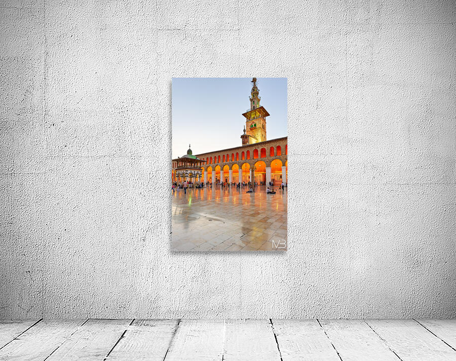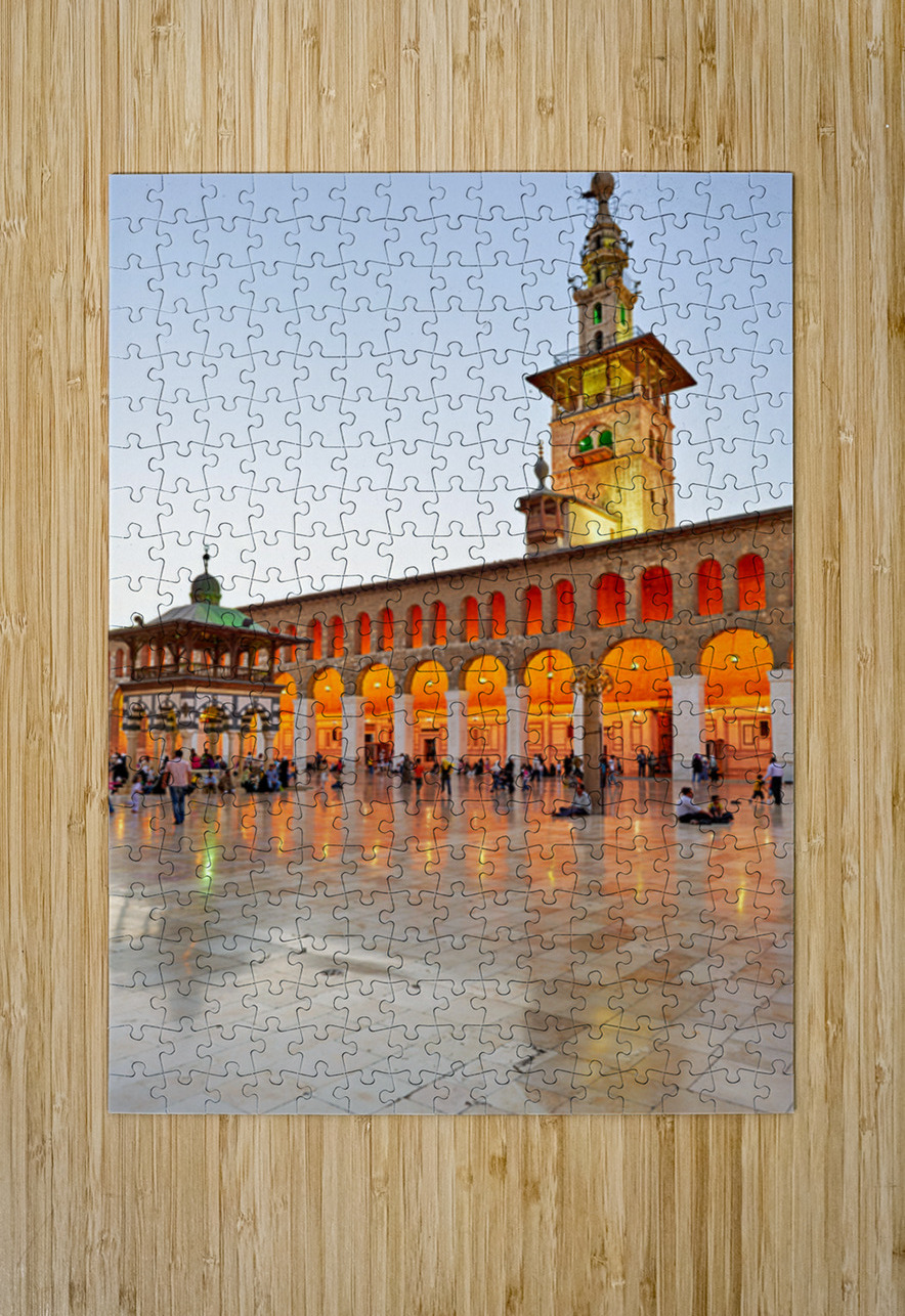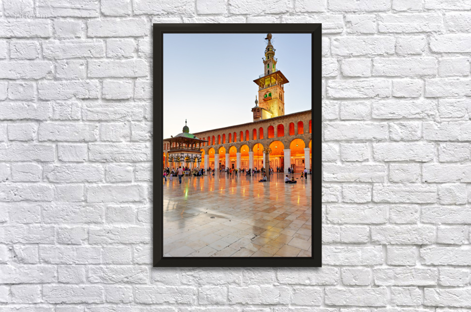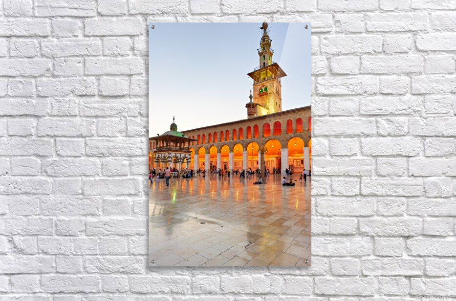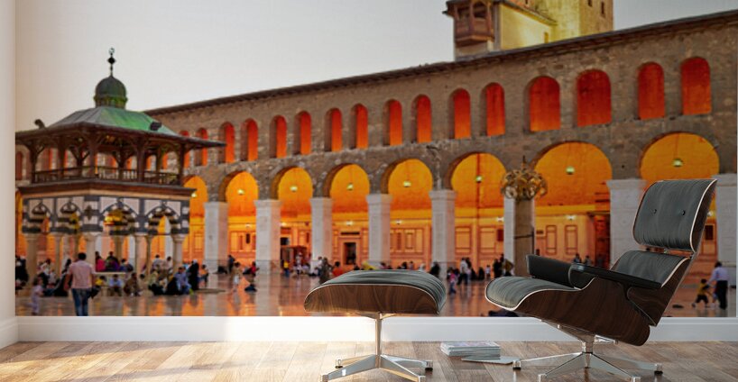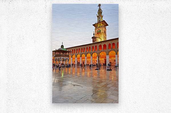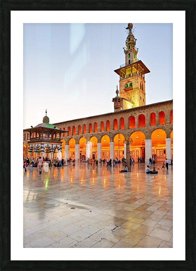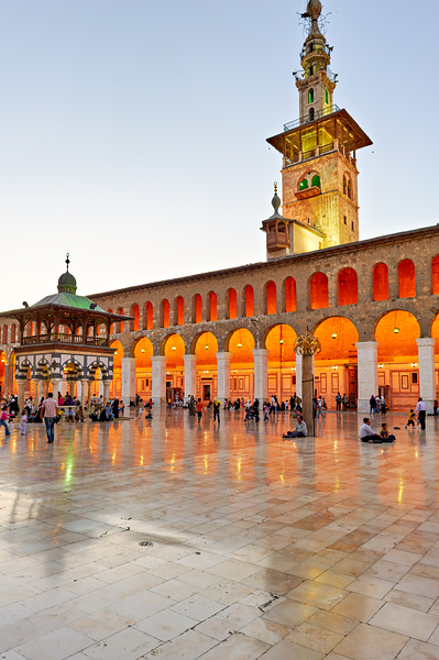 People walk and gather in the courtyard of Umayyad Mosque in Damascus at dusk. The mosque is an important site for locals and tourists.