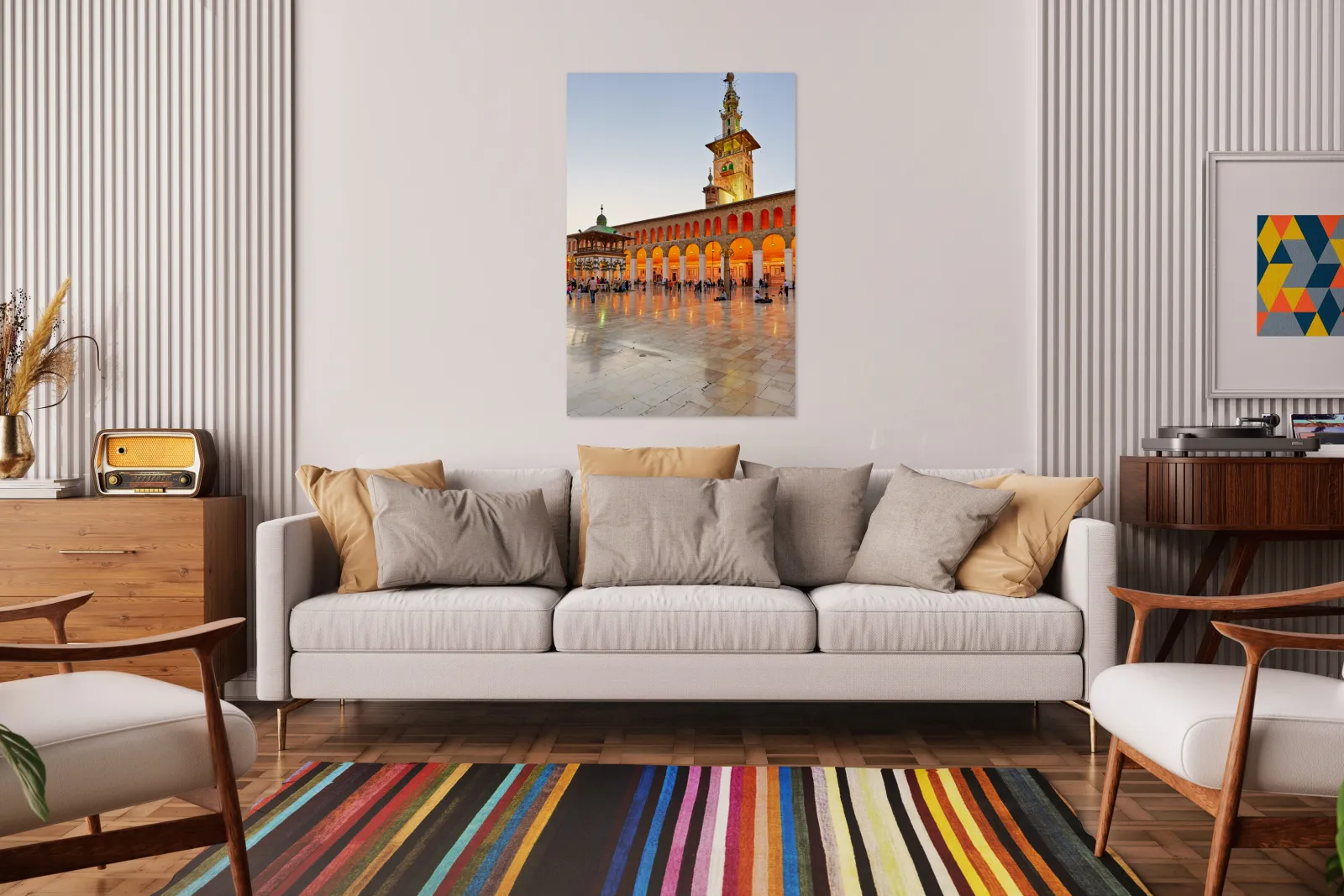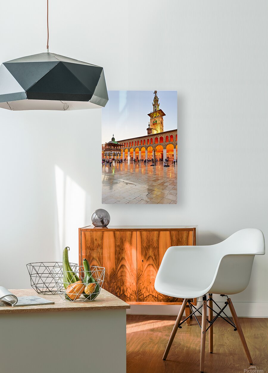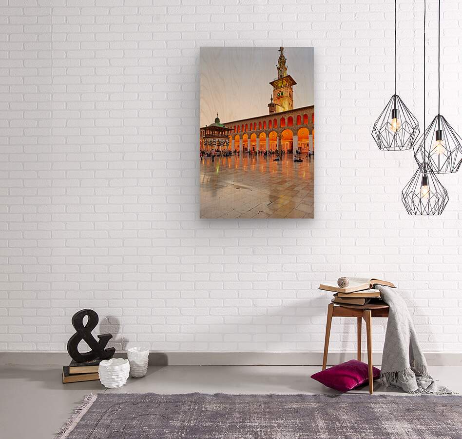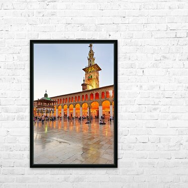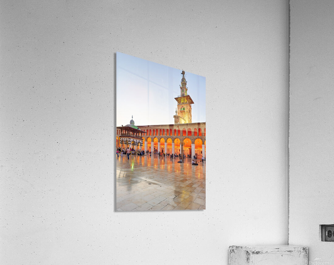 People walk and gather in the courtyard of Umayyad Mosque in Damascus at dusk. The mosque is an important site for locals and tourists.