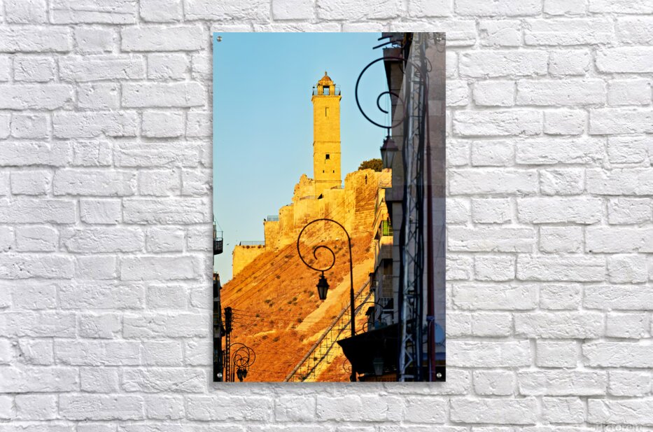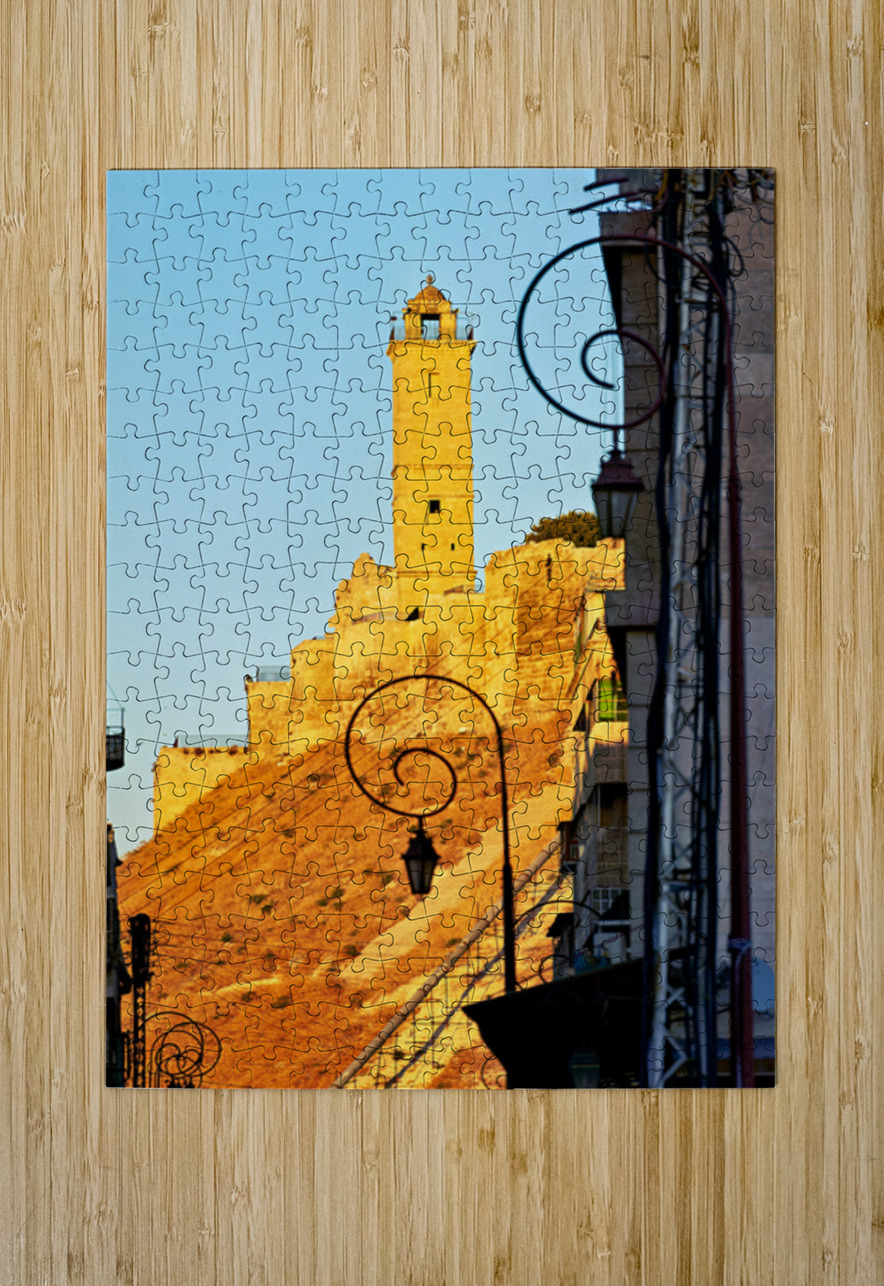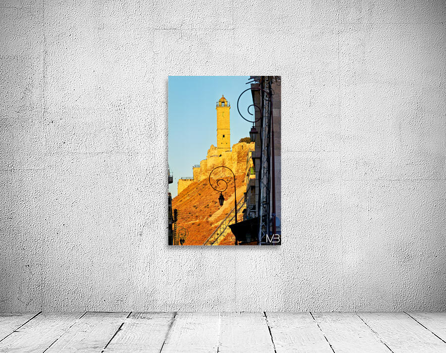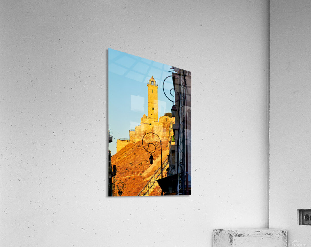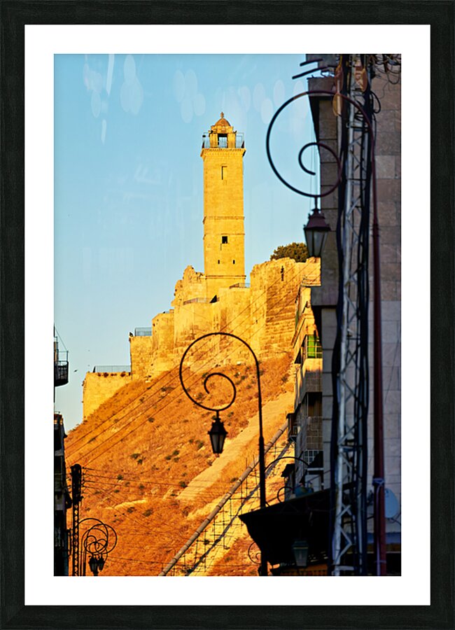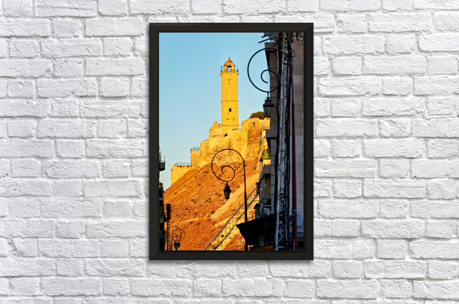 "View of Aleppo Citadel from downtown at sunset" in a framed print.
