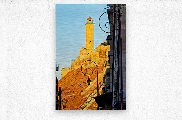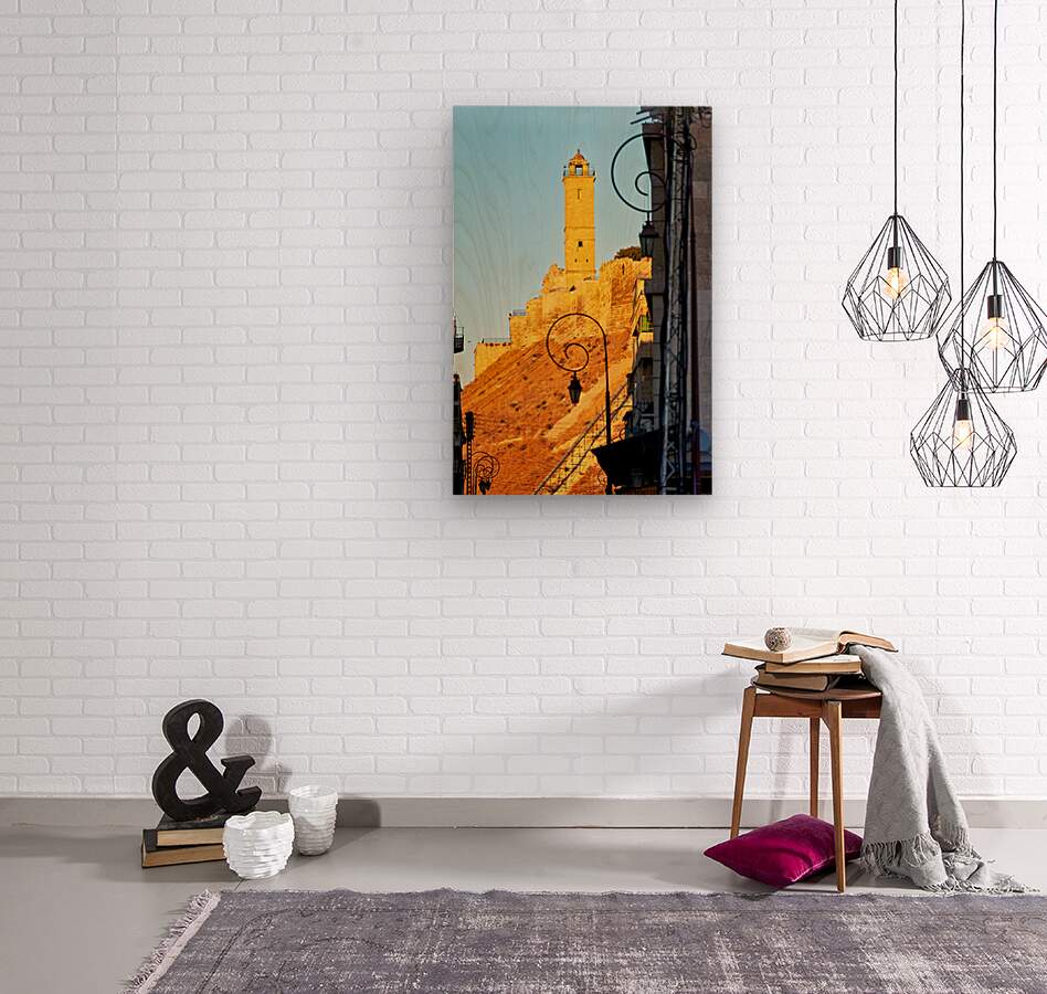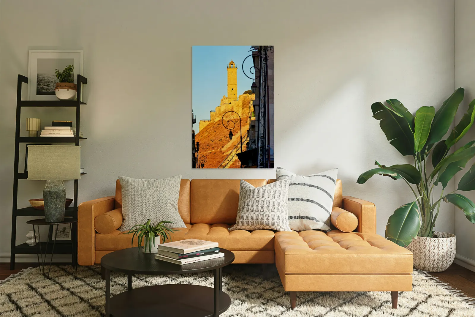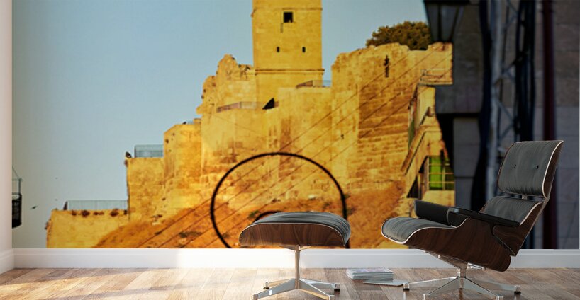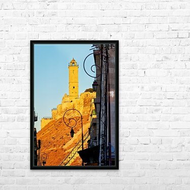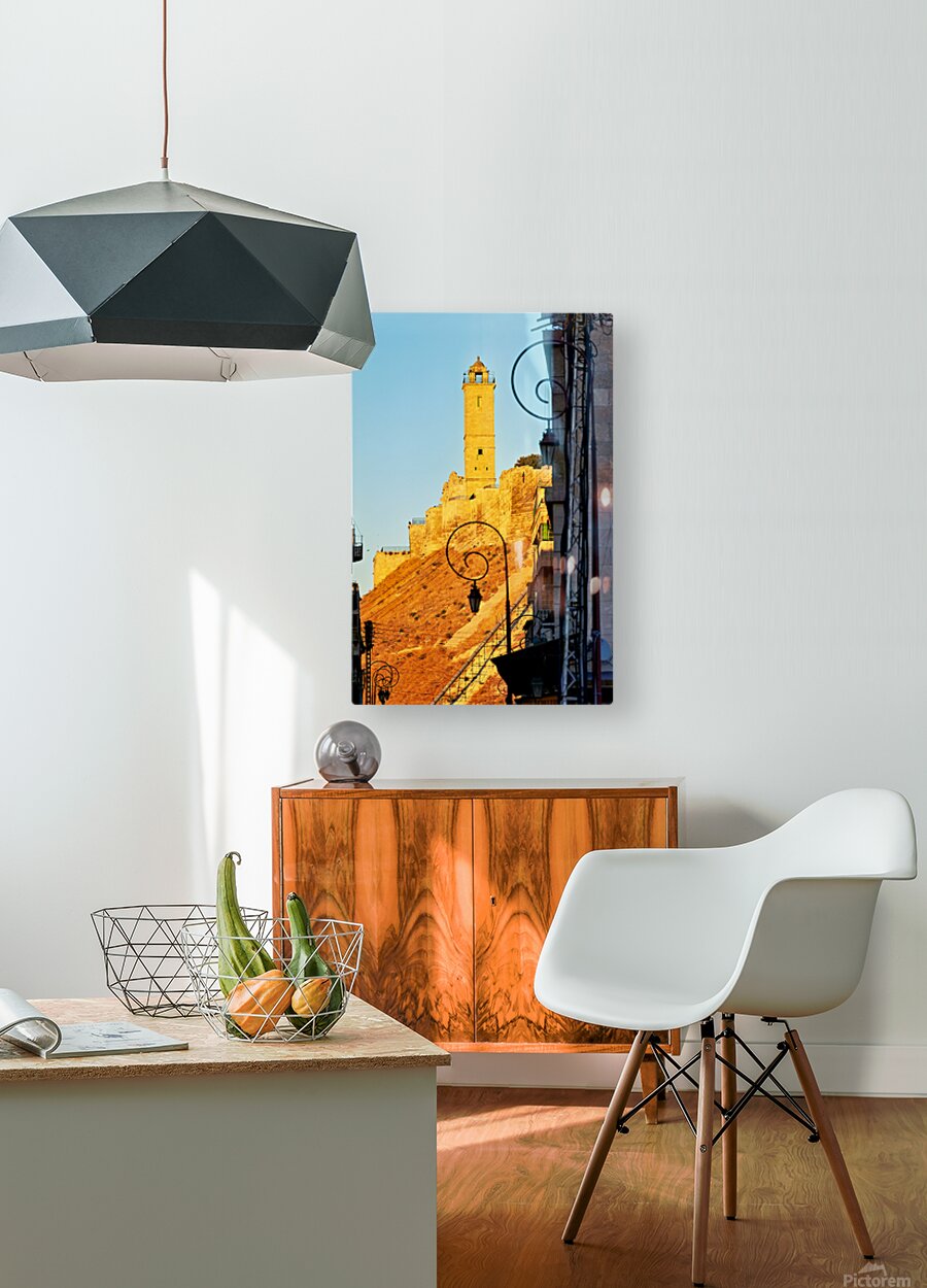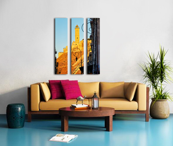 "View of Aleppo Citadel from downtown at sunset" in a framed print.