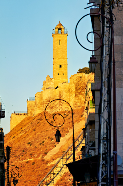 The citadel of Aleppo stands tall above the city captured during sunset. Streets below show urban life and structures.