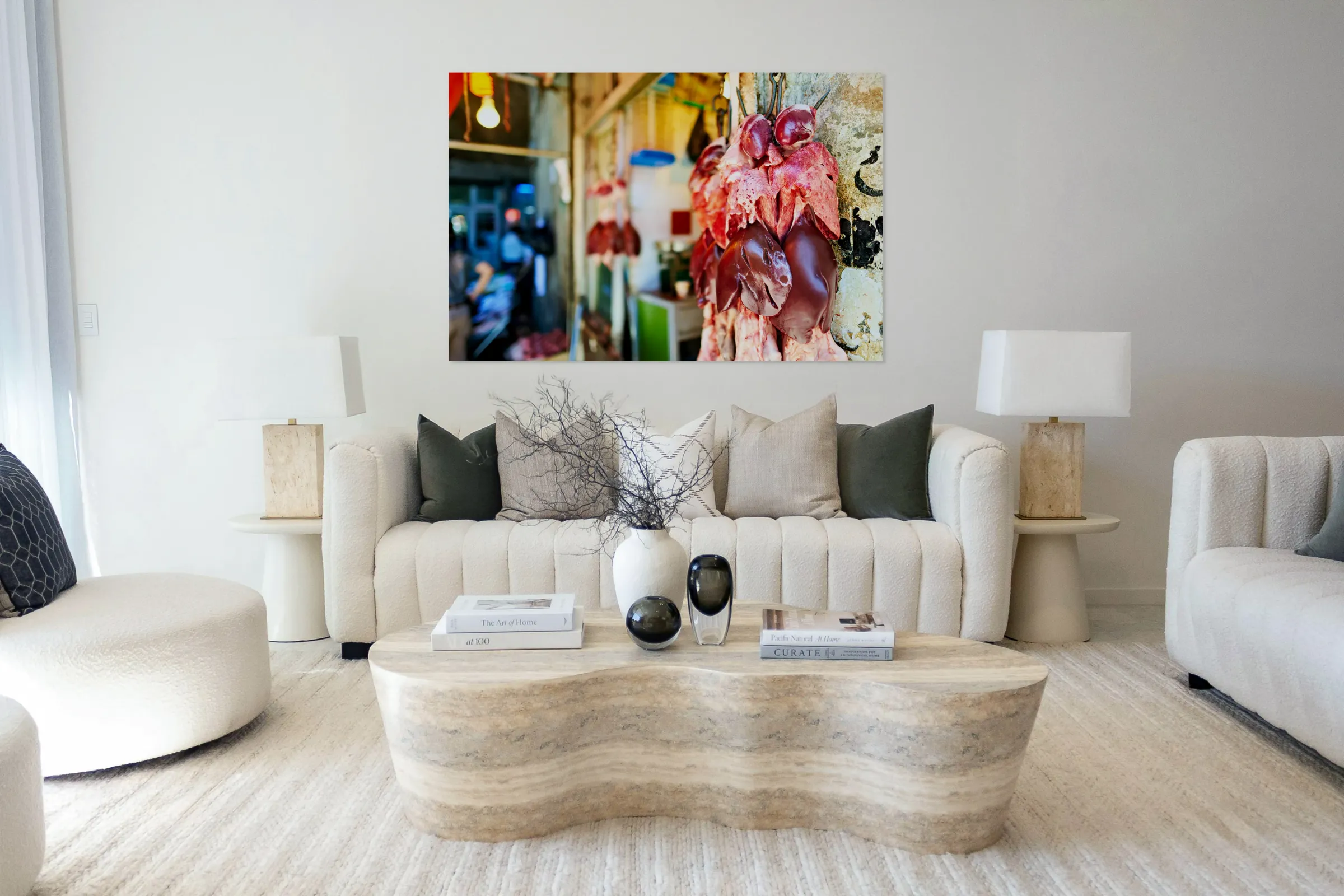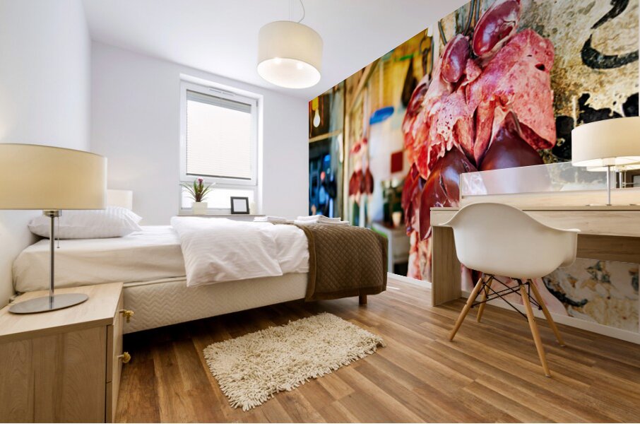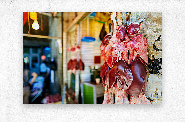 ABOUT THIS ARTWORK: BUTCHER DISPLAYS MEAT AT SOUQ IN ALEPPO SYRIA DURING THE DAY