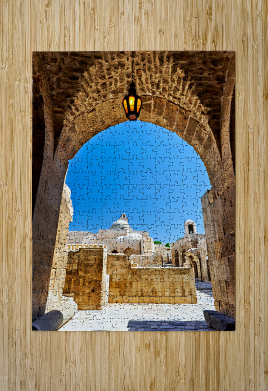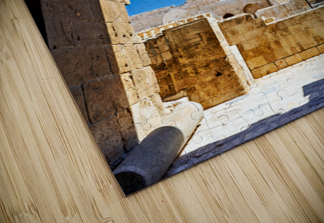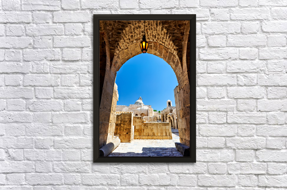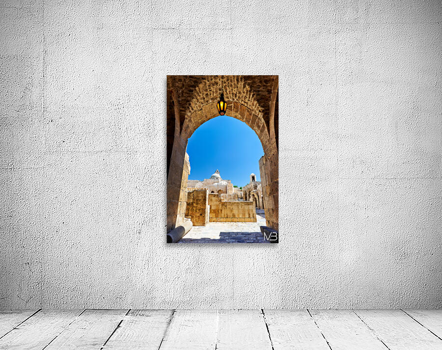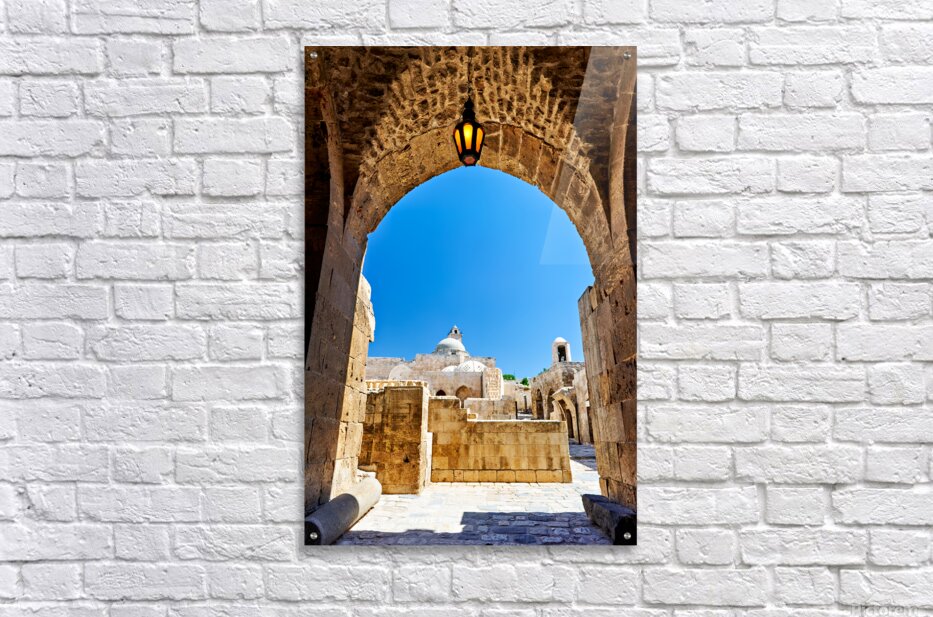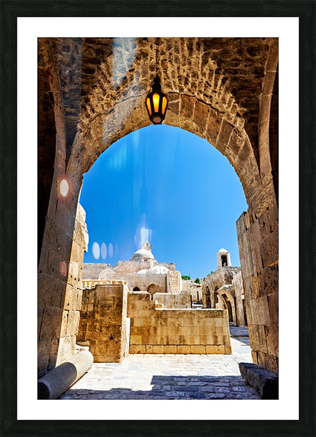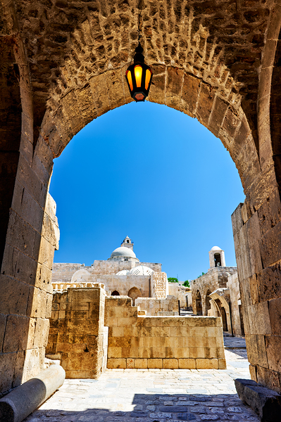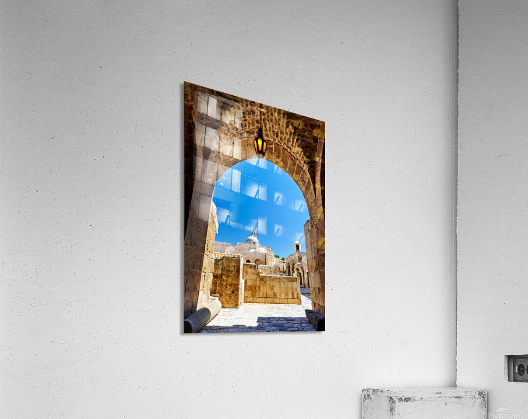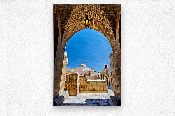The view through an archway at the Aleppo Citadel. The blue sky and stone structures are visible.